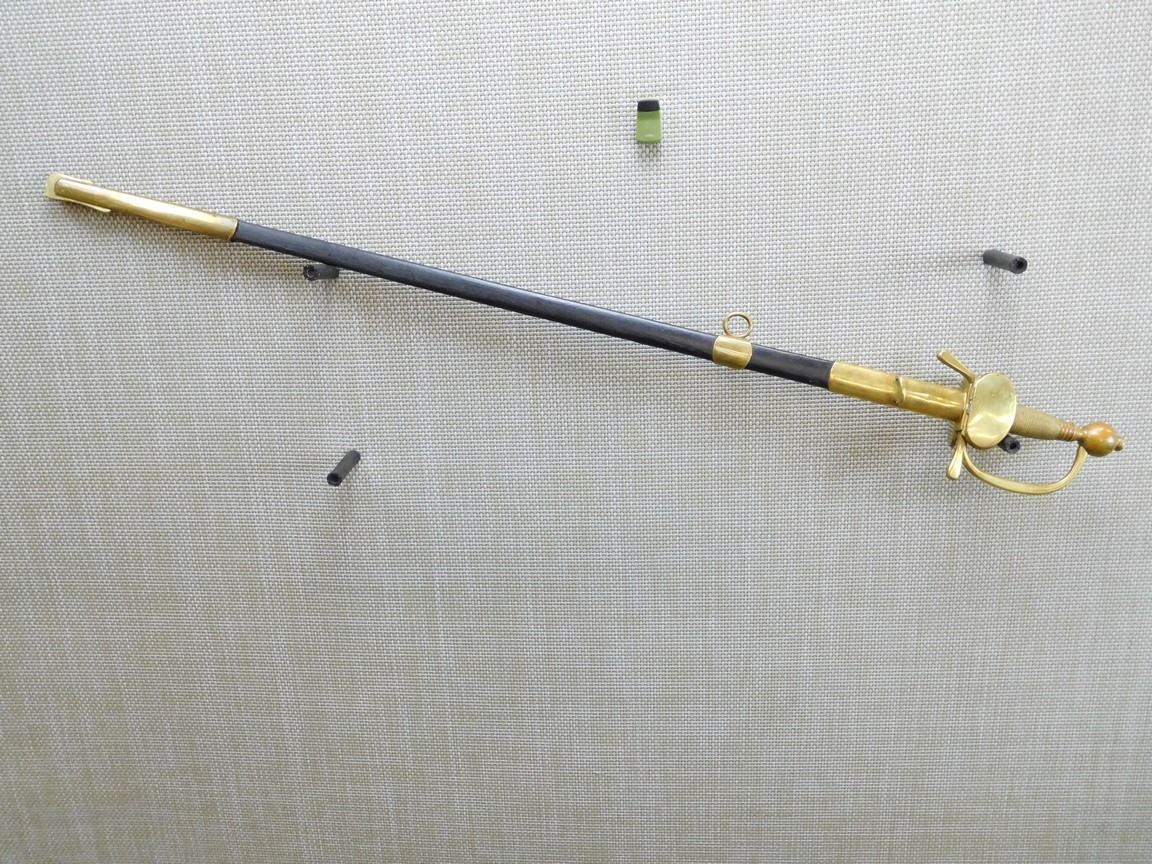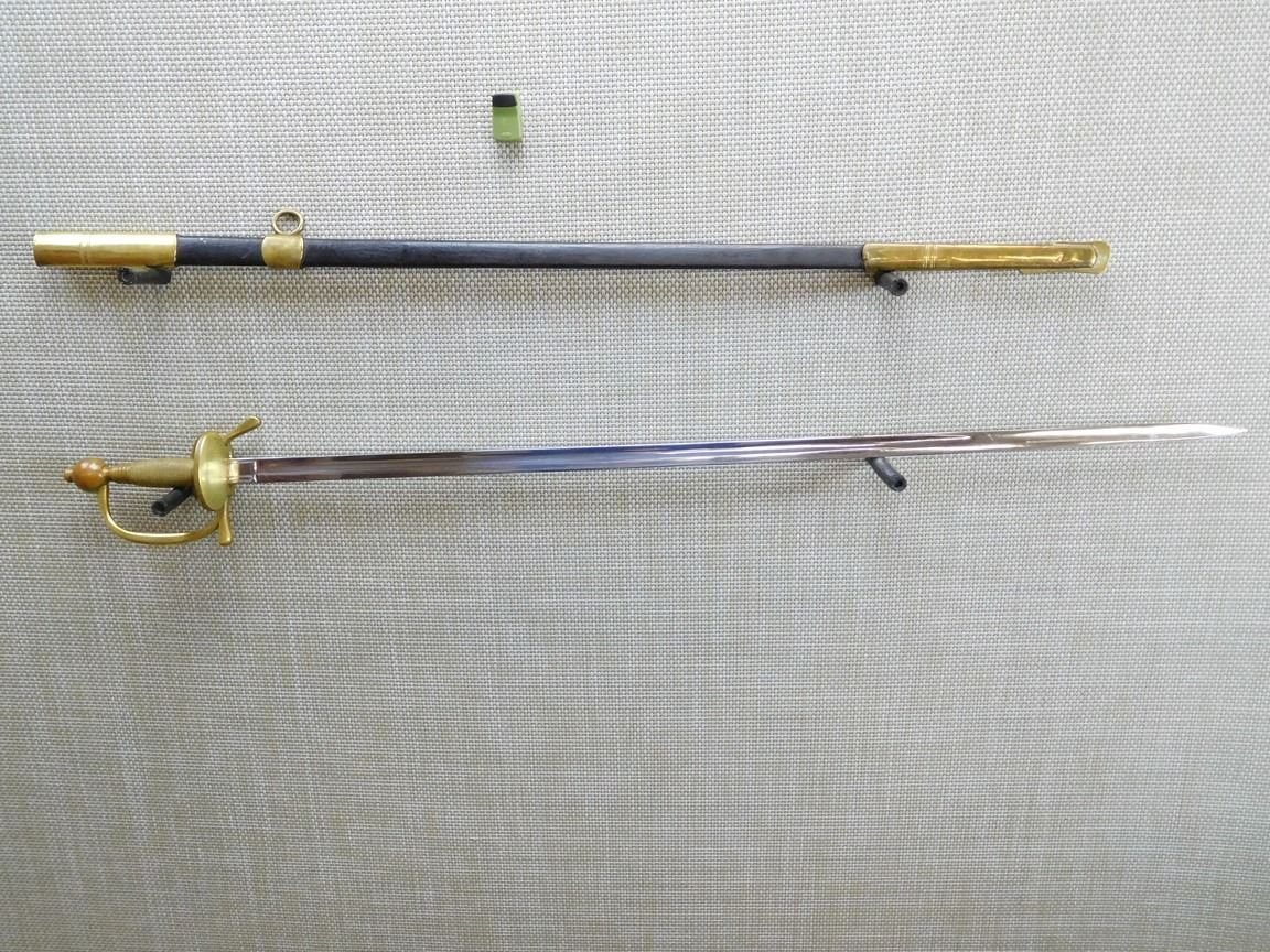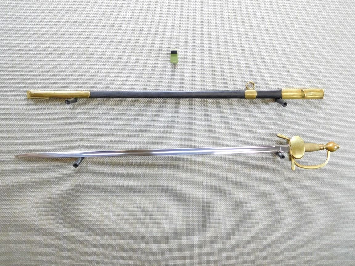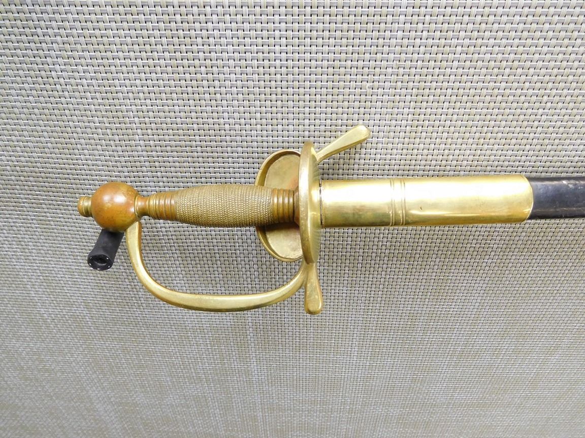 THIS SWORD HAS A 33" BROAD FULLERED BLADE IN EXCELLENT CONDITION. NO MAKER MARKS ON THE BLADE, GILT BRASS HILT OF HEAVY FIGHTING FORM WITH RAISED THICKENED EDGE OVAL SHELL GUARDS, ANGLED CROSS GUARD AND FACETED KNUCKLE BOW. VASE SHAPED POMMET WITH LARGE BUTTON, THE LEFT SHELL IS HINGED TO ALLOW FOR WEARING A BELT