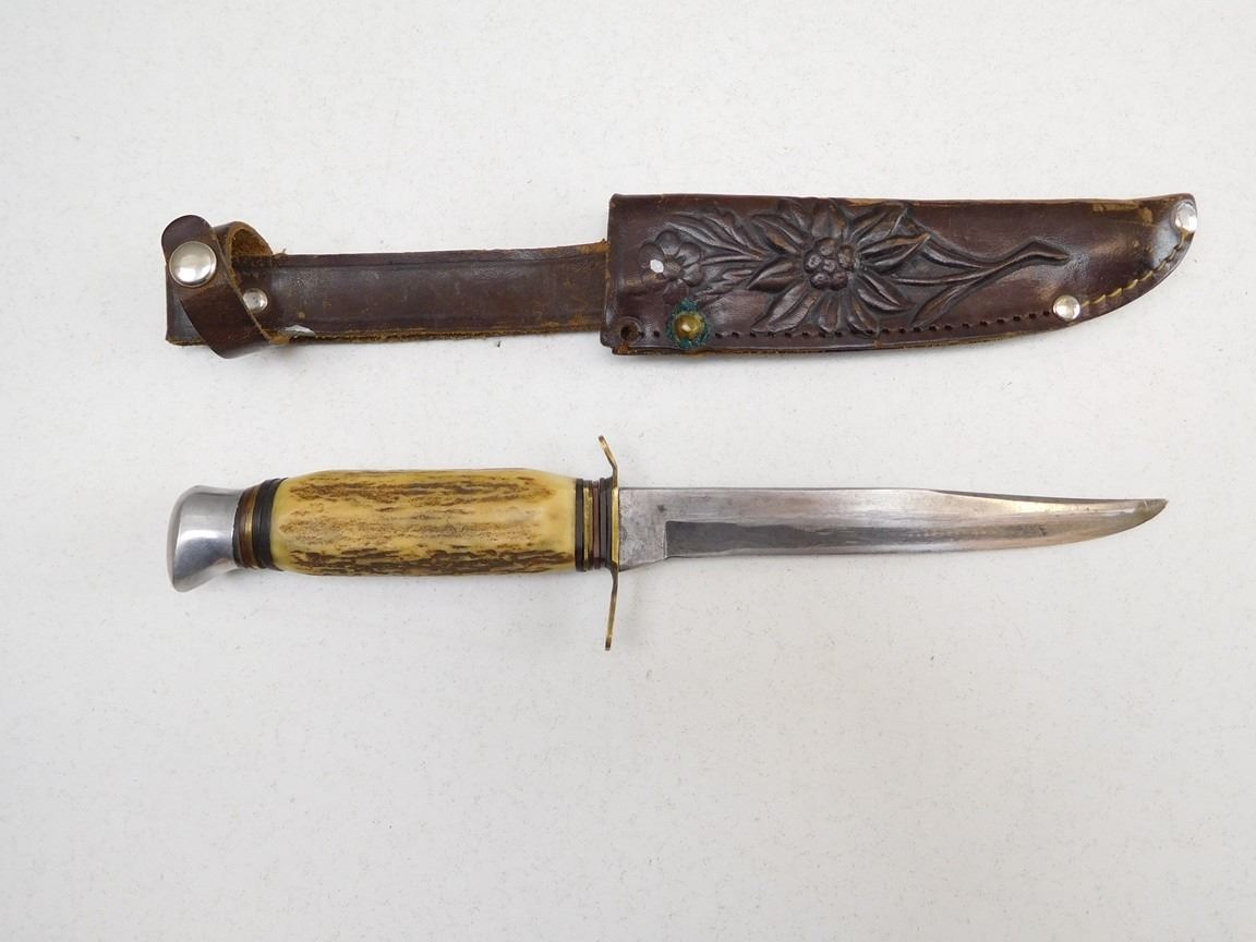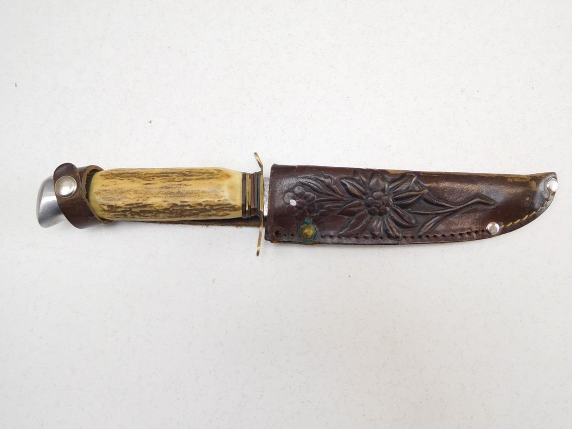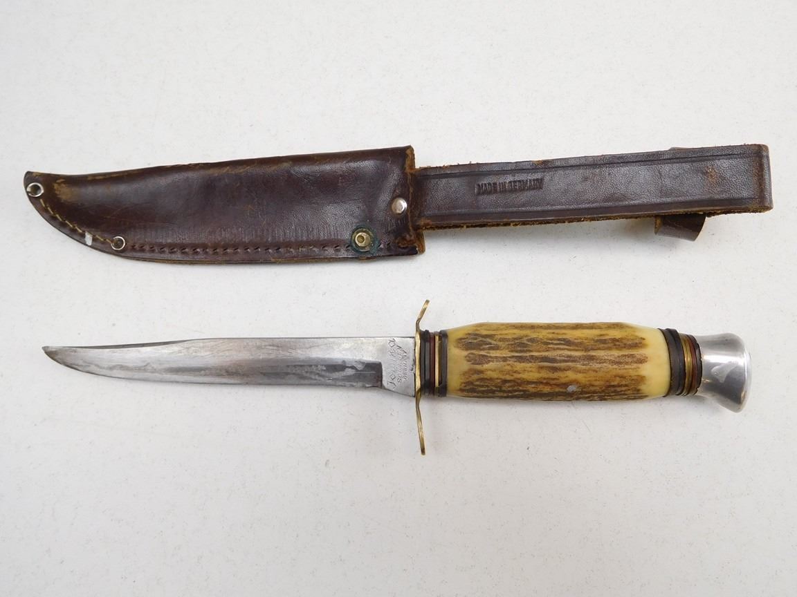 Lot 954 JOWIKA STAG HANDLE FIXED BALDE KNIFE AND LEATHER SHEATH