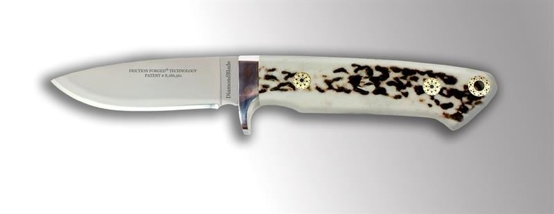 The knife is a tapered hunting full tang hunting knife with 3 mosaic pins and a lanyard hole. Handmade with friction forged D2 steel. The overall length is 8”x 3 ¼” blade with a natural stag handle. It is a drop point blade style with a 44oz stainless bolster with NP3 anti-corrosion treatment. Includes Kydex-lined, oiled split grained cowhide sheath. Diamond Blade Knives retain the sharpest edge due to their patented fabrication process. w w w .diamondbladeknives.com Priceless