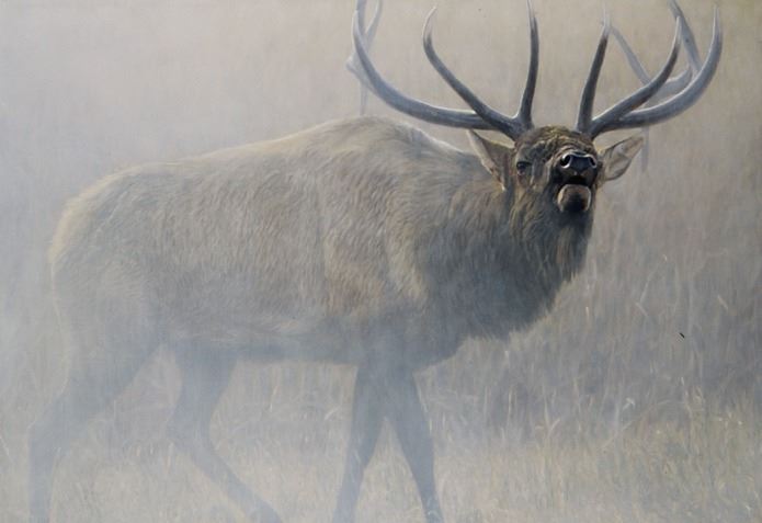 “In Yellowstone September brings beautiful colors and cool crisp mornings, but what seems to be the most impressive is the bugling sound of bull elk. At times, the whole forest seems to become alive with the echoes of this magnificent beast. I’m always amazed that for such a large animal they are so silent and sometimes they seem to just appear out of thin air. I wanted to create the feeling that this magnificent bull was emerging from a foggy marsh and stepping right out of the canvas. I enjoy painting large, powerful animals as if they are too big for the canvas. It gives the impression they are coming off the wall.”- John Banovich