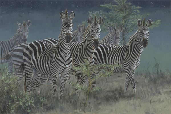 You are bidding on a 24x36 inch unframed, canvas print. Linda’s painting Stars and Stripes Forever is this year’s Featured Artist of the Year painting. It was one of her African trips which inspired the piece. When she saw the Selous sub-species of the Plains Zebra in Tanzania, their stunning head-to-hoof stripes captivated her. Linda decided a night scene would create the most interesting drama for this iconic African species. And while they cannot see in the dark, she envisioned the zebras’ rapt attention could only mean they heard something. Maybe the soft pad of a slowly moving paw somewhere in the grass? The SCI Artist of the Year program, started in 2008 honors an exceptional wildlife artist dedicated to both SCI and conservation.