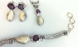 Sterling Silver Elk Ivory and Amethyst Bracelet, Pendant & Earrings from Studio Pandora. Value $1200