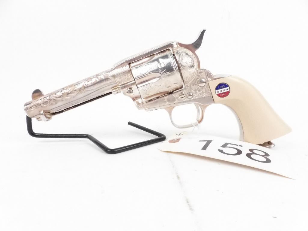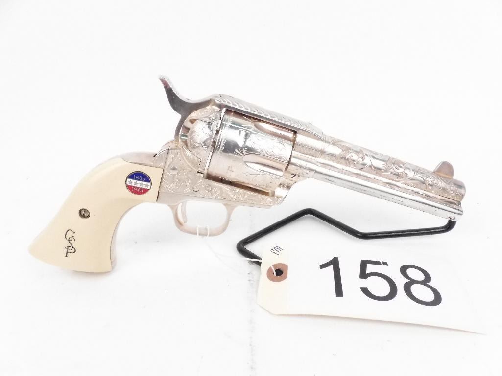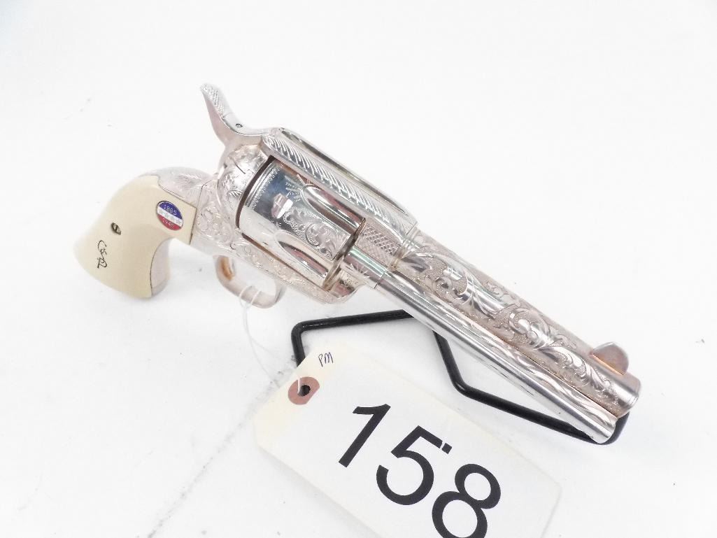 Heavily engraved Faux ivory grips Appears unfired Silver plated Make: Uberti Condition: Excellent Barrel Length: 4 5/8 Model: SAA Caliber: 45 long Colt Serial #: P1350