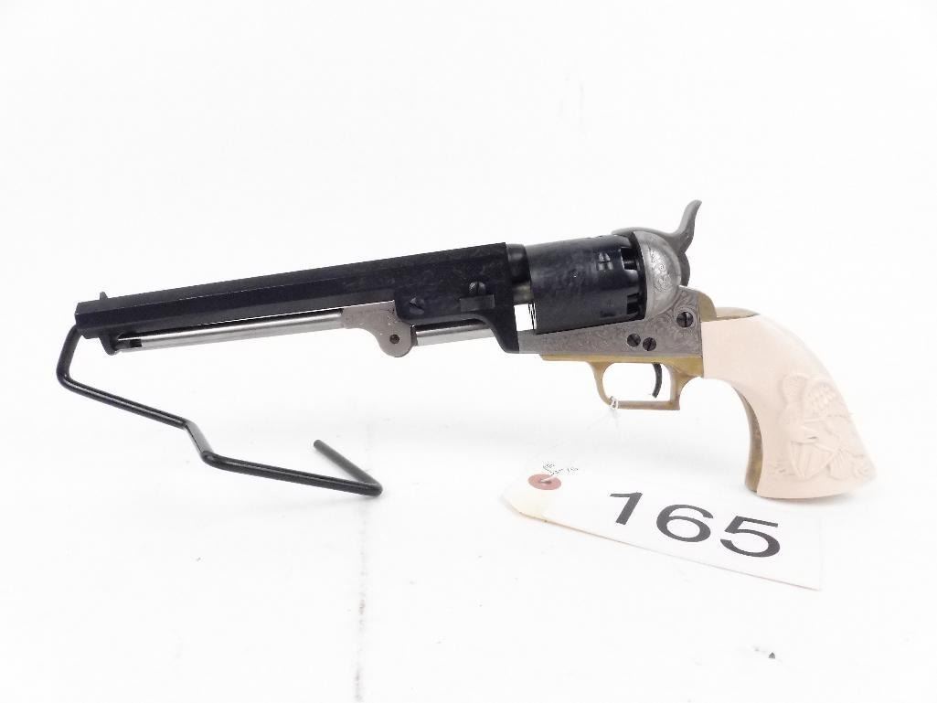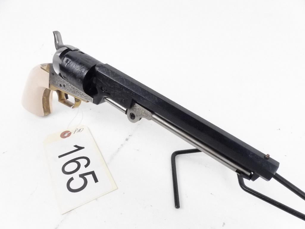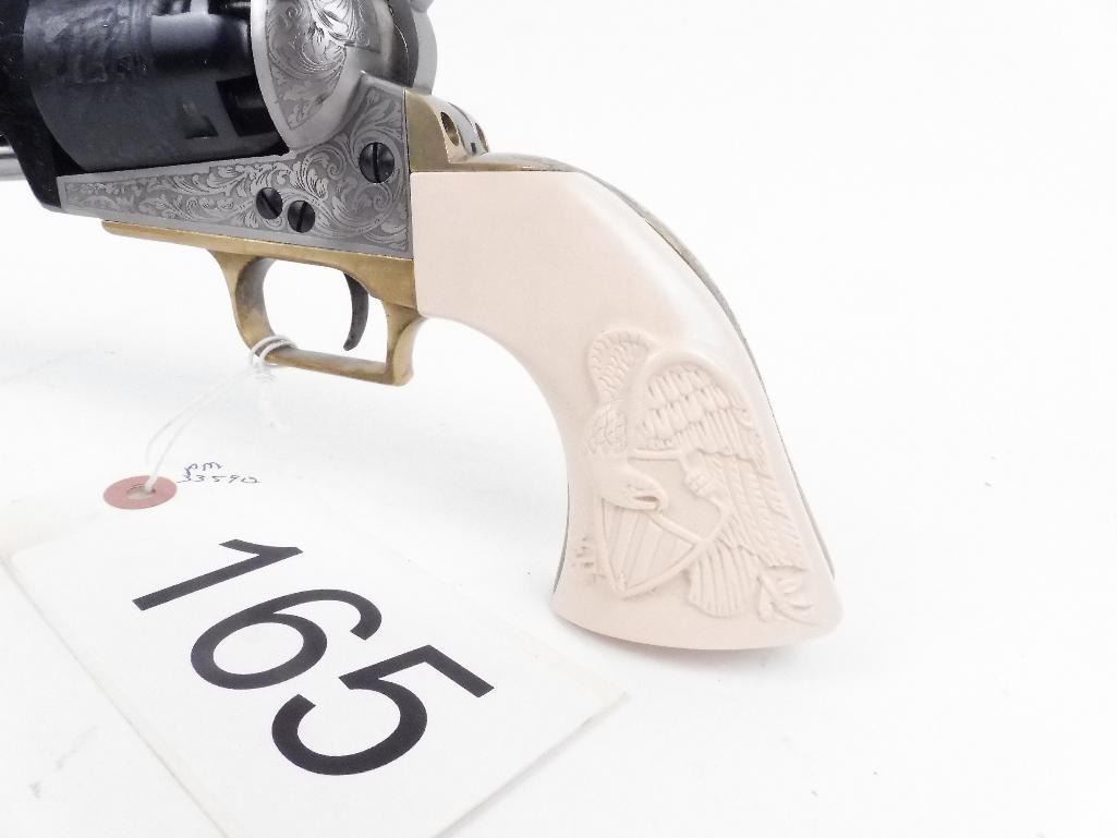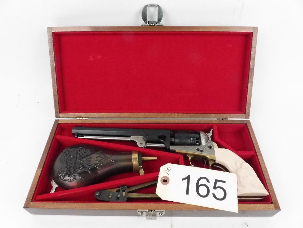 In amazing condition Presentation box, (some slight finish scratches) Small brass tarnish on the front of the trigger guard Unfired Powder flask Bullet mold Make: Uberti Condition: Excellent Barrel Length: 7 1/2" Model: Armi San Marco Caliber: 36 Serial # - Firearms: 33591