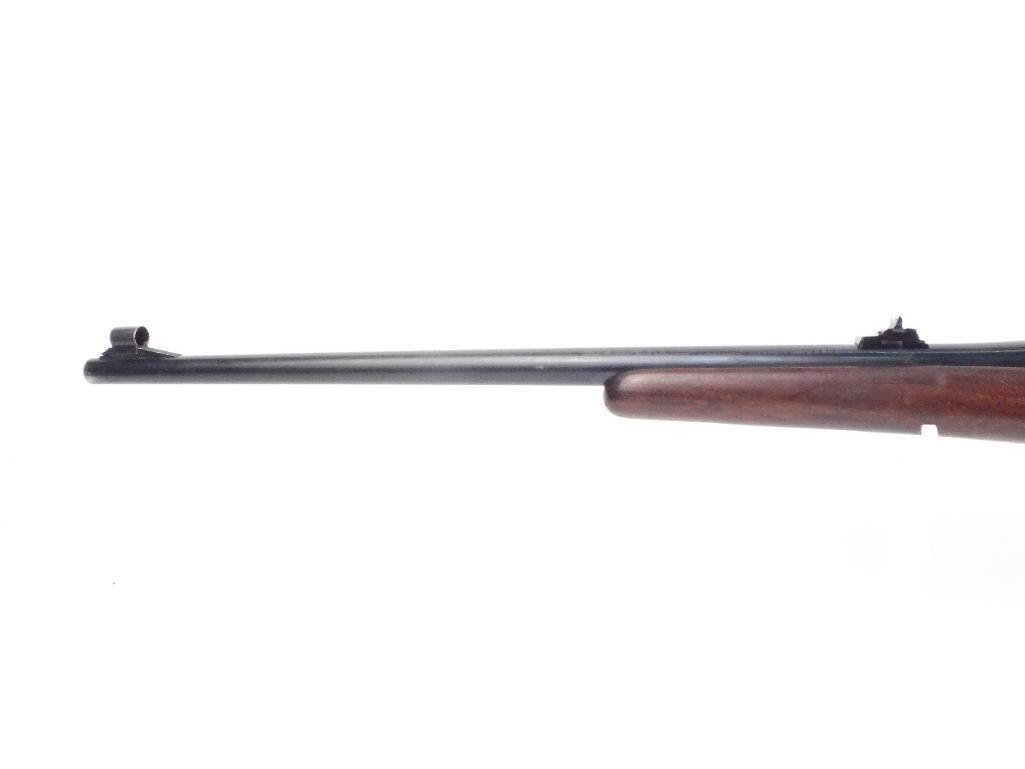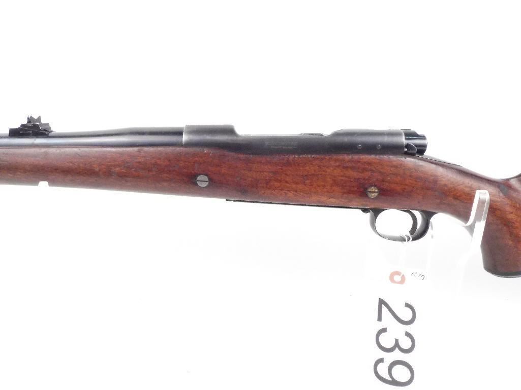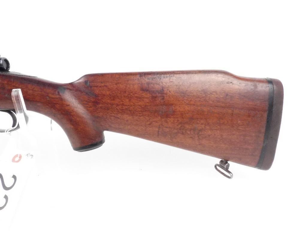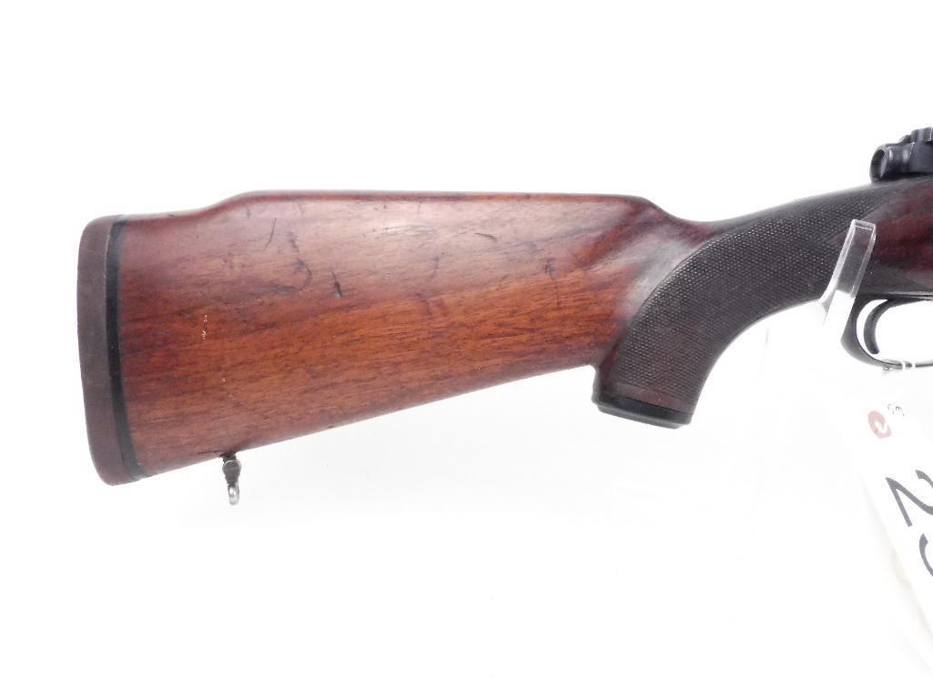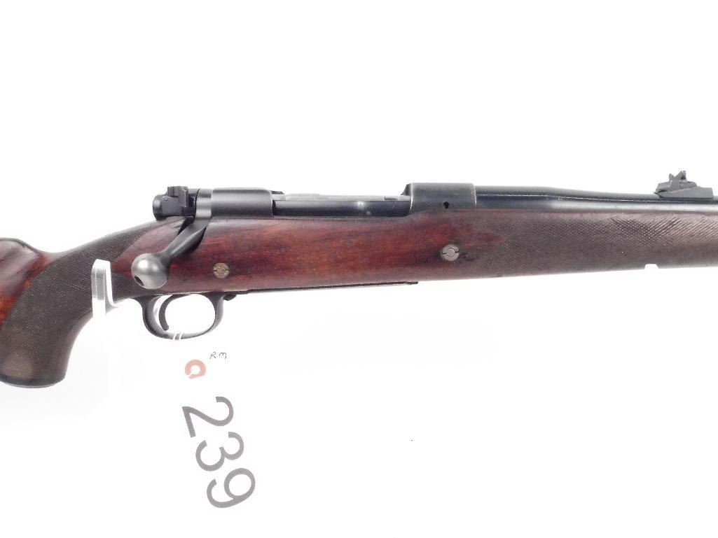 Older model (1941) M 70 Controlled round feed Very smooth action Follower is milled Stock has a tiny crack forming at the top of the stock Appears that the checkering has been removed on the left side fore-end and pistol grip Stock could use refinishing Checkering has been flattened due to much carrying No visible rust and no marks on the metal Make: Winchester Condition: Very Good Year: 1941 Barrel Length: 25" Model: 70 Caliber: 375 Holland and Holland Magnum Serial # - Firearms: 431099