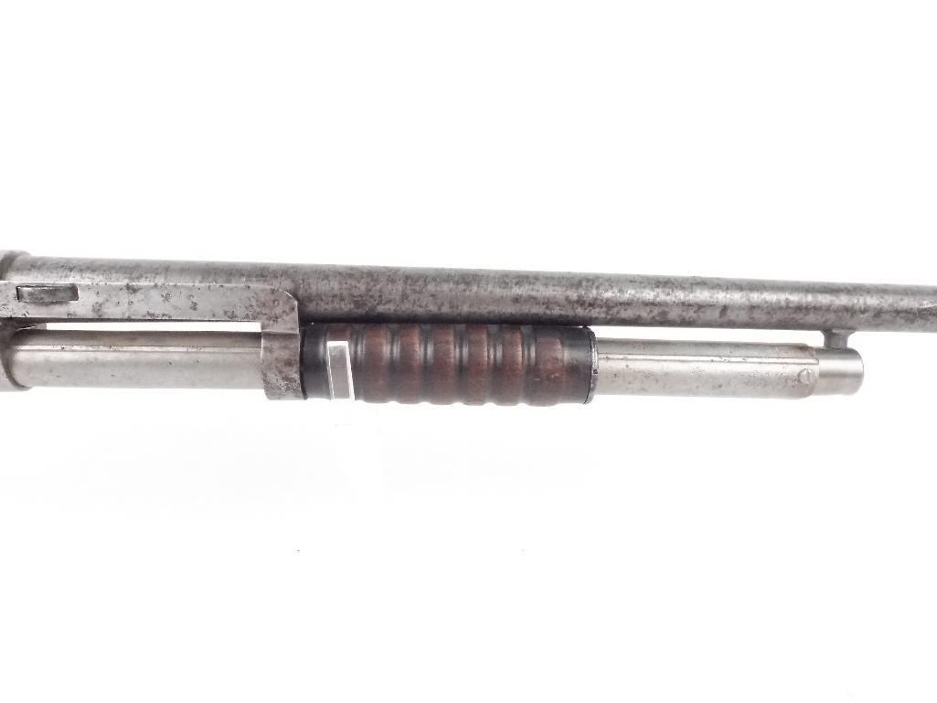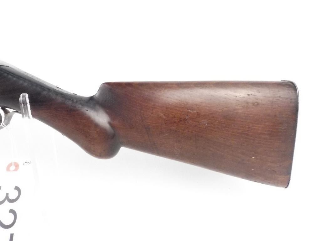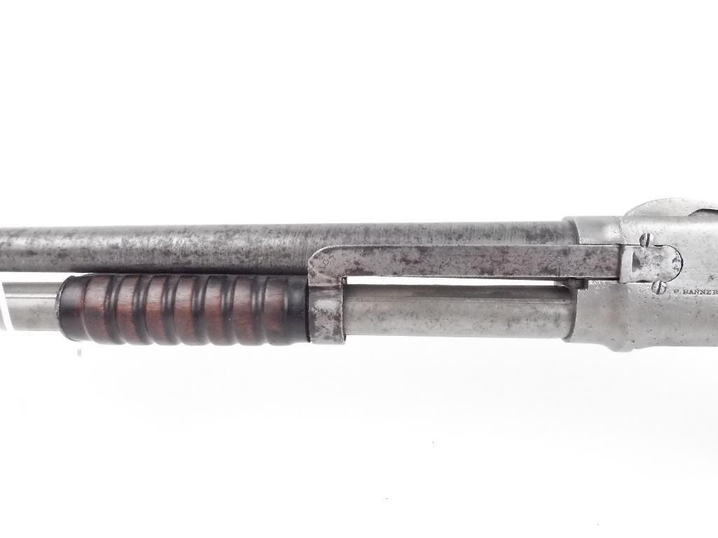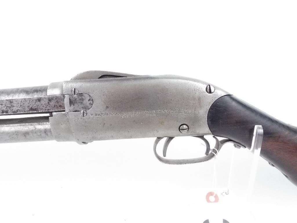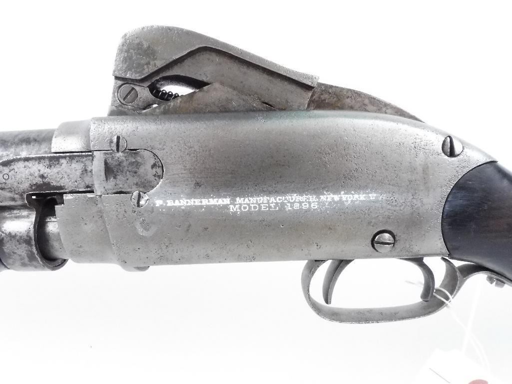 DO NO ATTEMPT TO FIRE Very unique action Fully operational Hammer reset lever in the trigger guard F. Bannerman stamped on receiver Damascus barrel Small incomplete crack on butt-stock behind tang Small incomplete crack on top of the heel Shotgun Gauge: 12 Gauge Condition: Good Barrel Length: 30" Model: 1896 Serial #: 16335