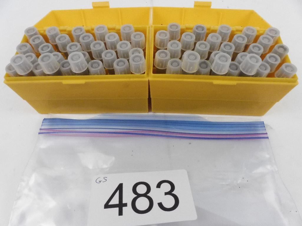 Lot 483 Approx 60 muzzle loader vials in 2 yellow boxes