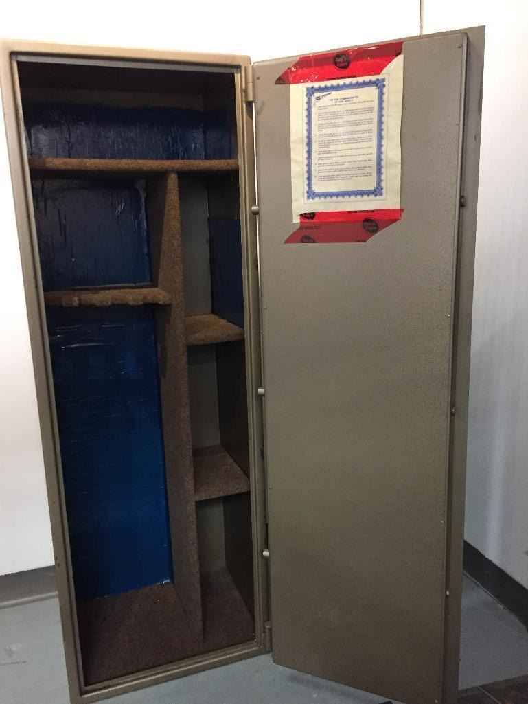 PICK UP ONLY. WEIGHT ABOUT 250 LBS. Outside dimensions 16" deep 20" wide 57" high 11 long gun slots Top shelf 3 side shelves Skeleton key