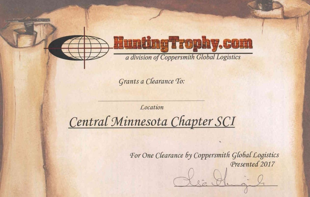 HuntingTrophy.com has been importing hunting trophies since 1995. They have a very experienced and knowledgeable team of experts who are waiting to help you get your trophies through customs and answer any of you questions. This certificate grants the winning bidder one trophy clearance.Central MN SCI thanks HuntingTrophy.com for this 100% donation!Phone : 847-4337-1500 ext 246