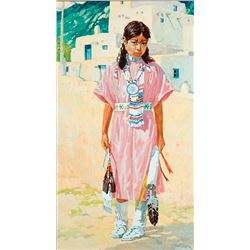 Stefan’s trademark wide strokes and bright palette always impart a good deal of movement to his paintings, and this is readily apparent in Carlita. The folds of her pink dress are almost translucent in the sun, while the adobe walls of the pueblo appear mottled and multicolored. Carlita has a shynness in her expression, and her turned in foot is a sweet symbol of her youth. How she is dressed and what she holds tell us that she will dance in a ceremony, but she seems a bit timid, as if this is, perhaps, her first time.
