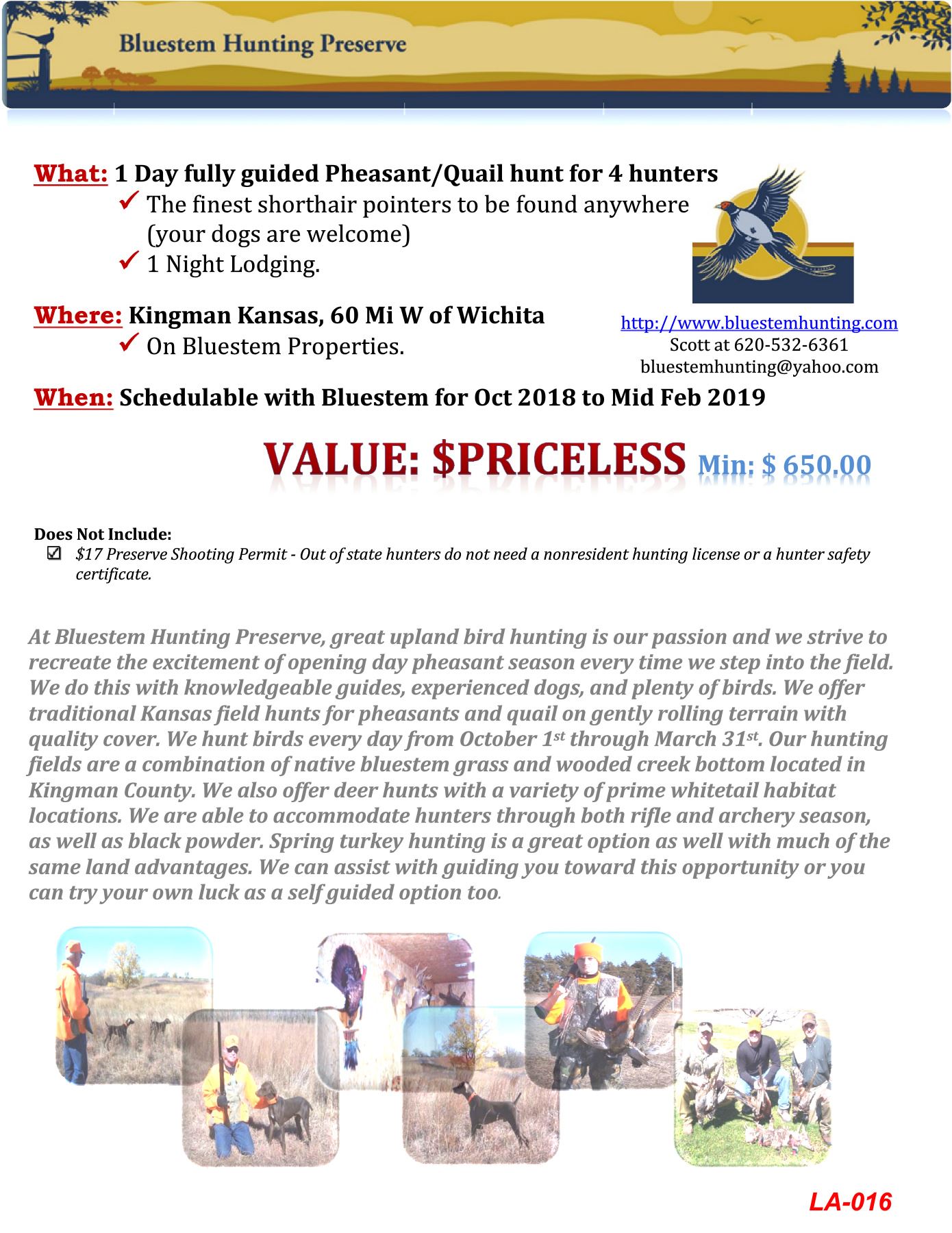 1 Day 4 Hunters Pheasant/Quail - Kansas