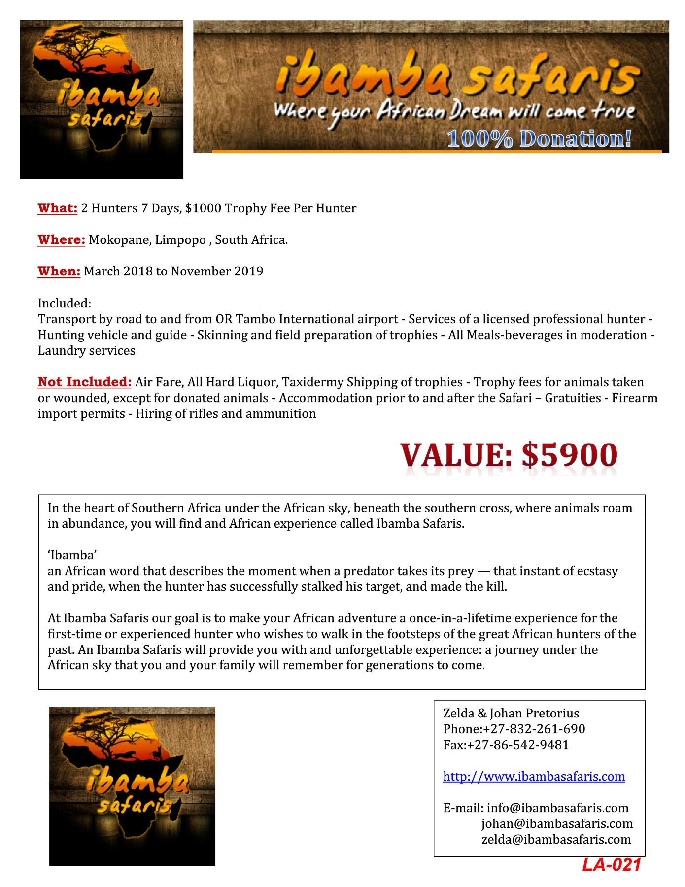Important Notice Your invoice is your donation document. We are not tax lawyers and do not make any statement to the usage of your donation. All Hunts Include Lodging and Food unless otherwise stated in our Not Included Section.