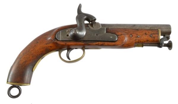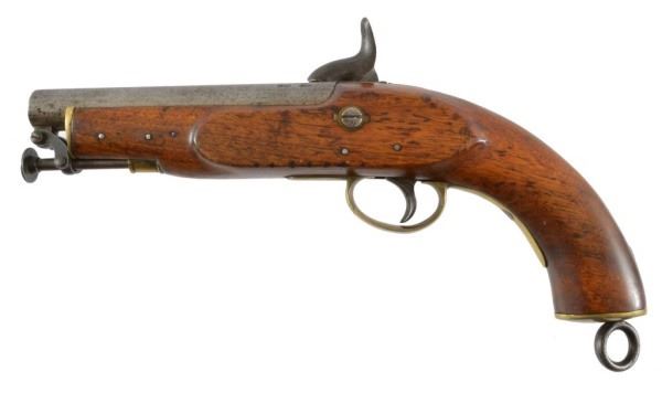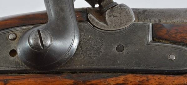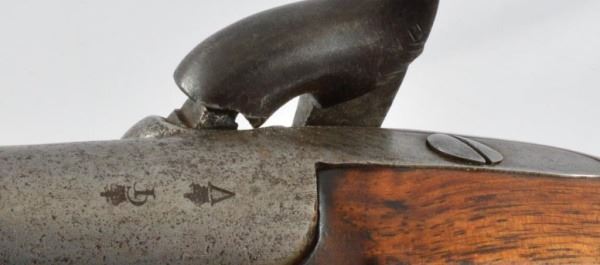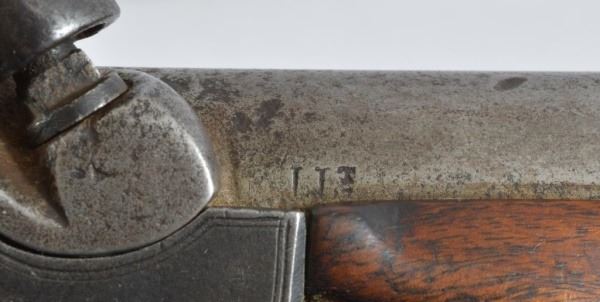 L L stamped on right side of barrel. Crown stamped on side. 6" barrel. Wood frame until 1" back from barrel mouth is brass cap. Walnut stock, Halluard stock.