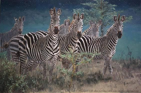 Besse’s painting Stars and Stripes Forever is this year’s Featured Artist of the Year painting. It was one of her African trips that inspired the piece. When she saw the Selous sub-species of the plains zebra in Tanzania, their stunning head-to-hoof stripes captivated her. Besse decided a night scene would create the most interesting drama for this iconic African species. And while they cannot see in the dark, she envisioned the zebras’ rapt attention could only mean they heard something. Maybe the soft pad of a slowly moving paw somewhere in the grass?