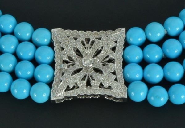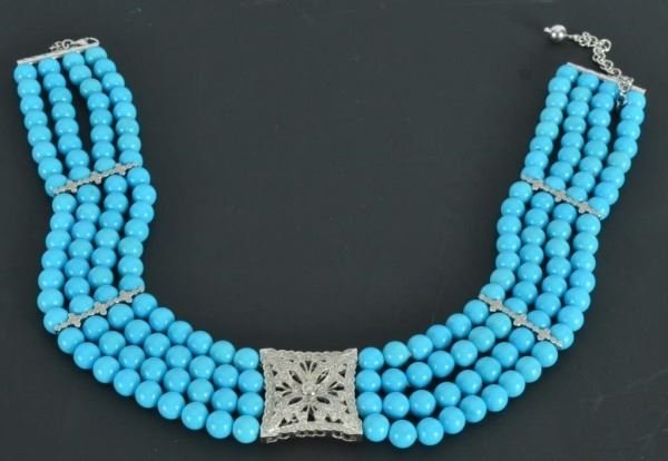 With appraisal: "One 18kt turquoise necklace. Necklace contains 200 small diamonds weighing one (1) ct. and one hundred eighty (180) turquoise beads. Necklace weighs approx. 110.0 grams. Approx. Appraised Value: $5,500."