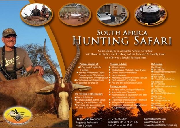 Four lucky hunters will enjoy 7 days hunting, 8 nights accommodations with Registered Professional Hunter and Outfitter Hanno van Rensburg. The package includes 3 meals per day, drinking water, cold drinks, beer and wine, clean and neat accommodations, laundry services, a registered professional hunter and guides, field preparation of trophies, and pick up/drop off at Polokwane Airport. Also included is $500 per hunter towards trophy fees OR the choice of a trophy impala or trophy blewbuck. Additional hunters, observers, and trophies can be added per the outfitter’s standard price list. Hunt must take place in the years of 2018, 2019, or 202. A $1000 deposit per client will be required to secure booking dates (deductible from total bill). The outfitter is experienced with both rifle and bow hunters. Contact Hanno at +011 27 71 656 1914, email at hanno@baltimore.co.za, or visit www.authenticafricanadventure.org for more details. VALUE: $14,400