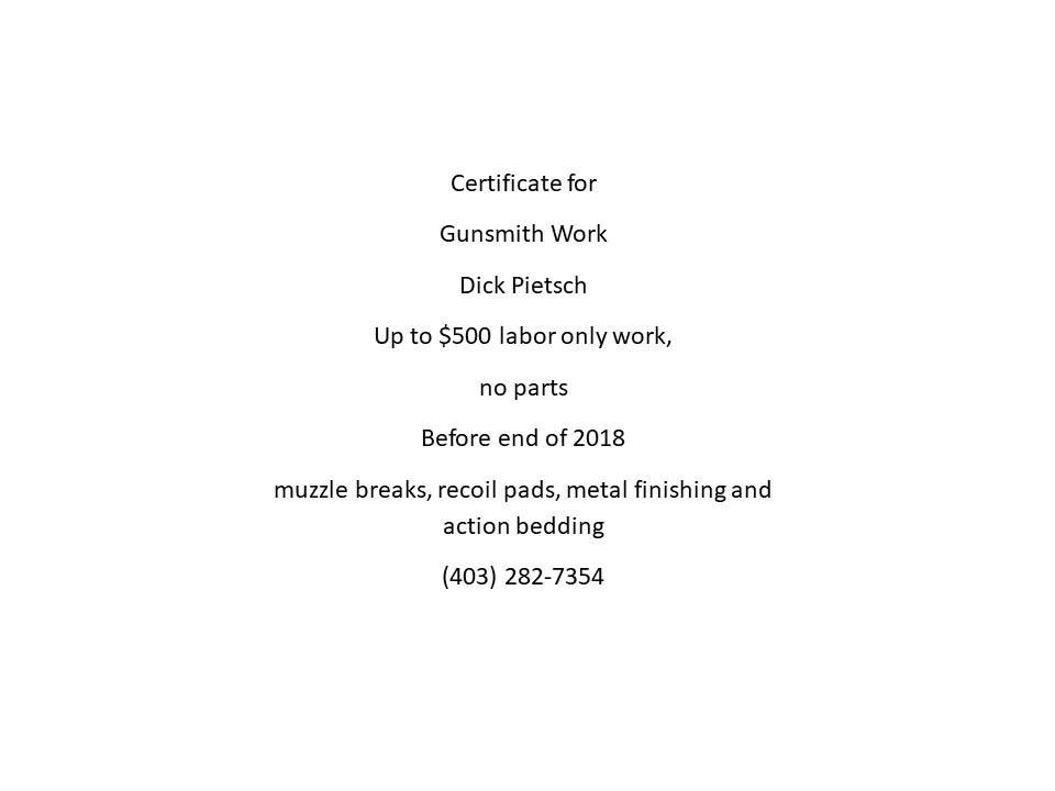 Dick Pietsch has generously donated up to $500 of gunsmith work to SCI Calgary. The choice of work is yours and the certificate can be redeemed anytime up to the end of end of 2018.