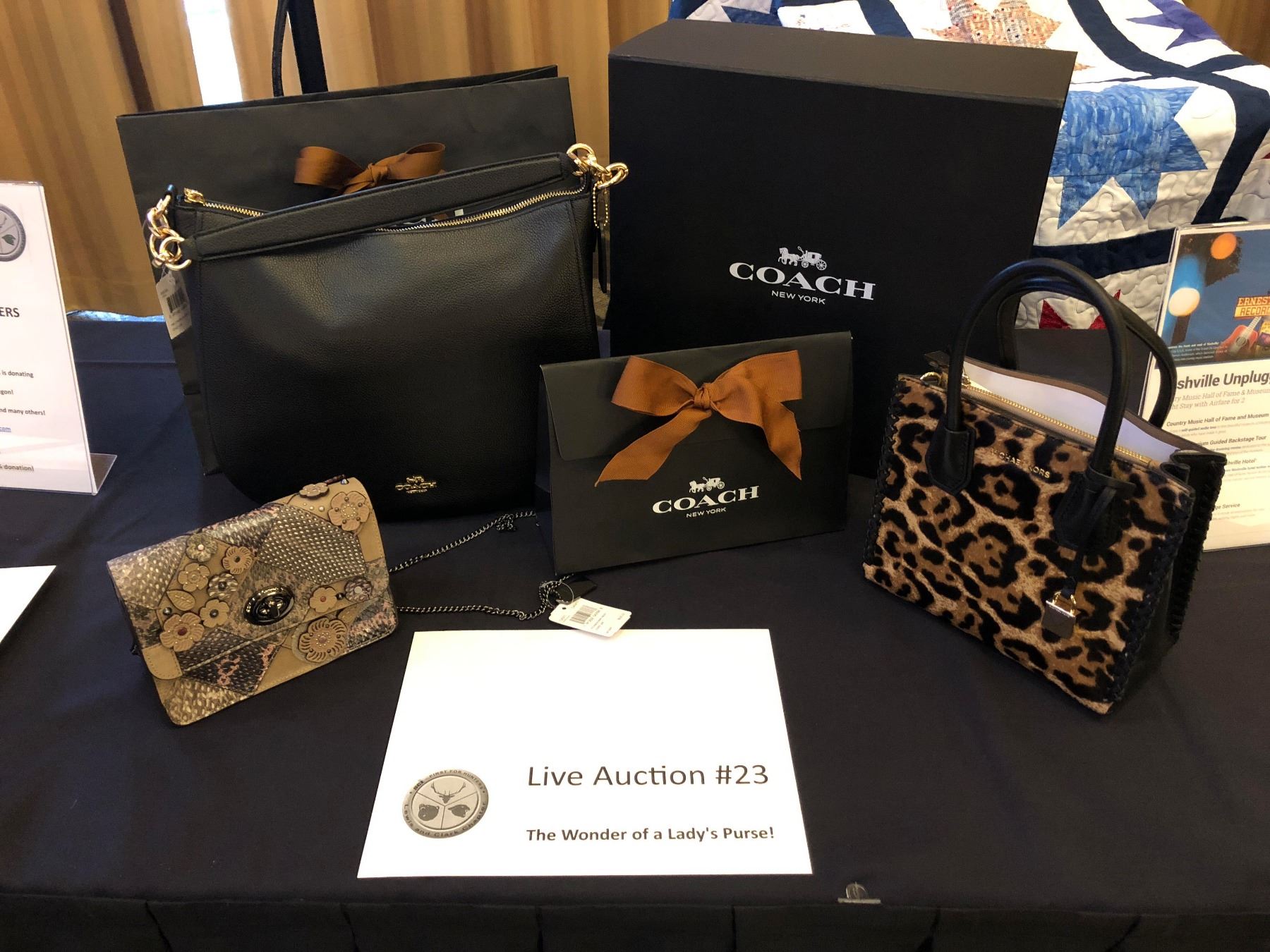 Here's how it work! 3 purses... #1 an Anuschka custom hand-painted design, #2 a Dooney and Bourke, and #3 a Brighton purse. One of these three purses is filled with great gifts with a value exceeding $1,500.00 (including a firearm).