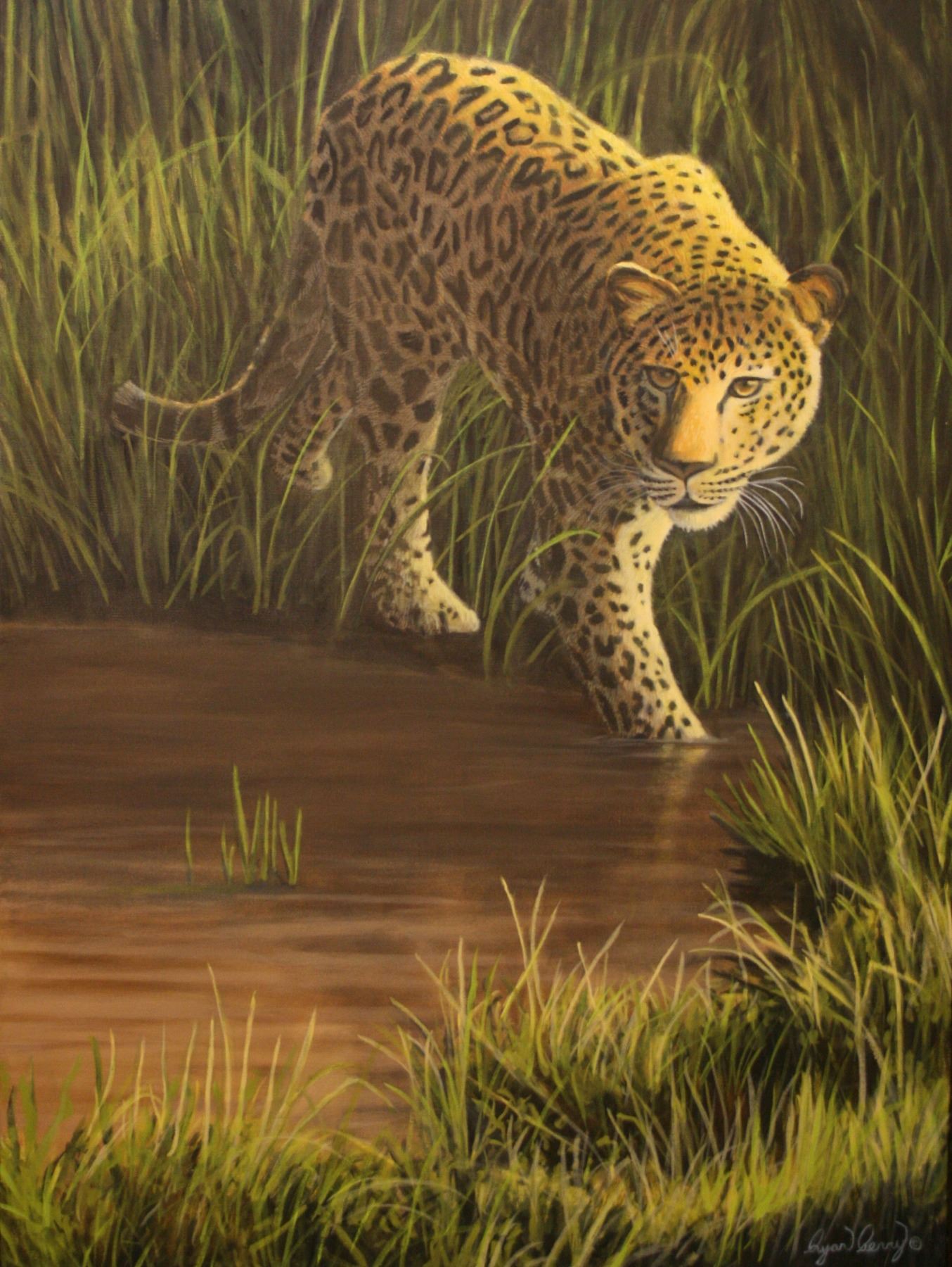 "Leopard at the Water" 30" x 40" inches; original oil on canvas. Unframed/edges painted black.