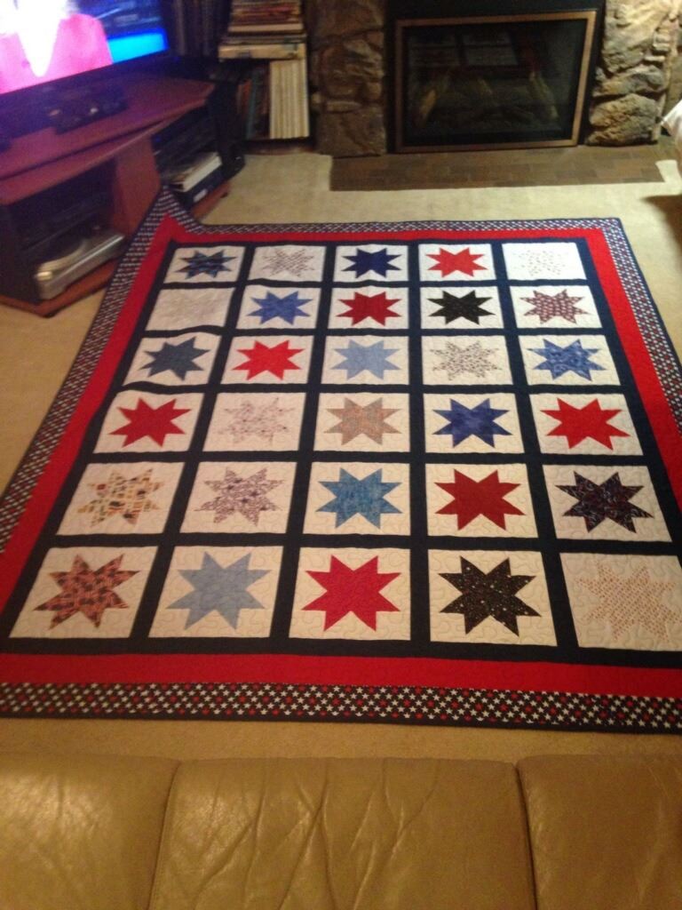 Heart and soul went into the making of this absolutely gorgeous, "keep you warm in the evenings" quilt. Made up of 30 11 1/2" squares with floating stars and stripes. Boarder is Navy blue with stars. This is one that will make you feel good for years to come! All proceeds go to support our youth programs.