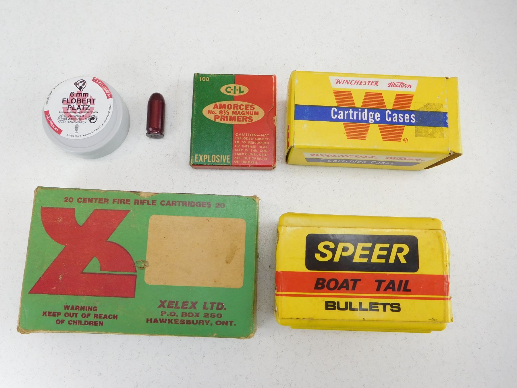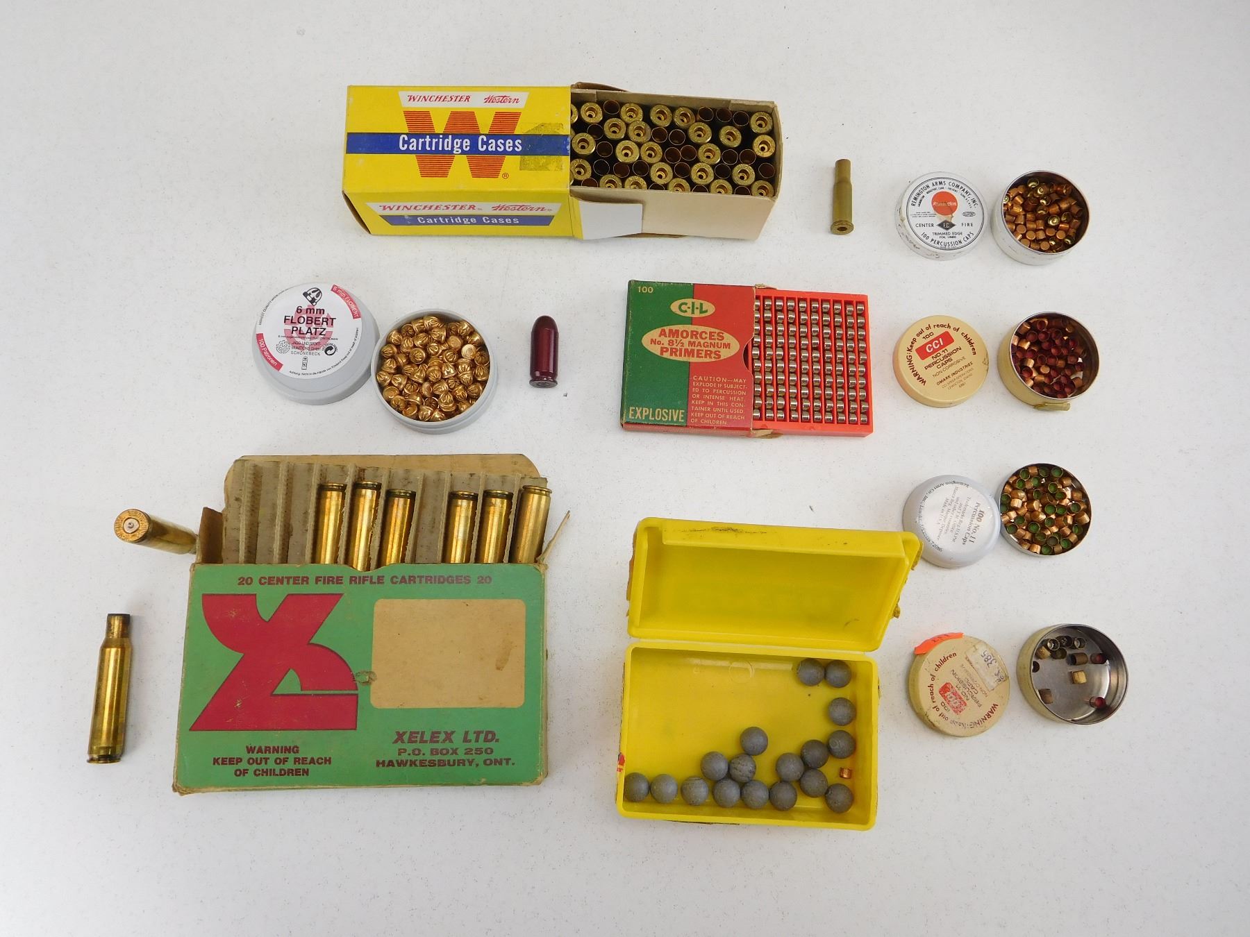 100 CIL PRIMERS NO 8 1/2 PRIMERS, APPROX 100 RNDS 6MM FLOBERT, APPROX. 120 PERCUSSION CAPS, 17 LEAD BALLS, 1 RND 45 AUTO SNAP CAP 65 BRASS INCLUDES 50 WINCHESTER 25-20 UNPRIMED & 15 7MM MAUSER