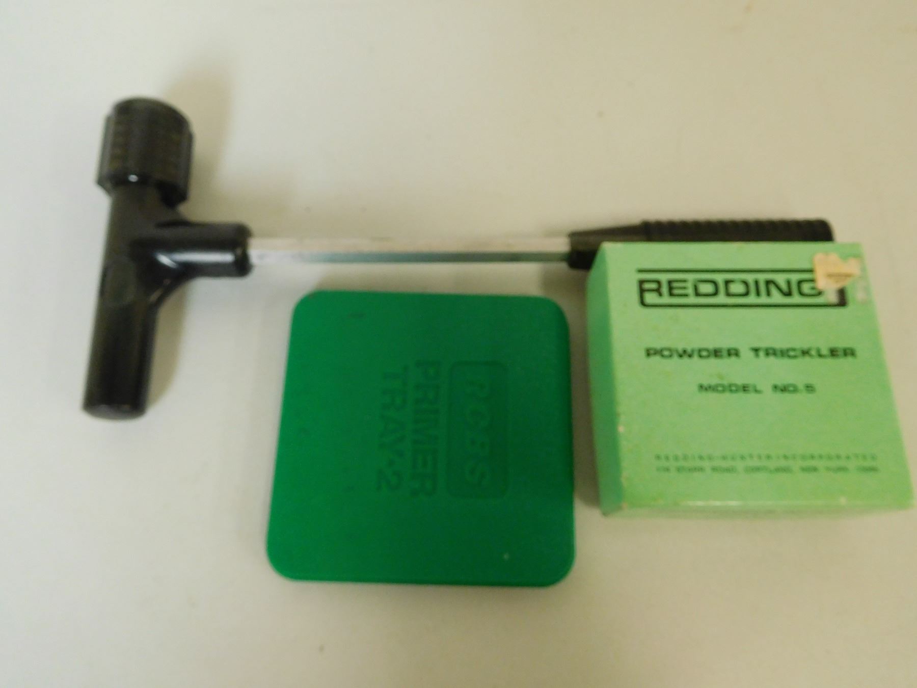 (1) LYMAN BULLET PULLER, (1) RCBS PRIMER TRAY, (1) REDDING POWDER TRICKLER MODEL NUMBER 5, LOT OF 3
