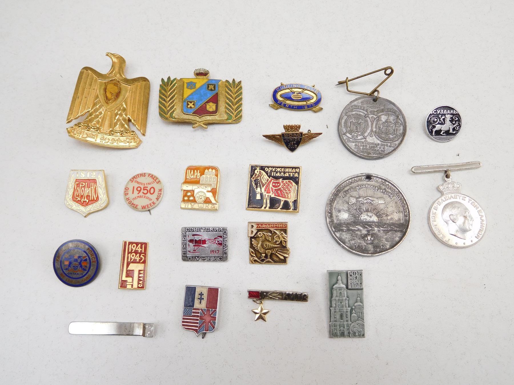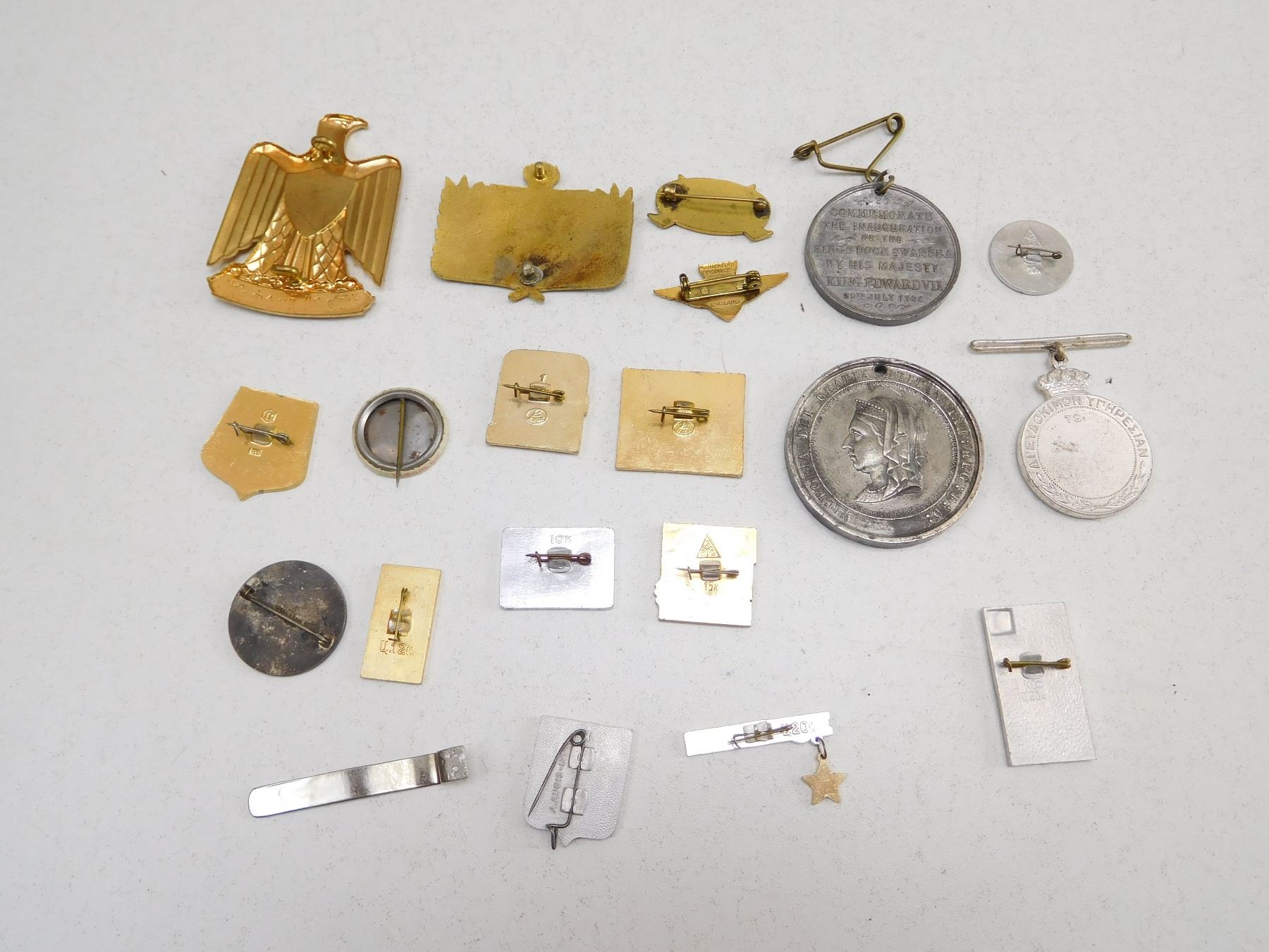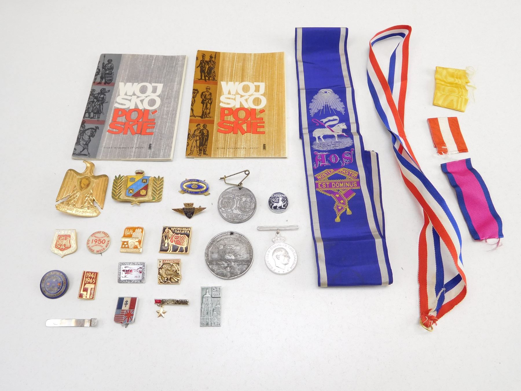 (2) SET OF WOJSKO POLSKI MILITARY POST CARD (18 TOTAL), ASSORTED PINS, SWANSEA MEDAL, 1837-1897 GOOD WILL TO ALL NATIONS MEDALLION