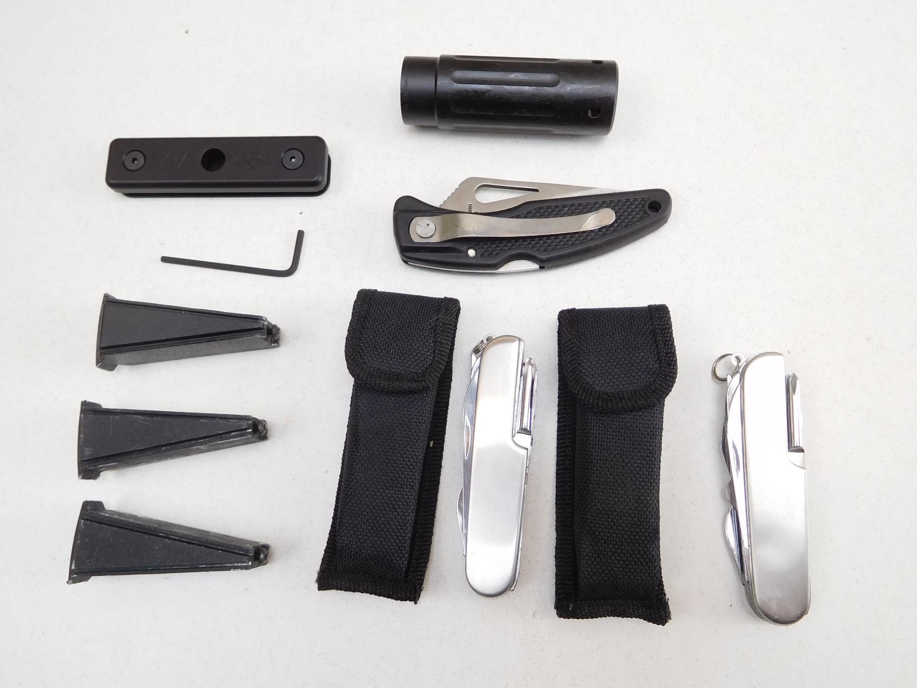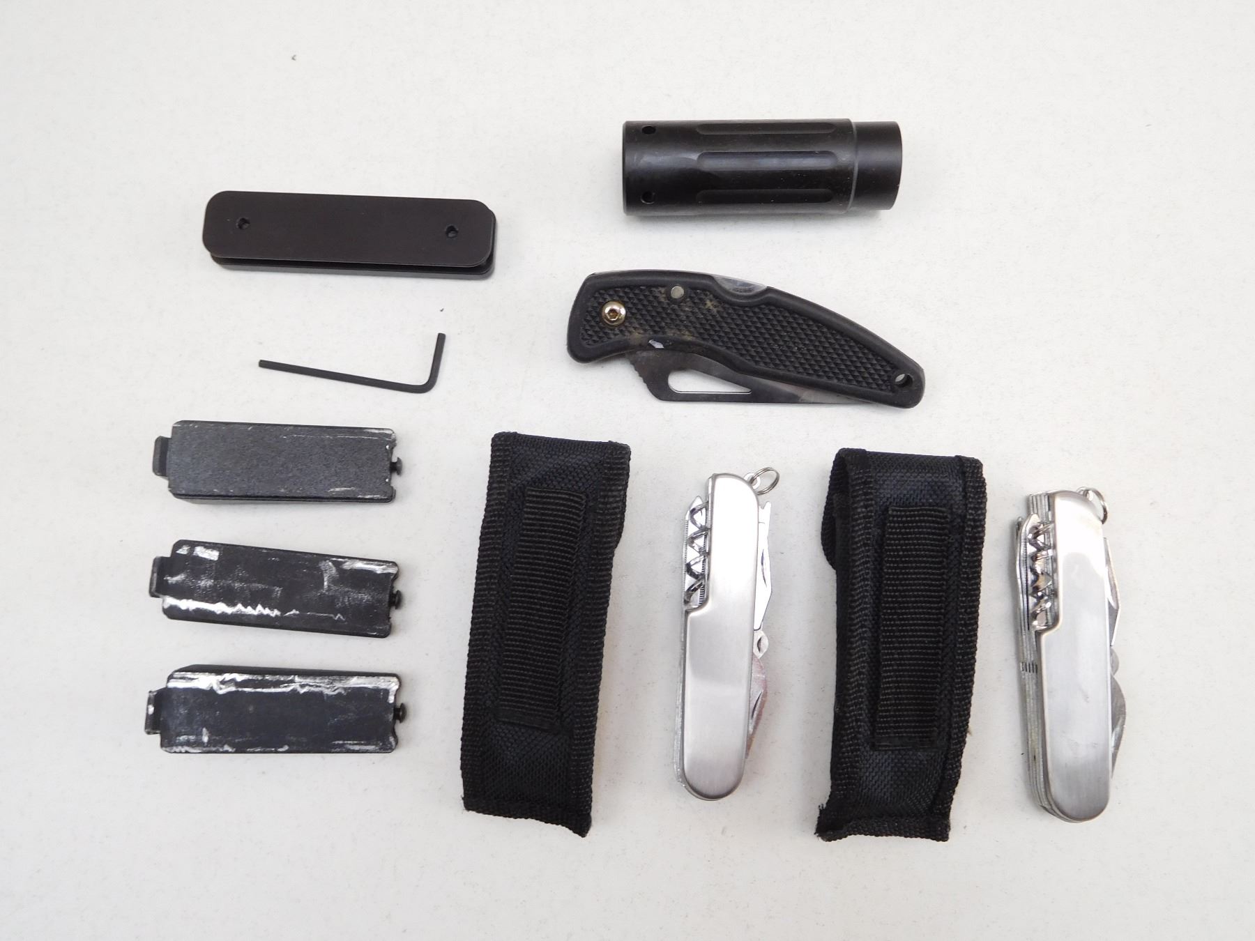(1) MANTICORE ARMS MA-11900 TAVOR GASKETED PORT COVER, (3) MAGWEDGE MAGAZINE COUPLER, (1) BROWNING GUN PART, (2) MULTI-TOOLS WITH SHEATHS, (1) POCKET KNIFE