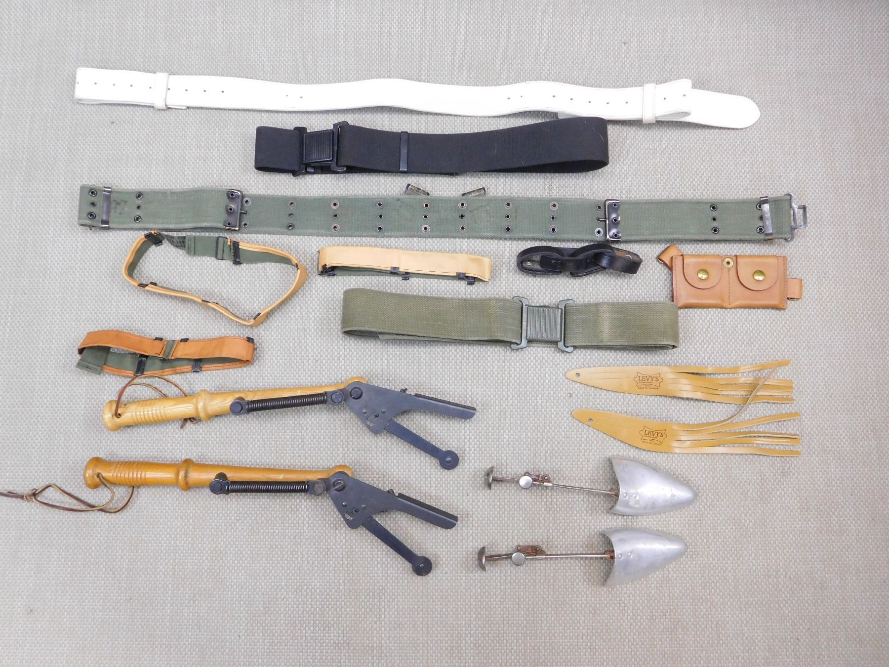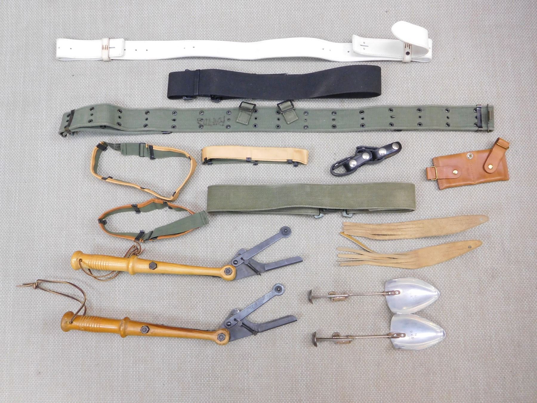 (2) REMINGTON SKEET SHOOTERS, (1) PAIR OF SHOE STRECHERS MARKED 4X5N, HELMET LINERS AND ASSORTED BELTS