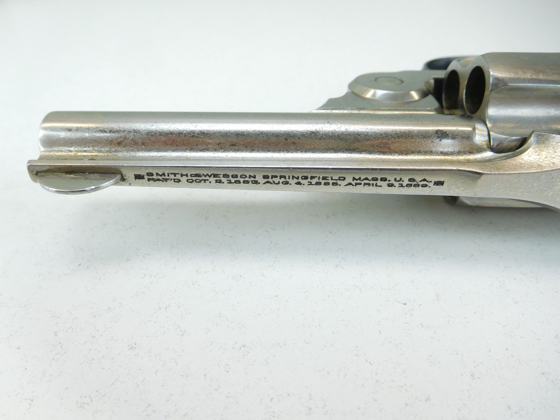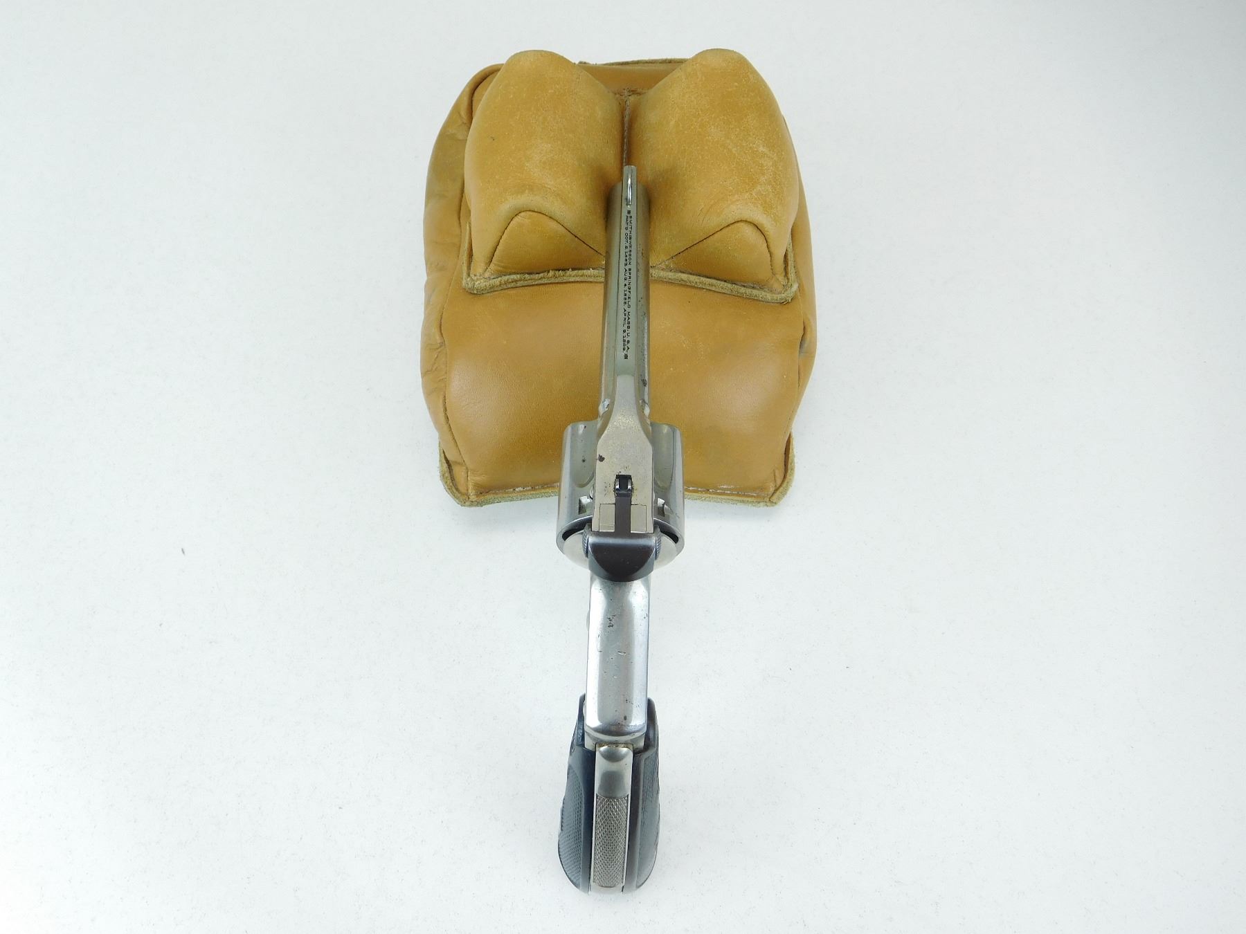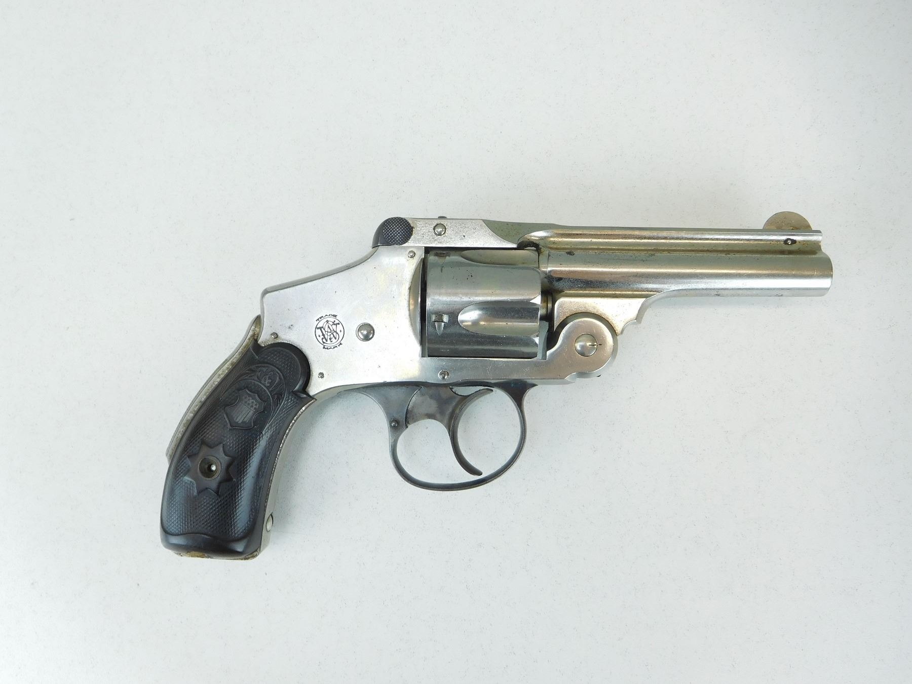 5 SHOT CAPACITY, GOOD BORE, NICKEL FINISH, REPLACED GRIP THE RIGHT HAND FOREHAND AND WADSWORTH GRIPS IS CRACKED THE LEFT GRIPS IS ORIGINAL S&W IN GOOD CONDITION, BLADE FRONT AND V NOTCH REAR SIGHT, DOUBLE ACTION ONLY MECHANISM FUNCTIONS WELL , ACTION: REVOLVER , BARREL LENGTH: 76MM , STOCK # P1875 , SERIAL # 198055 , CONDITION: 6/10 , CLASS: CANADIAN PROHIBITED CLASS
