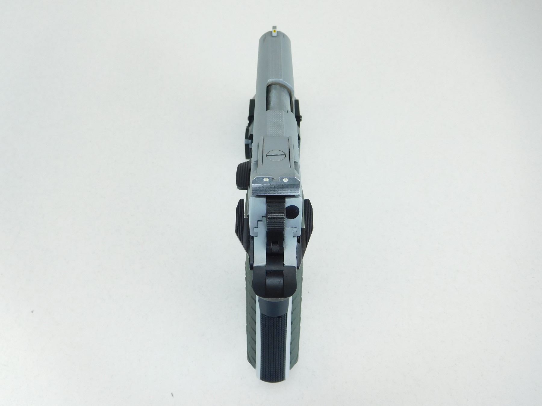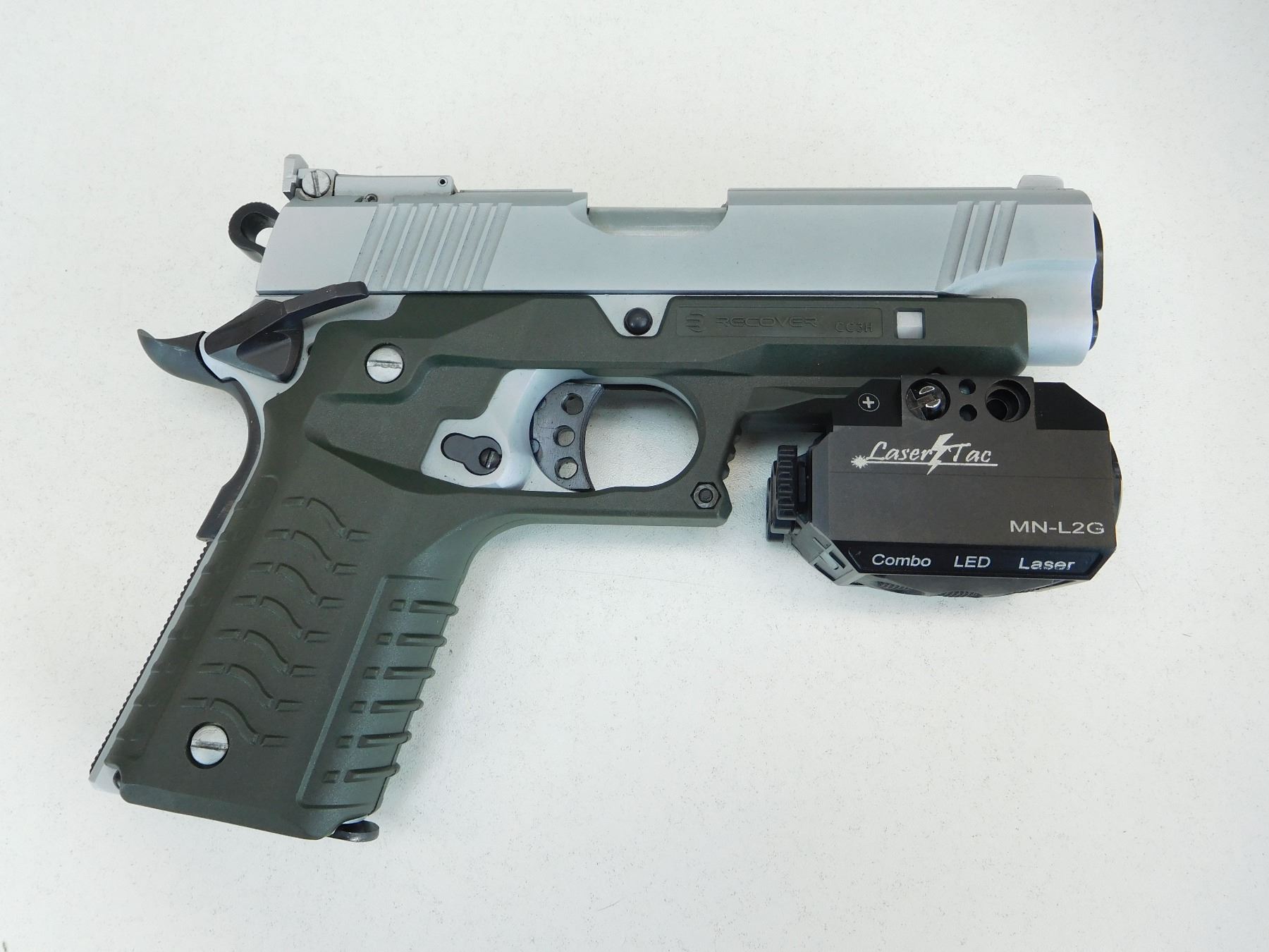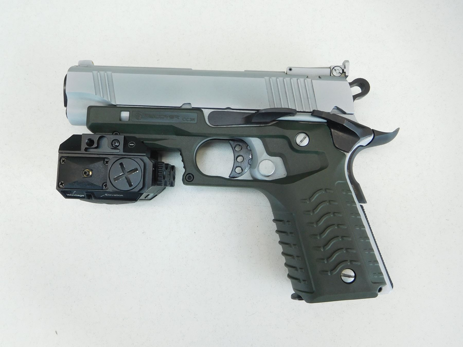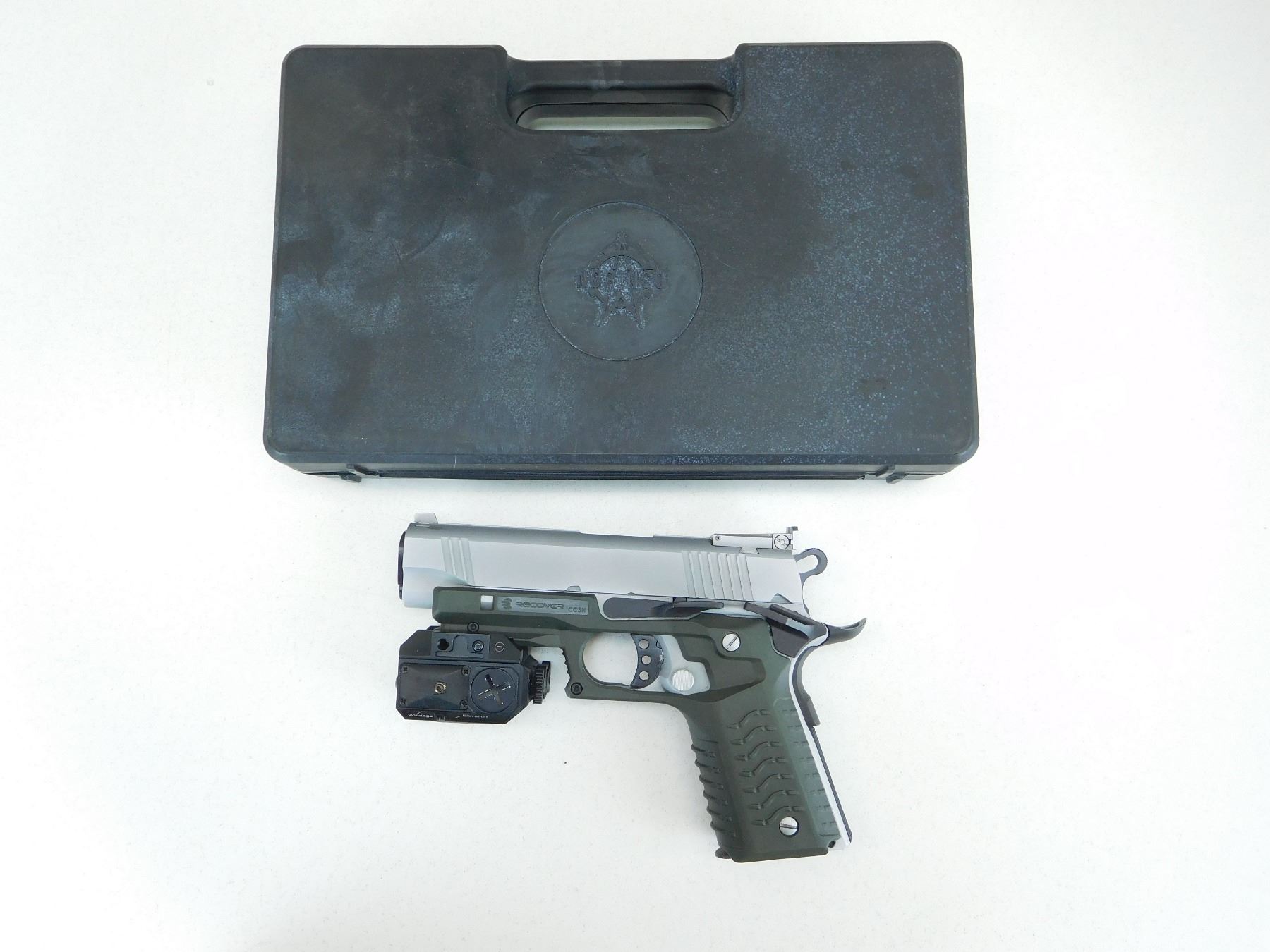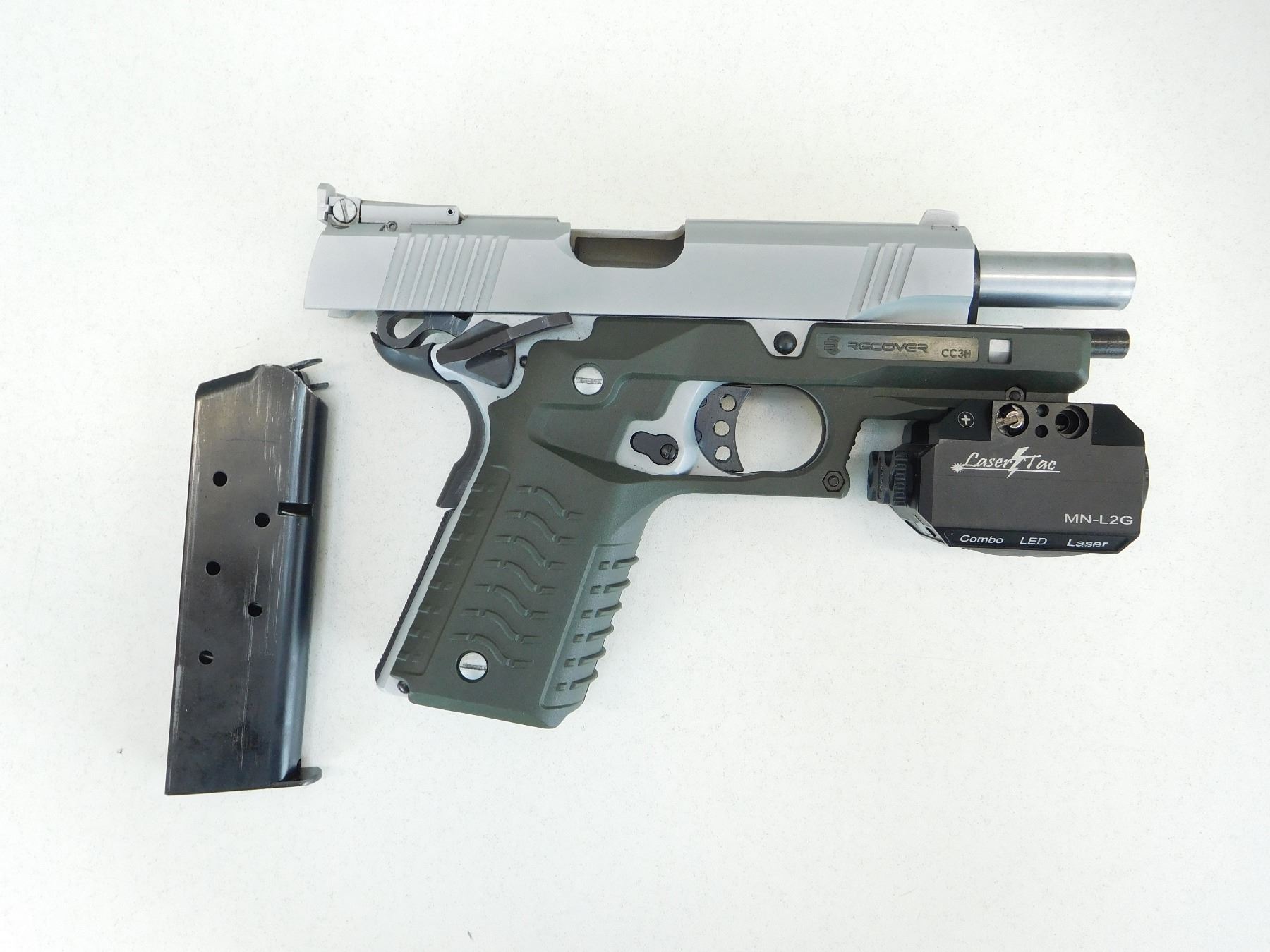 COMES WITH CASE AND MAGAZINE, LASER AND FLASH LIGHT TAC SIGHT, WHITE DOT SIGHTS WITH DOVETAIL FRONT AND ADJUSTABLE REAR SIGHT, POLYMER SLEEVE ON THE FRAME MADE BY RECOVER, BLACK PLASTIC GRIPS, BRUSHED ALLOY FINISH, BORE IS GOOD, SKELETONIZED TRIGGER, EXTENDED BEAVER TAIL GRIP SAFETY, COMBAT HAMMER , ACTION: SEMIAUTOMATIC HANDGUN , BARREL LENGTH: 109MM , STOCK # R2496 , SERIAL # BB13551 , CONDITION: 8/10 , CLASS: CANADIAN RESTRICTED CLASS