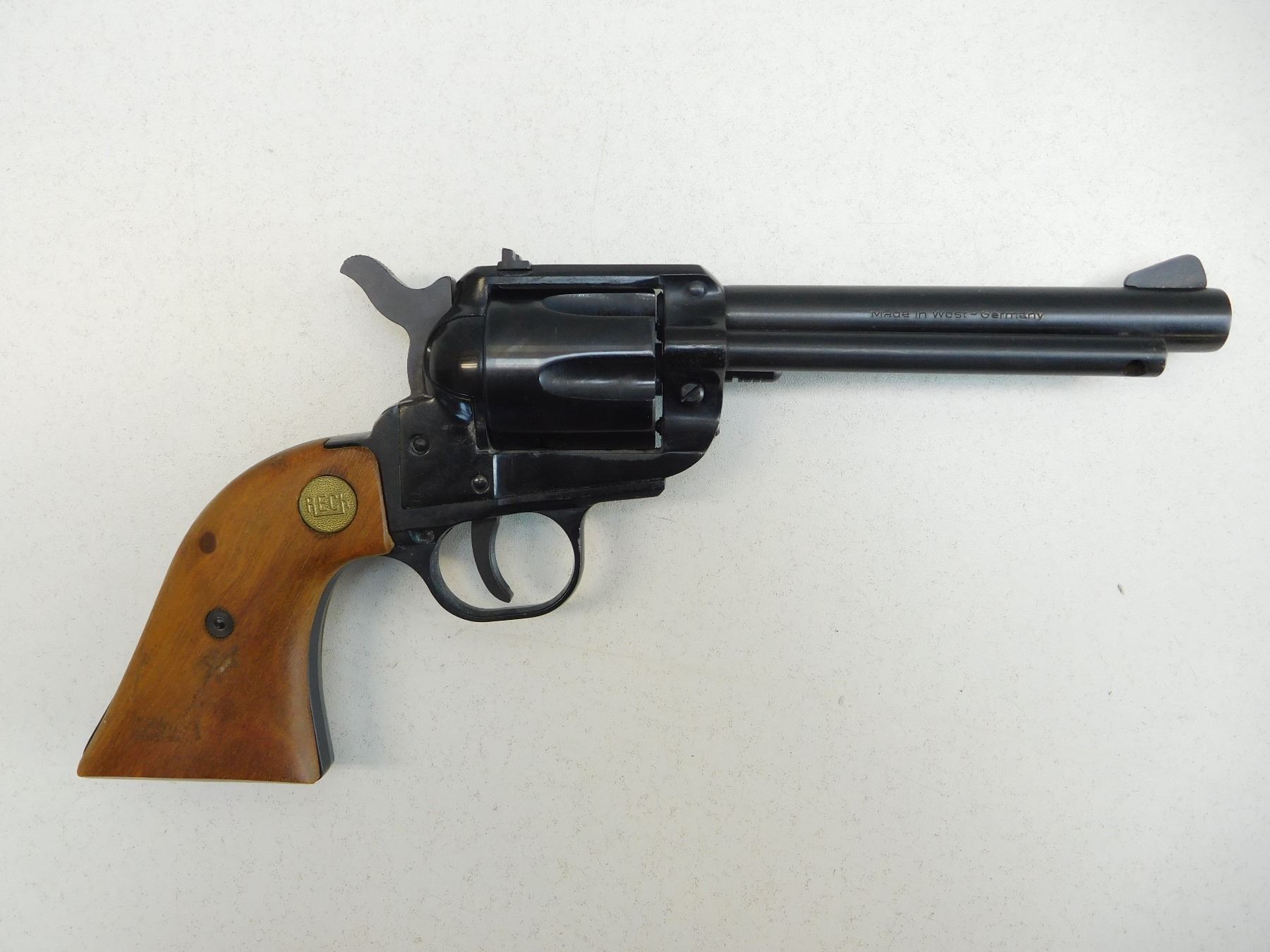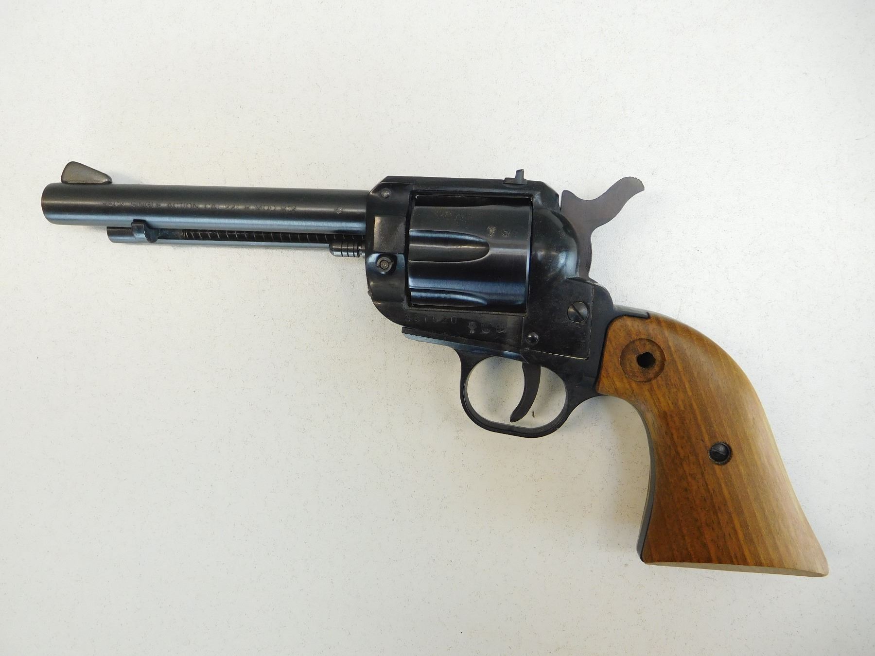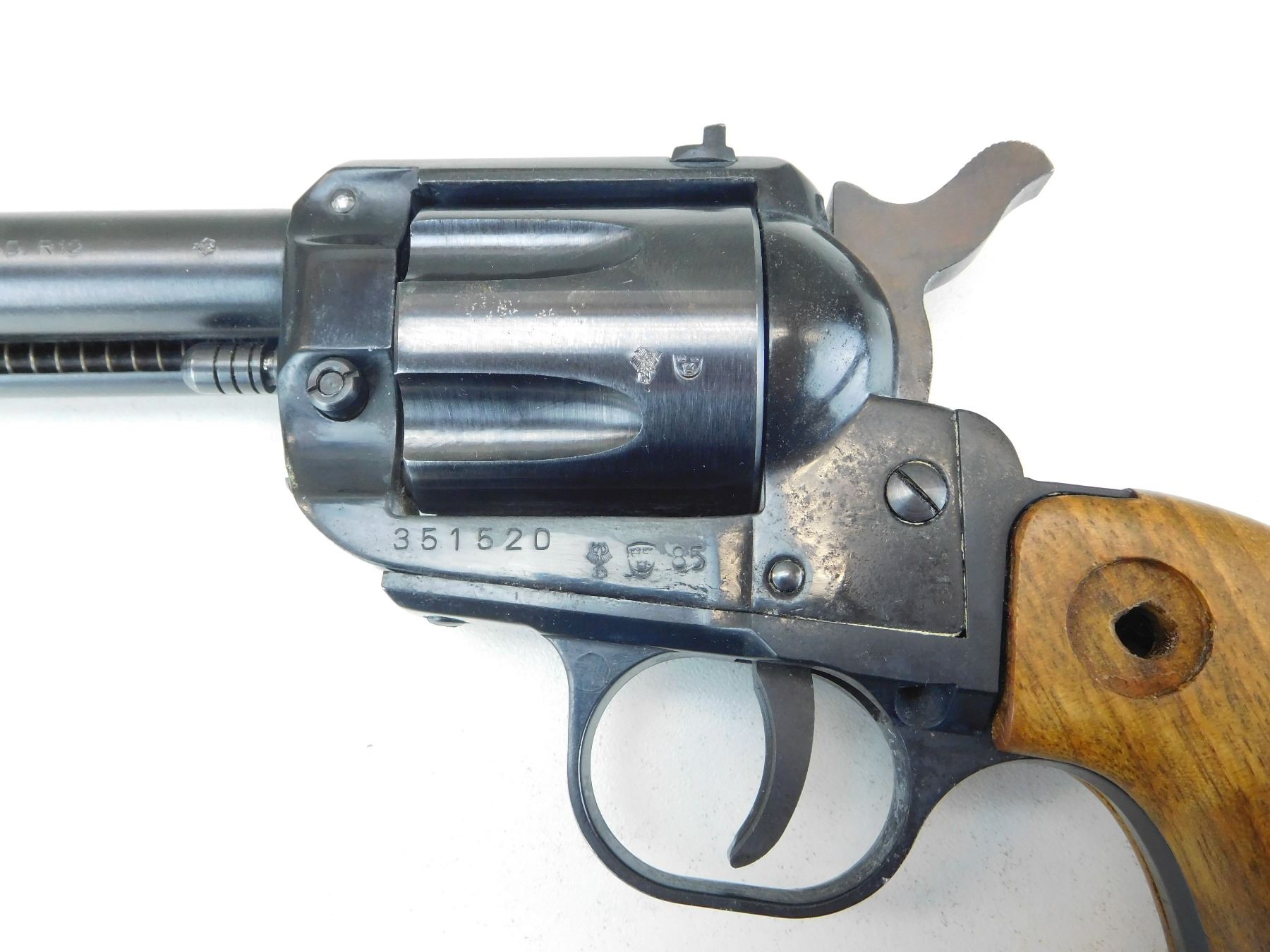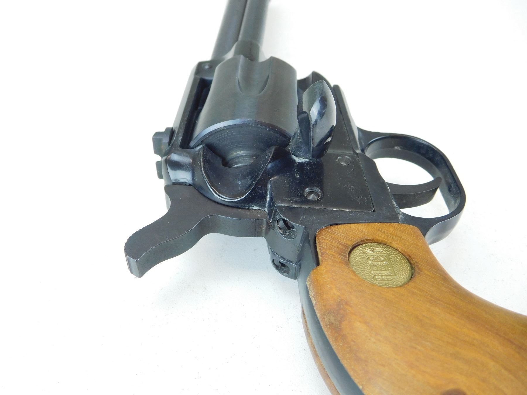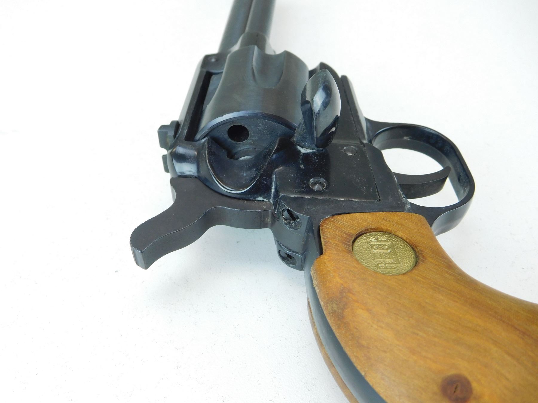 THIS IS A SINGLE SHOT PISTOL, BLADE FRONT AND DRIFT ADJUSTABLE REAR SIGHT, WOODEN GRIPS, SINGLE ACTION, COCKS, HOLDS AND FIRES, BORE IS GOOD , ACTION: SINGLE SHOT REVOLVER , BARREL LENGTH: 125MM , STOCK # R2499 , SERIAL # 351520 , CONDITION: 7/10 , CLASS: CANADIAN RESTRICTED CLASS