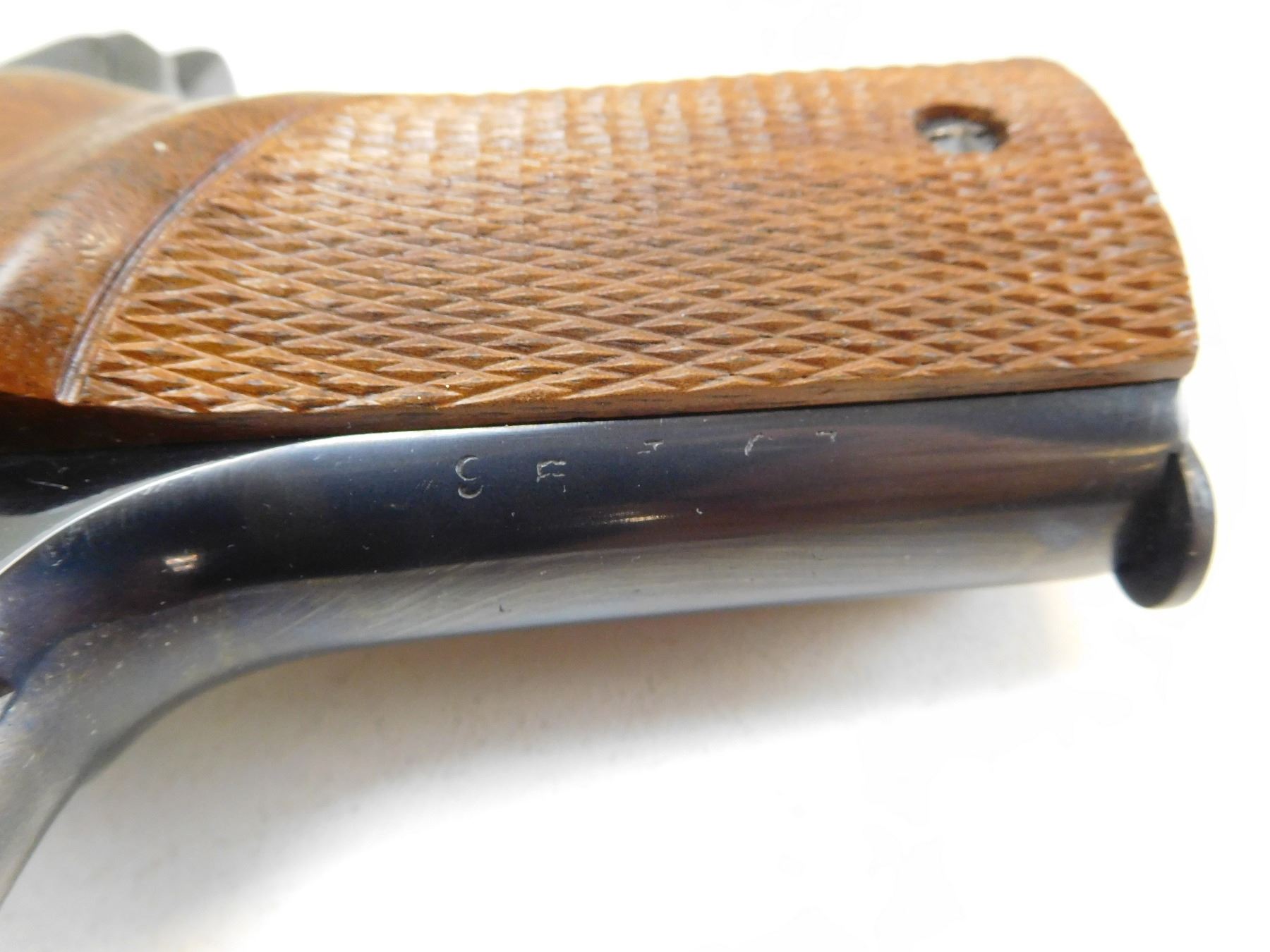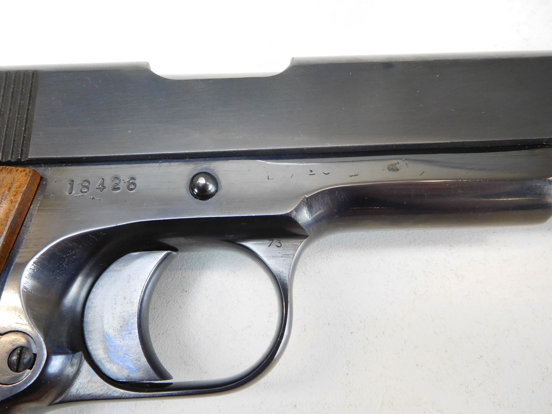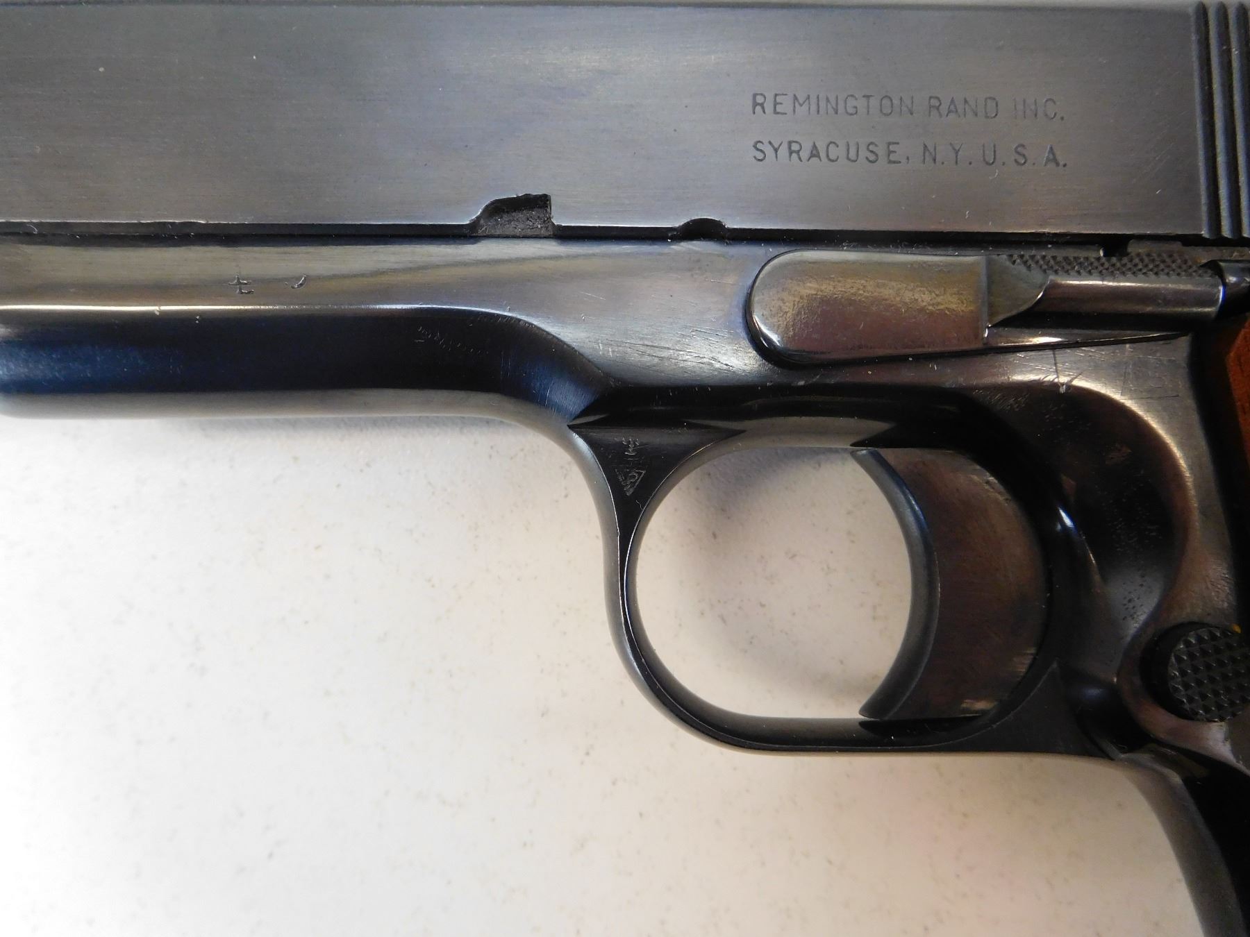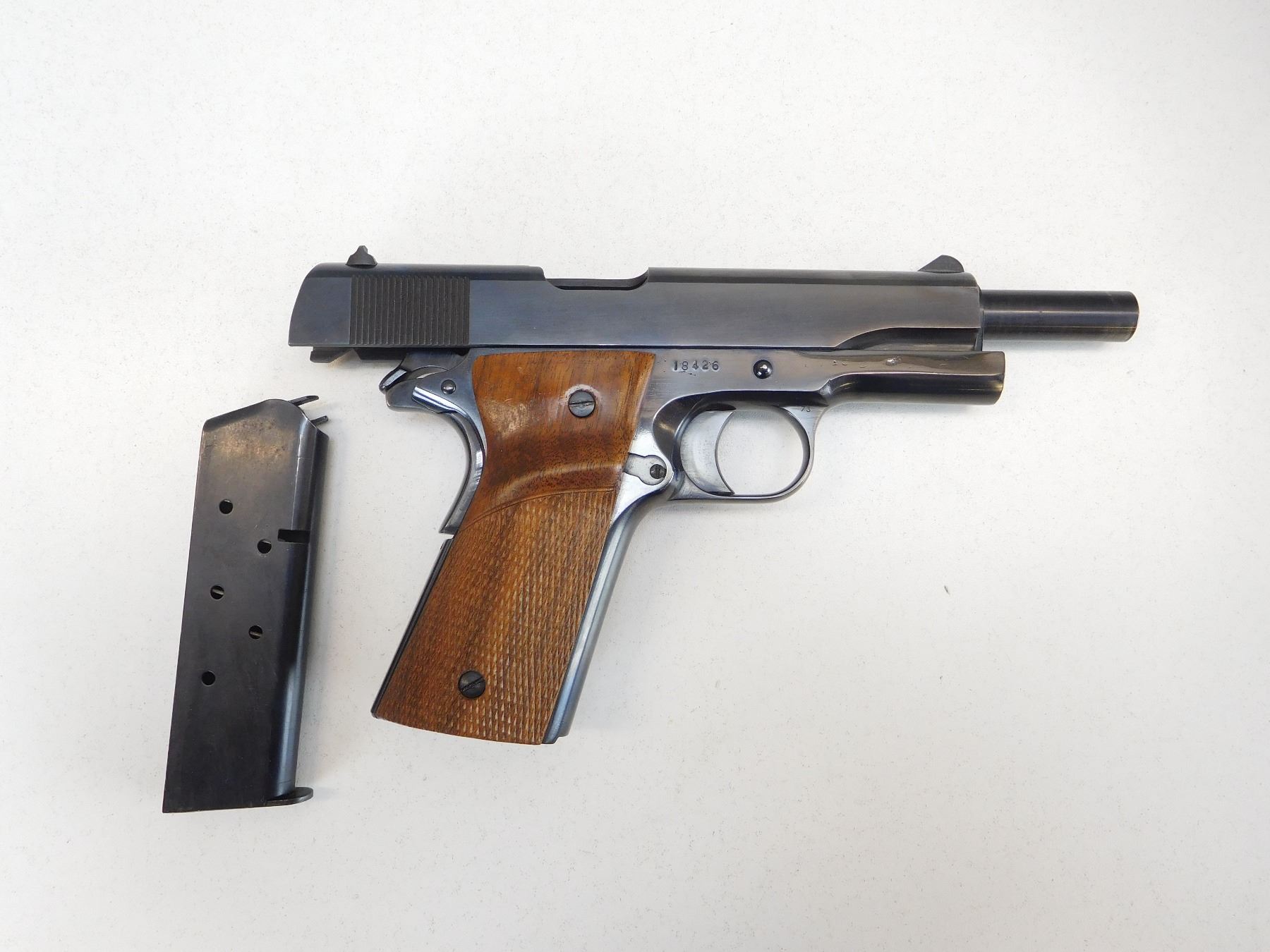 COMES WITH MAGAZINE, MADE BY REMINGTON, THIS FIREARM HAS BEEN REBLUED, EXCELLENT BORE, CUSTOM CHECKERED WOOD GRIPS WITH RAISED THUMB BPEICE (AMBIDEXTRIOUS), COCKS AND HOLDS, BLADE FRONT AND DRIFT ADJUSTABLE REAR SIGHT , ACTION: SEMIAUTOMATIC HANDGUN , BARREL LENGTH: 127MM , STOCK # R2503 , SERIAL # 18426 , CONDITION: 8/10 REBLUED , CLASS: CANADIAN RESTRICTED CLASS