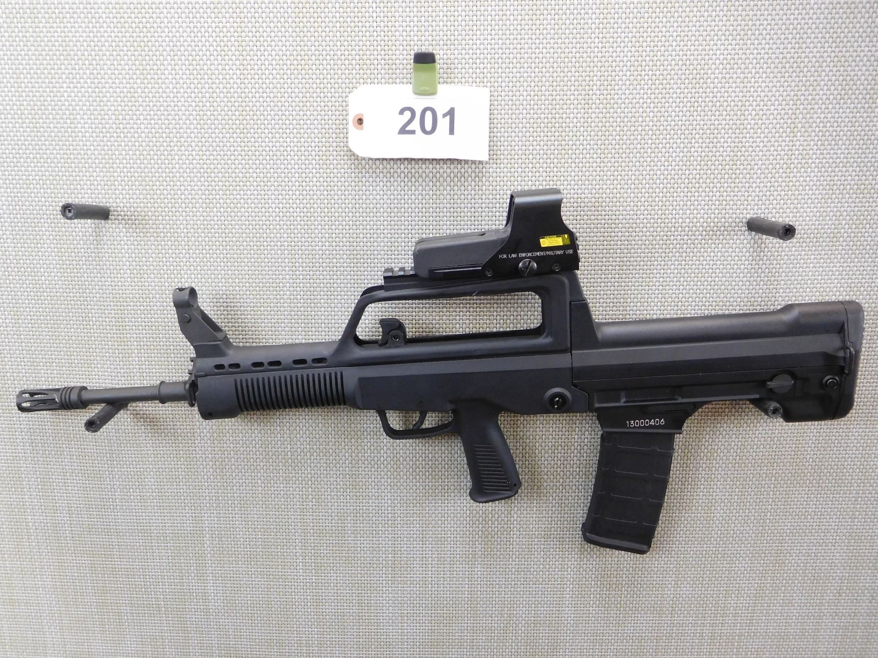 COMES WITH A 20 SHOT MAGAZINE THAT HAS BEEN PINNED TO 5, BLACK SYNTHETIC STOCK, BULL PUP DESIGN, CLASS II LASER ELECTRONIC SIGHT, STANDARD FLIP APERATURE REAR AND HOODED FRONT SIGHT, BIRD CAGE MUZZLE BREAK, APPEARS UNFIRED , ACTION: SEMI AUTO RIFLE , BARREL LENGTH: 20" , STOCK # 7093 , SERIAL # 00406 , CONDITION: APPEARS UNFIRED 9/10 , CLASS: CANADIAN NON RESTRICTED CLASS
