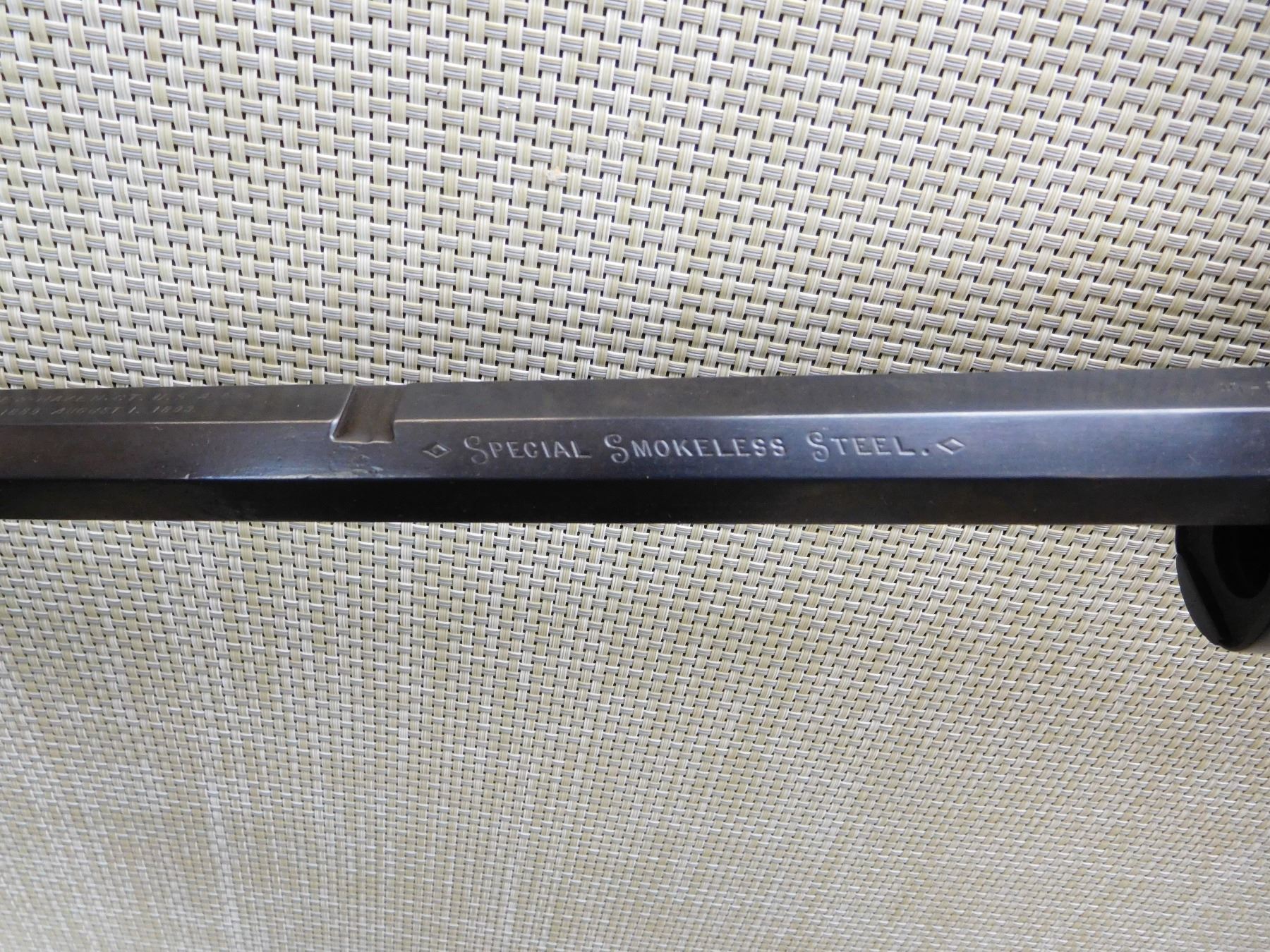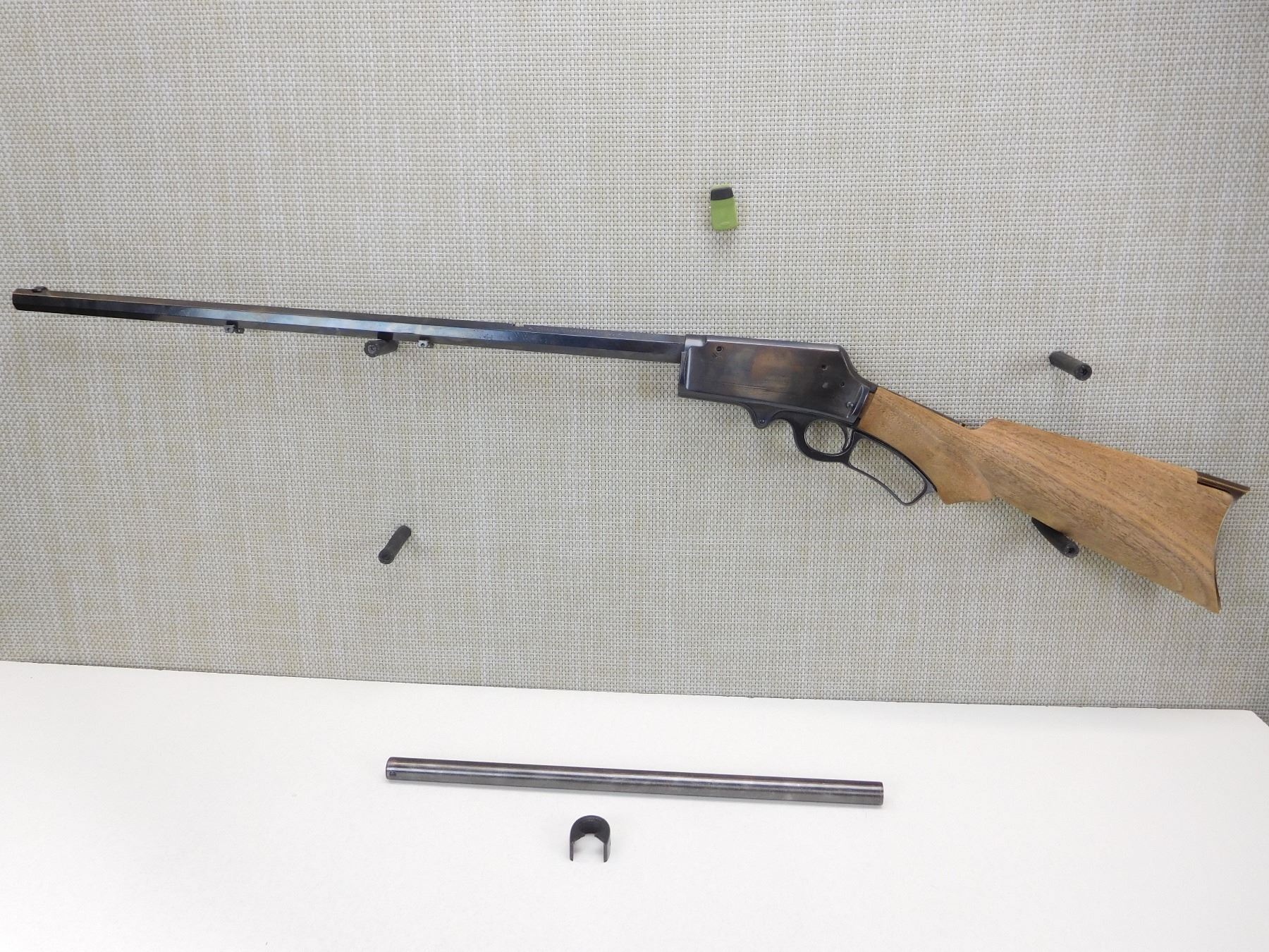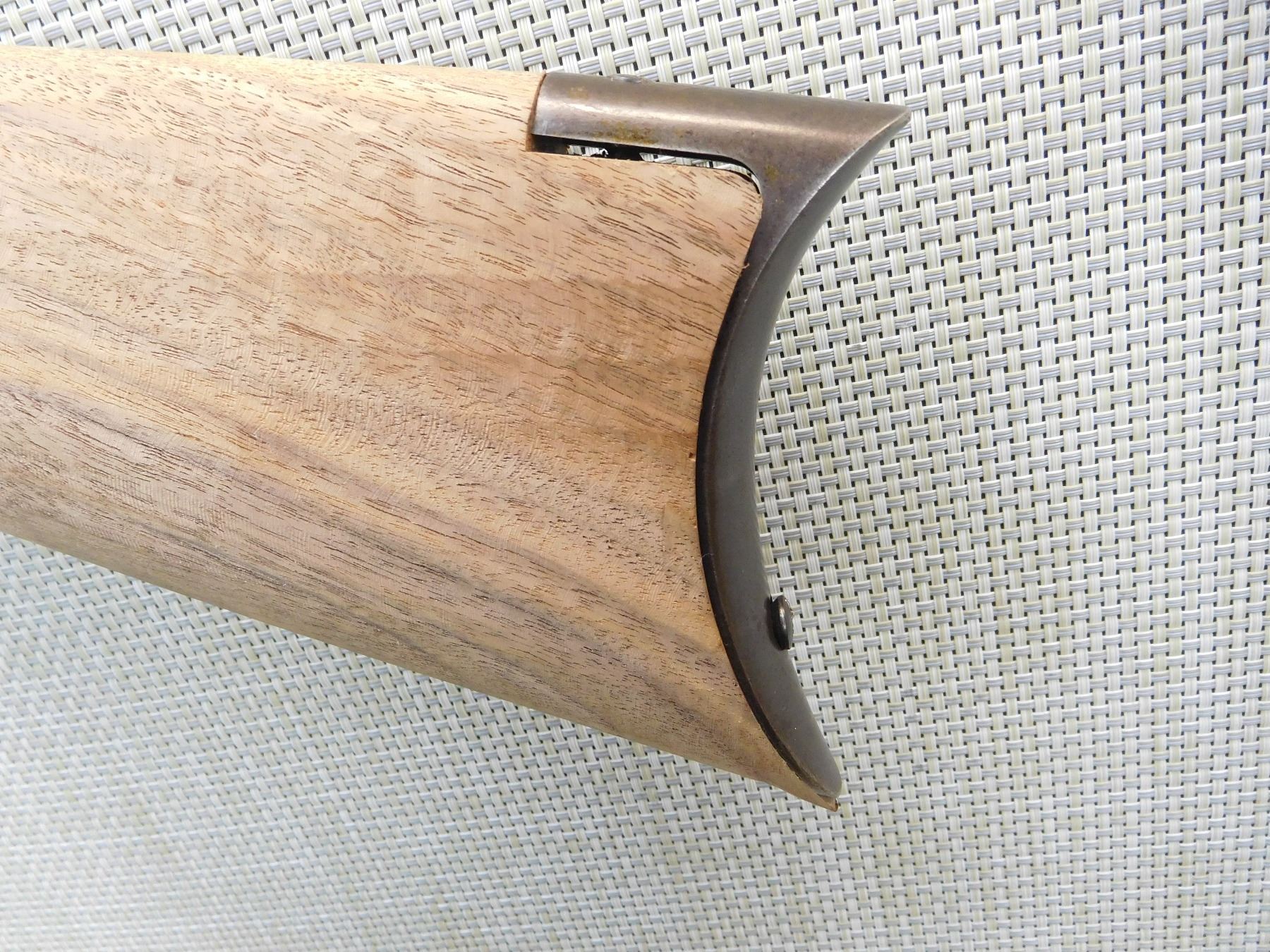 PARTS GUN WORK IN PROGRESS, APPEARS TO BE REBLUED, STOCK NEEDS FINAL FITTING AND FINISH, THERE IS NO FOREND AND NO HAMMER, HAS MAGAZINE TUBE AND FOREND CAP NOT INSTALLED, MAYBE MISSING OTHER PARTS, DOVETAILED FRONT AND ABSENT REAR SIGHT, CRESCENT METAL BUTT PLATE, OCTAGONAL BARREL, STRONG RIFLING IN THE BORE, REAR TANG HAS BEEN DRILLED FOR A PEEP SIGHT , ACTION: LEVER ACTION RIFLE , BARREL LENGTH: 24" , STOCK # 7094 , SERIAL # 160128 , CONDITION: PARTS , CLASS: CANADIAN NON RESTRICTED CLASS