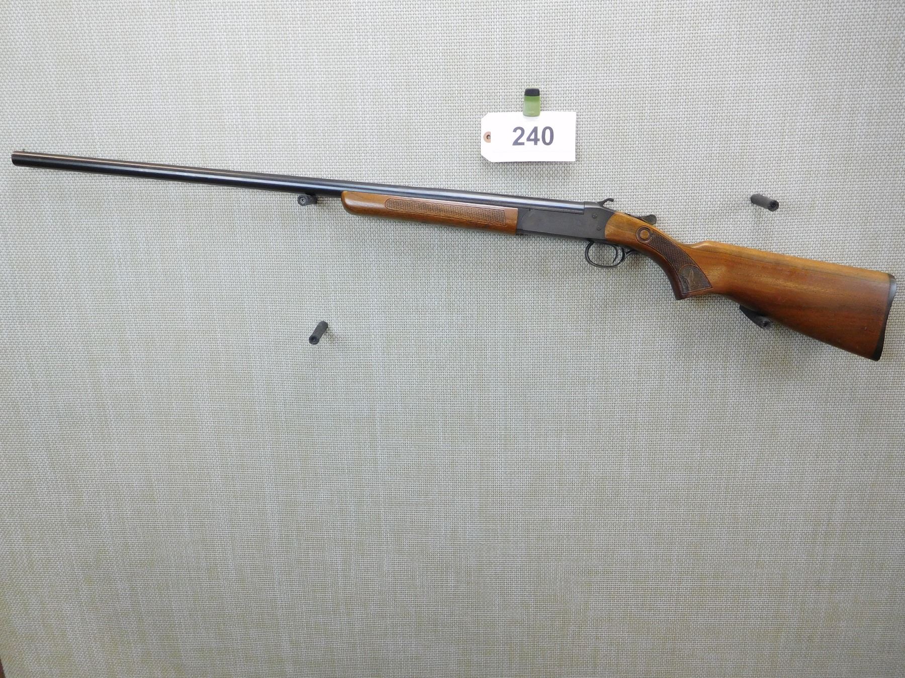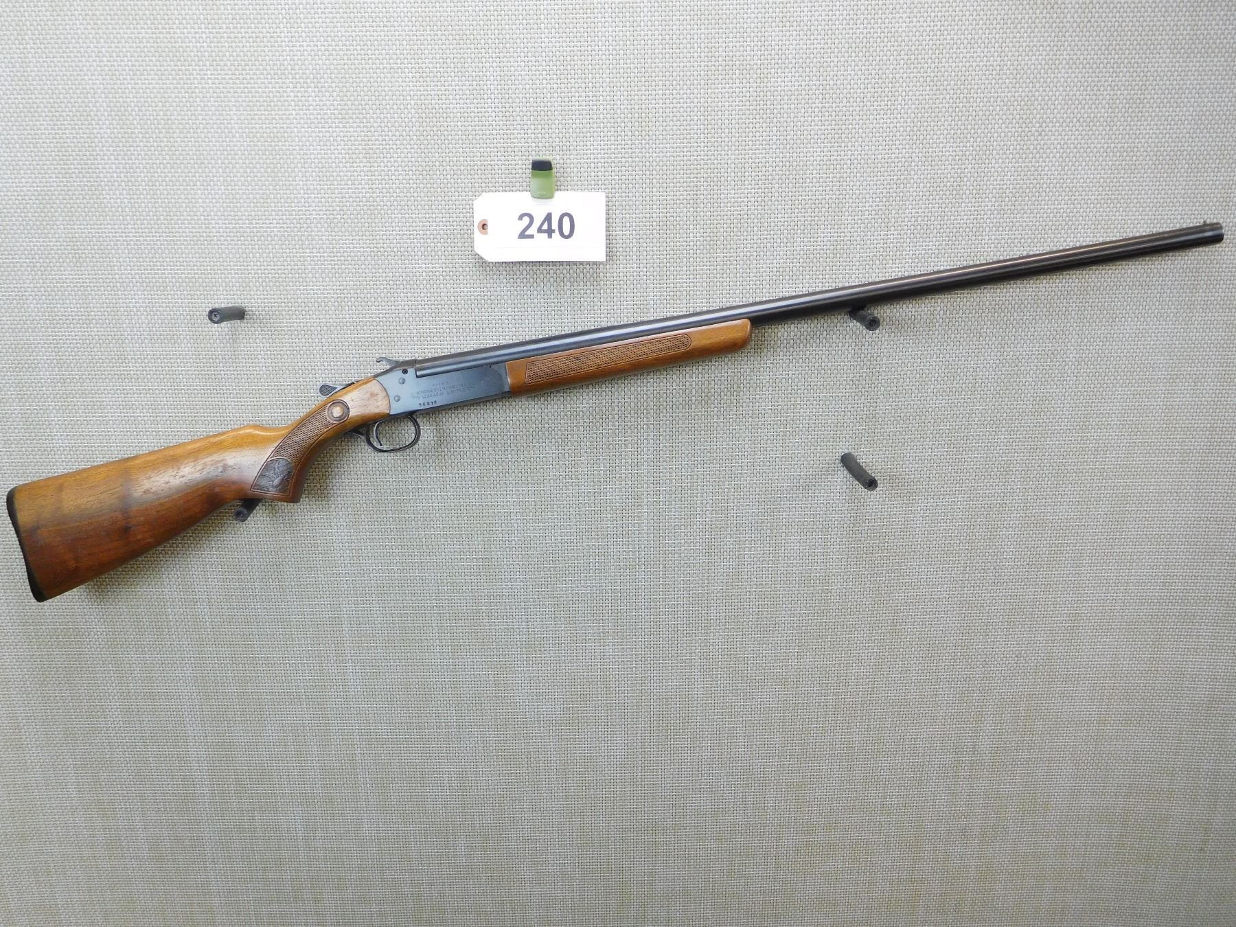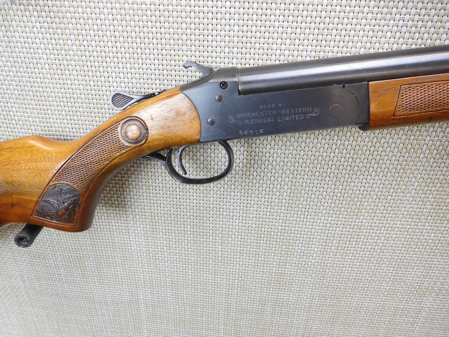 MADE BY WINCHESTER WESTERN, FIXED FULL CHOKE, HARD RUBBER BUTT PLATE, PRESSED CHECKERED FOREND AND PISTOL GRIP BUTT STOCK WITH GAME SCENE, BEAD FRONT SIGHT, BORE IS EXCELLENT , ACTION: SINGLE SHOT BREAK ACTION SHOTGUN , BARREL LENGTH: 30" , STOCK # 7132 , SERIAL # 96916 , CONDITION: 8/10 , CLASS: CANADIAN NON RESTRICTED CLASS