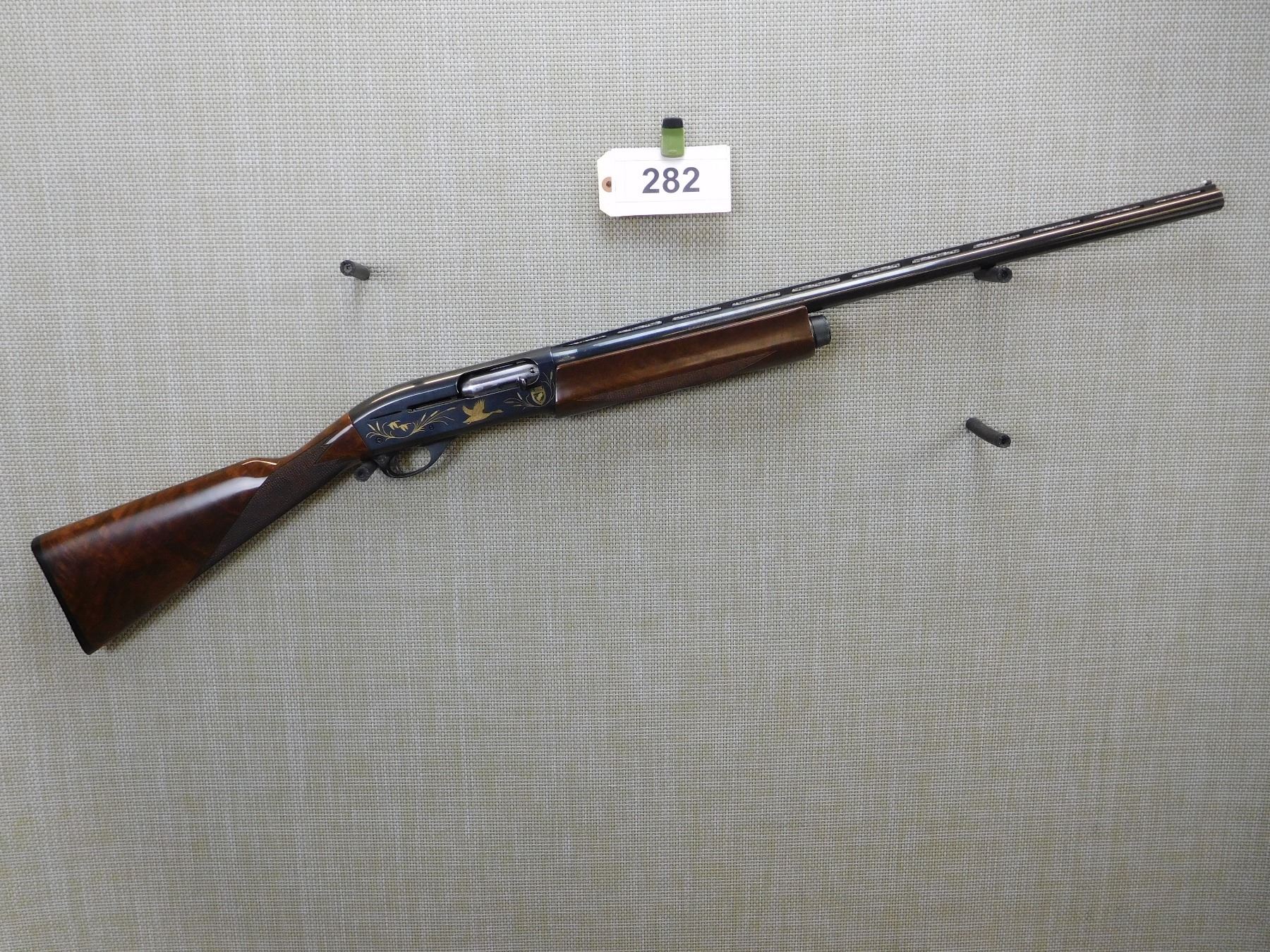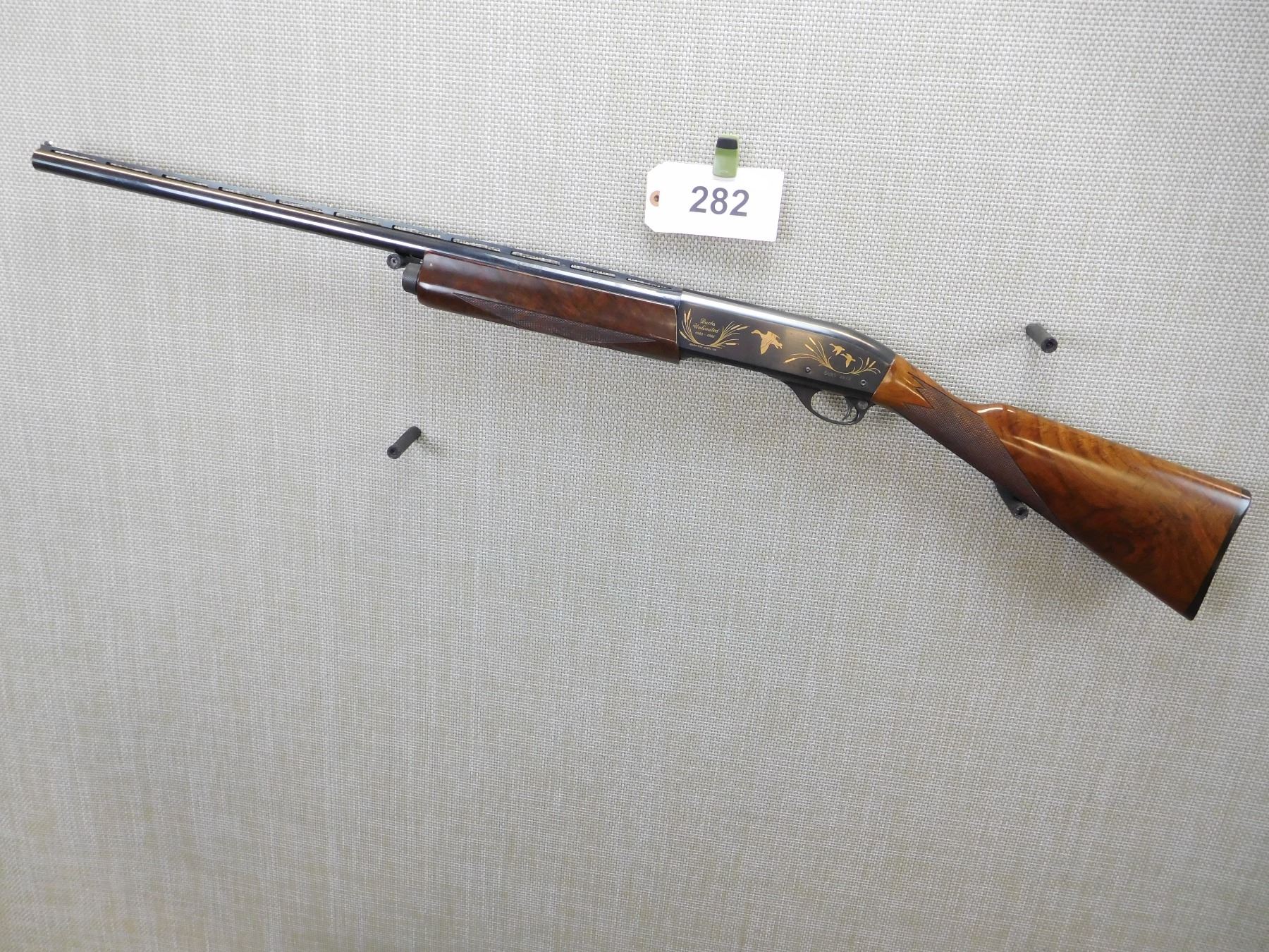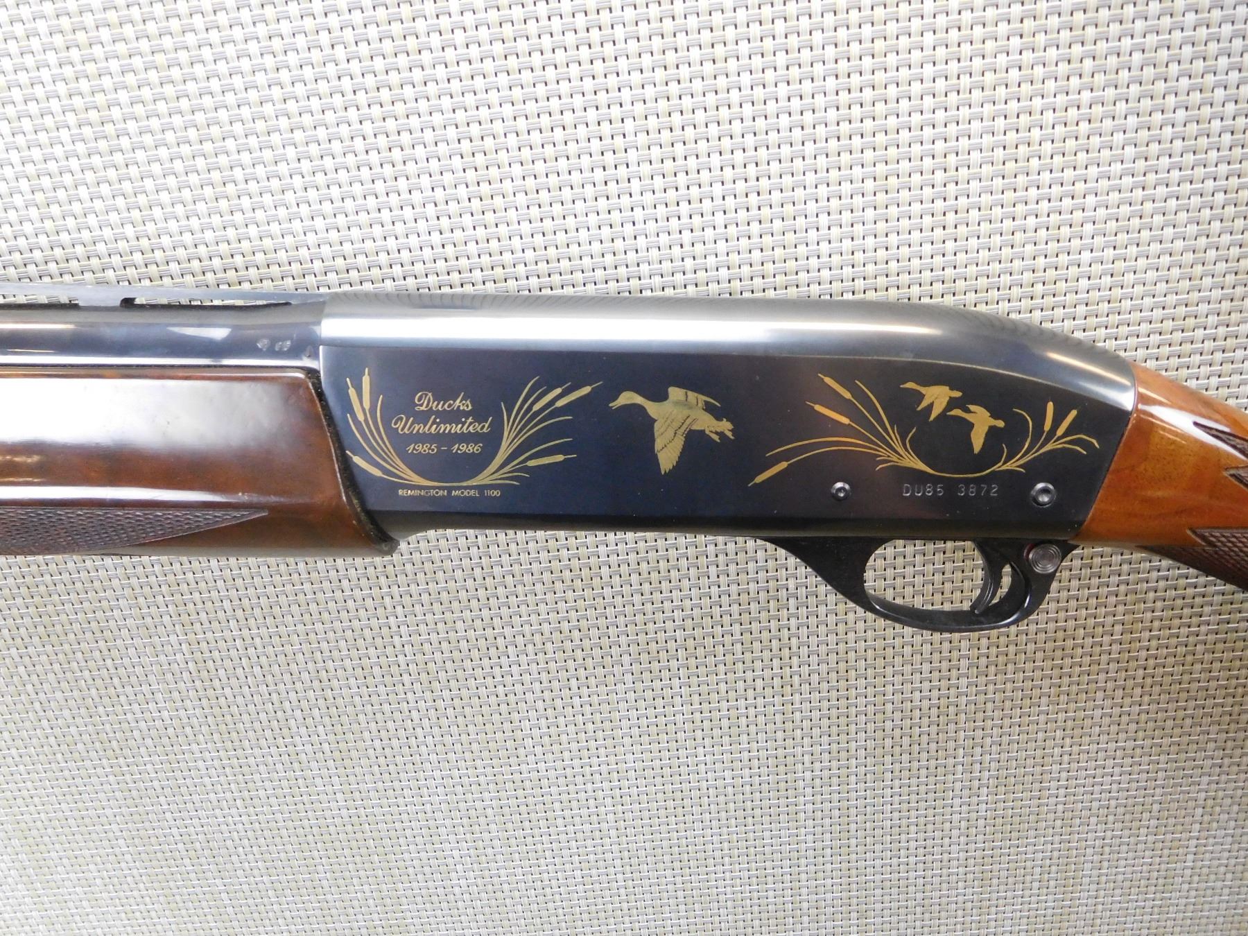 DUCKS UNLIMITED 1985/1986 COMMEMORATIVE MODEL, RAISED VENTED RIB WITH FRONT AND MID BEAD SIGHTS, CHECKERED FOREND AND STRAIGHT GRIP STOCK WITH RUBBER BUTT PAD, HIGH GRADE WALNUT STOCK, DUCK UNLIMITED SCENE ETCHED ON THE RECEIVER, HAS AN IMPROVED CYLINDER SCREW IN CHOKE, BORE IS EXCELLENT , ACTION: SEMI AUTOMATIC SHOTGUN , BARREL LENGTH: 26" , STOCK # 7174 , SERIAL # DU85-3872 , CONDITION: 9/10 , CLASS: CANADIAN NON RESTRICTED CLASS