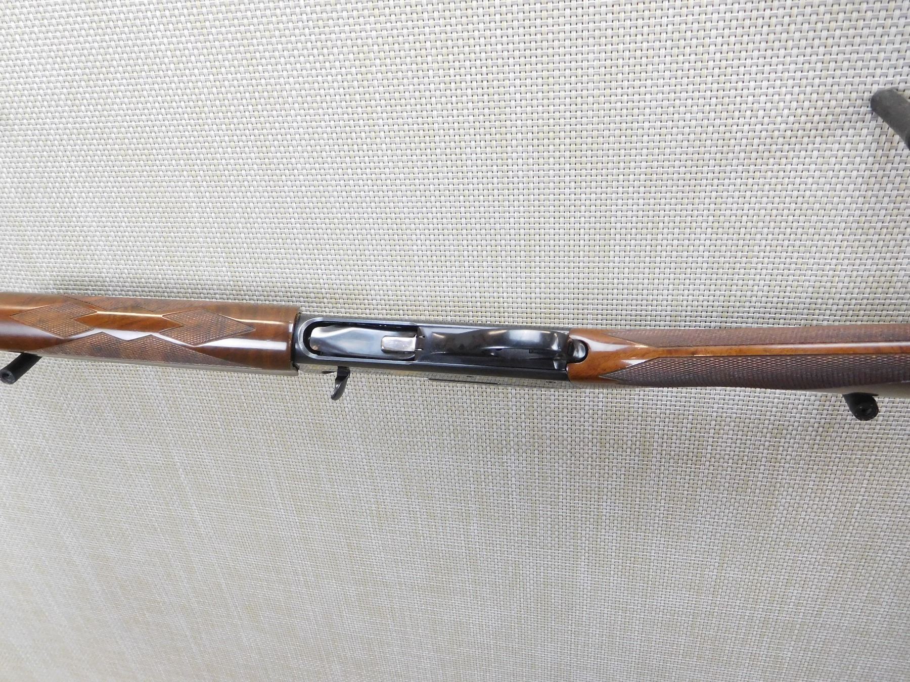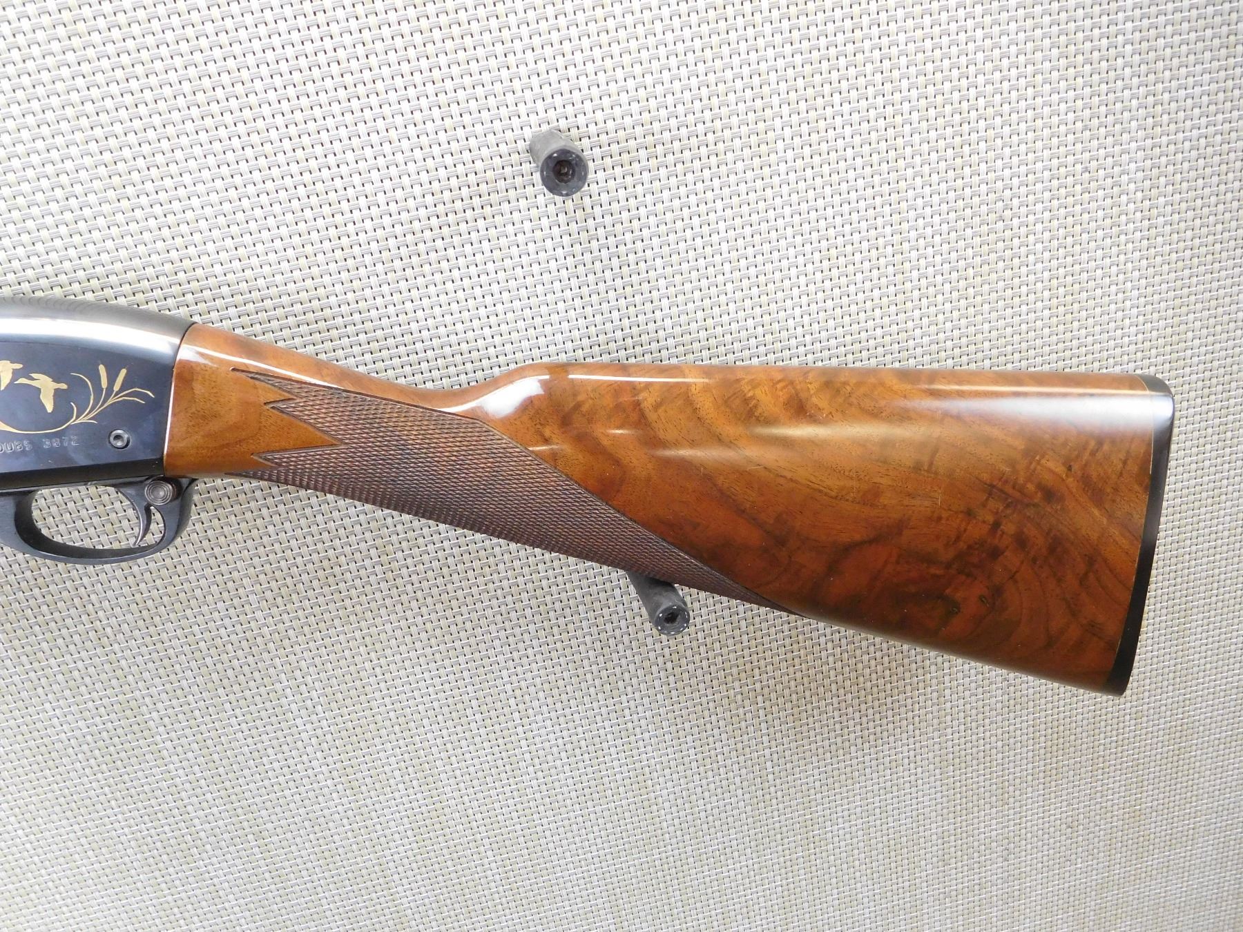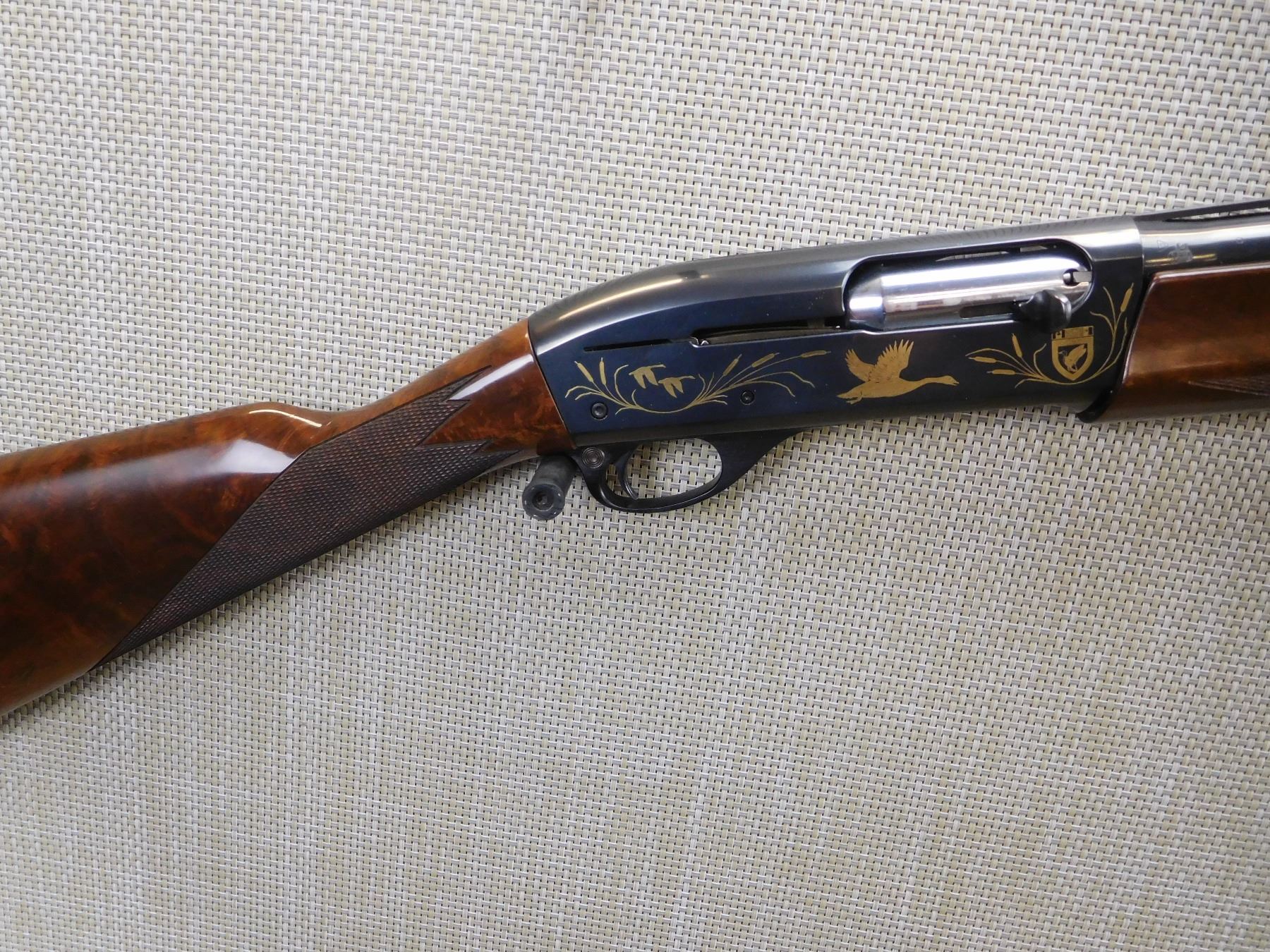 DUCKS UNLIMITED 1985/1986 COMMEMORATIVE MODEL, RAISED VENTED RIB WITH FRONT AND MID BEAD SIGHTS, CHECKERED FOREND AND STRAIGHT GRIP STOCK WITH RUBBER BUTT PAD, HIGH GRADE WALNUT STOCK, DUCK UNLIMITED SCENE ETCHED ON THE RECEIVER, HAS AN IMPROVED CYLINDER SCREW IN CHOKE, BORE IS EXCELLENT , ACTION: SEMI AUTOMATIC SHOTGUN , BARREL LENGTH: 26" , STOCK # 7174 , SERIAL # DU85-3872 , CONDITION: 9/10 , CLASS: CANADIAN NON RESTRICTED CLASS