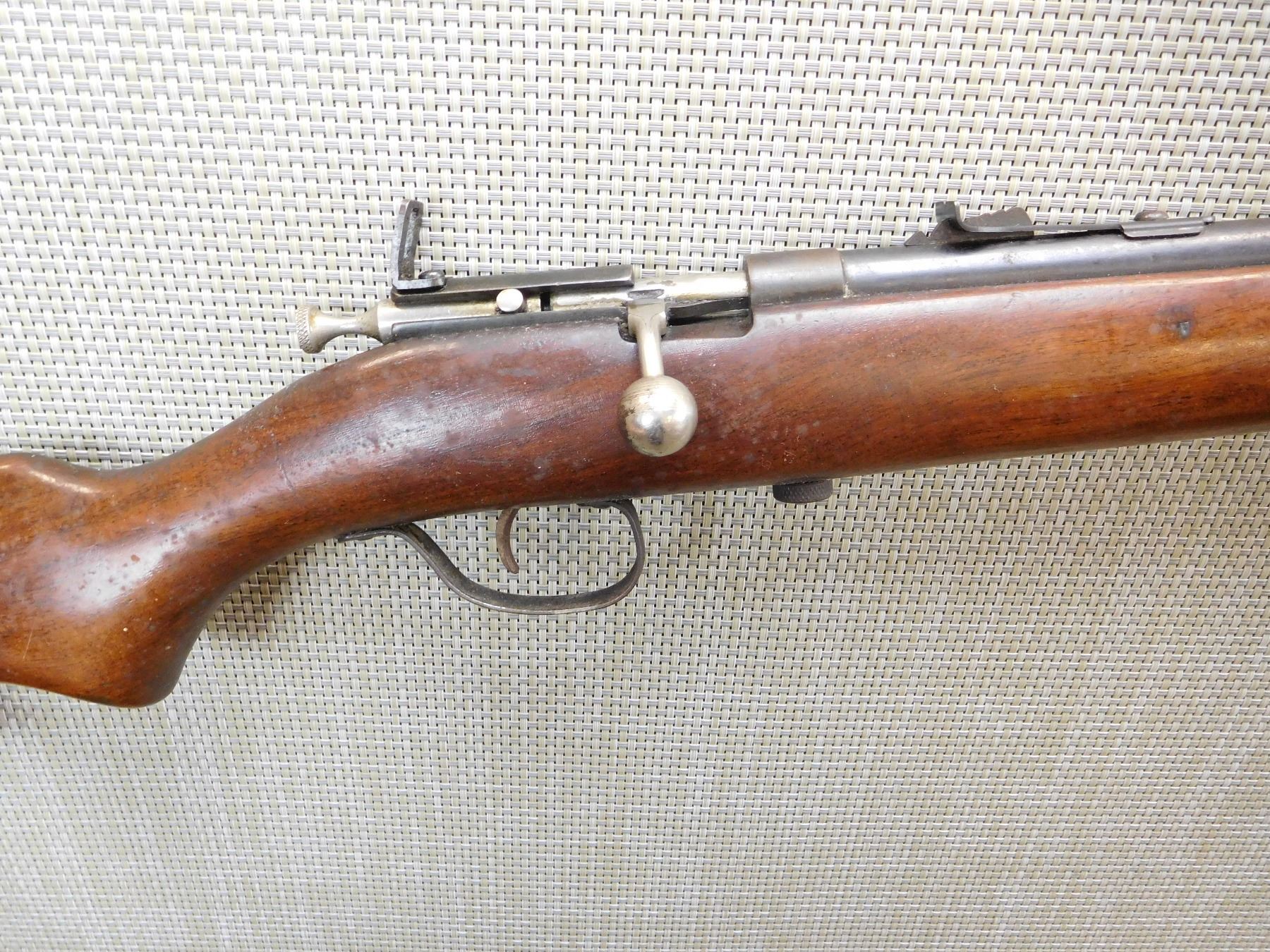 REPLACED FRONT SIGHT, ADJUSTABLE REAR SIGHT, BORE IS DARK, RETAINS ORIGINAL REAR PEEP SIGHT, OVERALL LIGHT RUST , ACTION: BOLT ACTION SINGLE SHOT RIFLE , BARREL LENGTH: 27" , STOCK # 7280 , SERIAL # N/A , CONDITION: 5/10 , CLASS: CANADIAN NON RESTRICTED CLASS