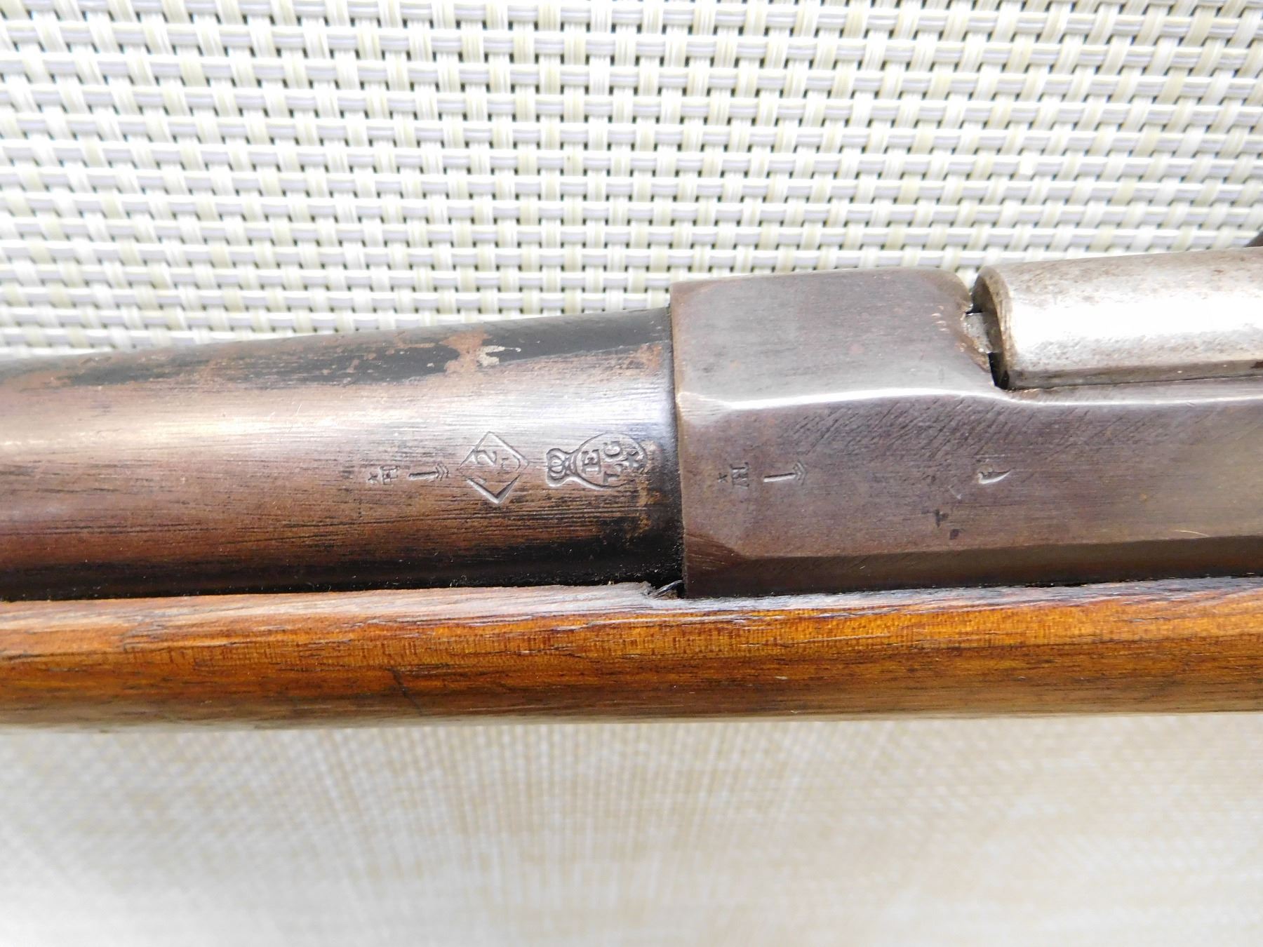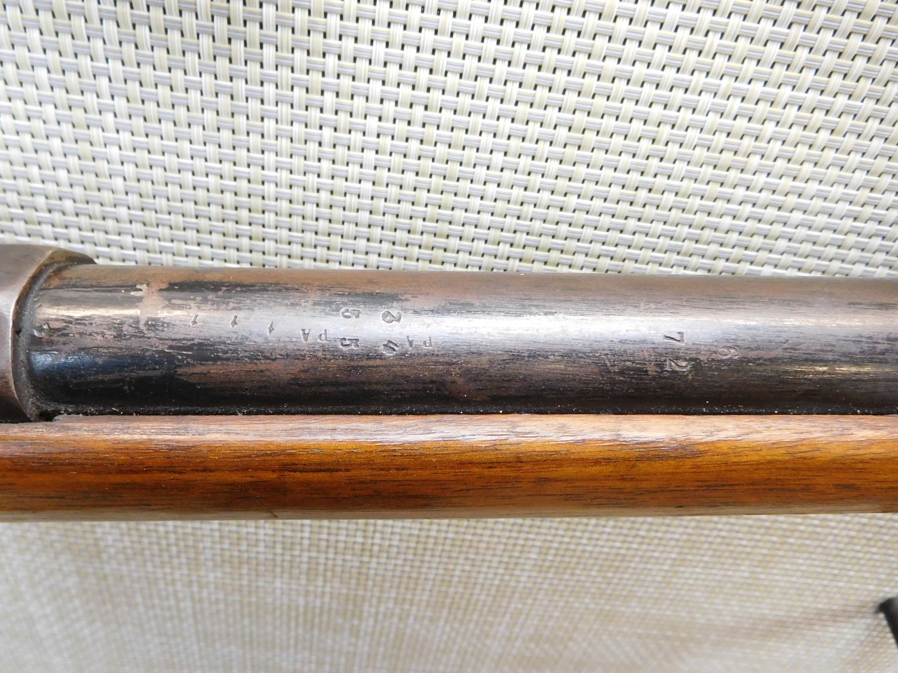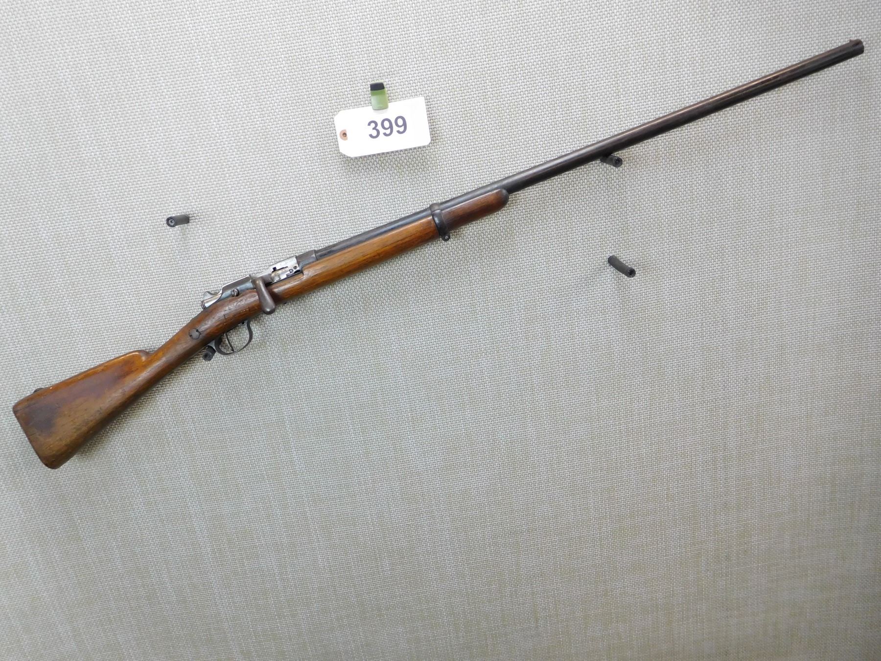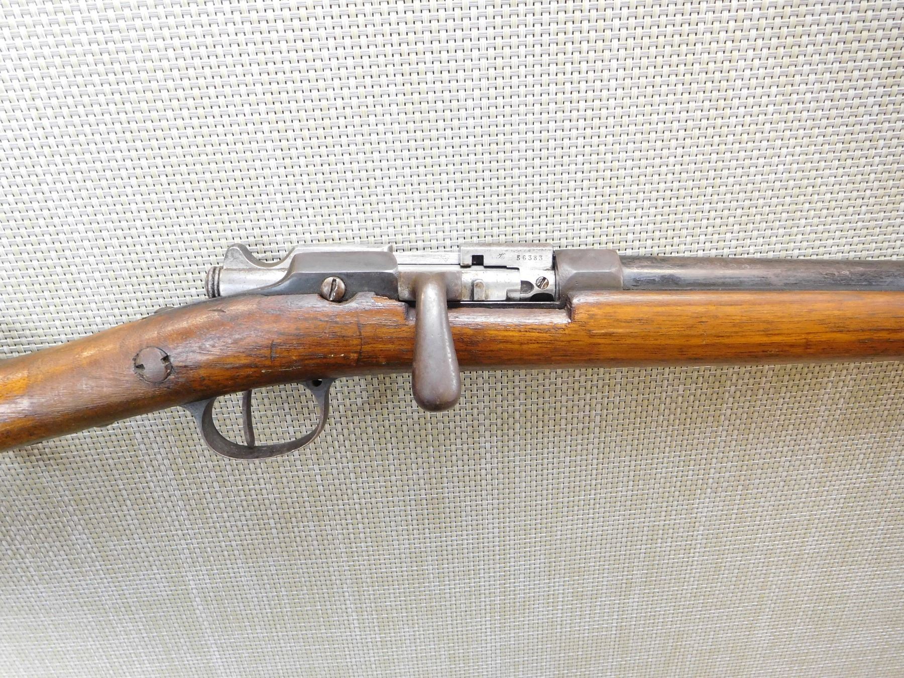 BEAD FRONT SIGHT, GOOD BORE, SPORTERIZED MILITARY STOCK, STEEL BUTT PLATE, WITH FRENCH PROOF MARKS ON THE BUTT, BUT BELGIAN PROOFS ON THE BARREL, CRACKED STOCK AT THE WRIST , ACTION: SINGLE SHOT BOLT ACTION SHOTGUN , BARREL LENGTH: 30" , STOCK # 7291 , SERIAL # N/A , CONDITION: 5/10 , CLASS: CANADIAN NON RESTRICTED CLASS