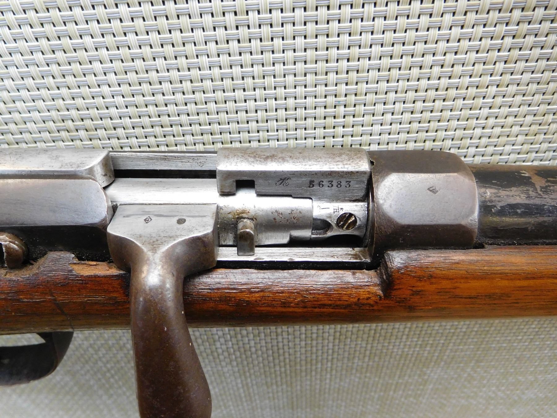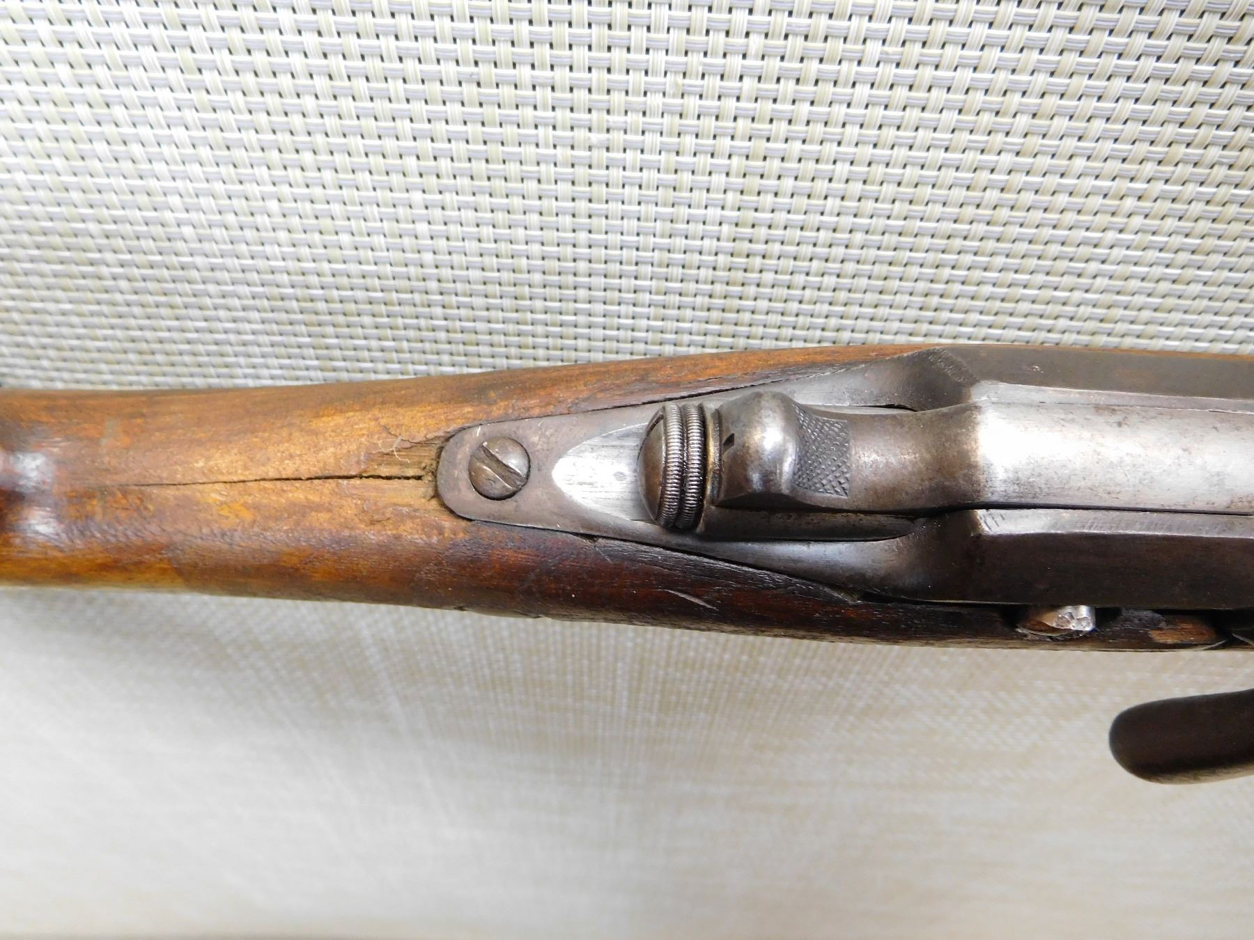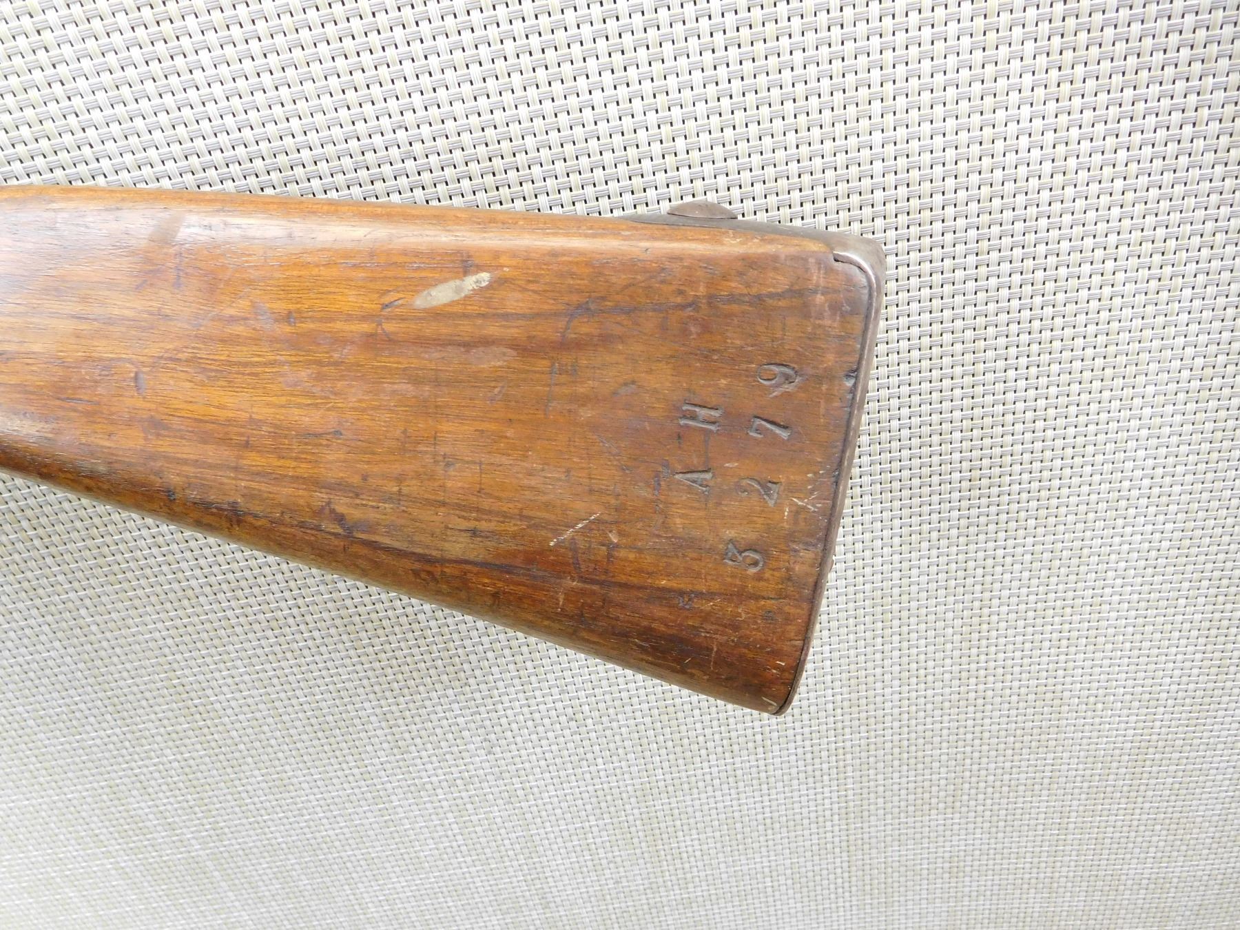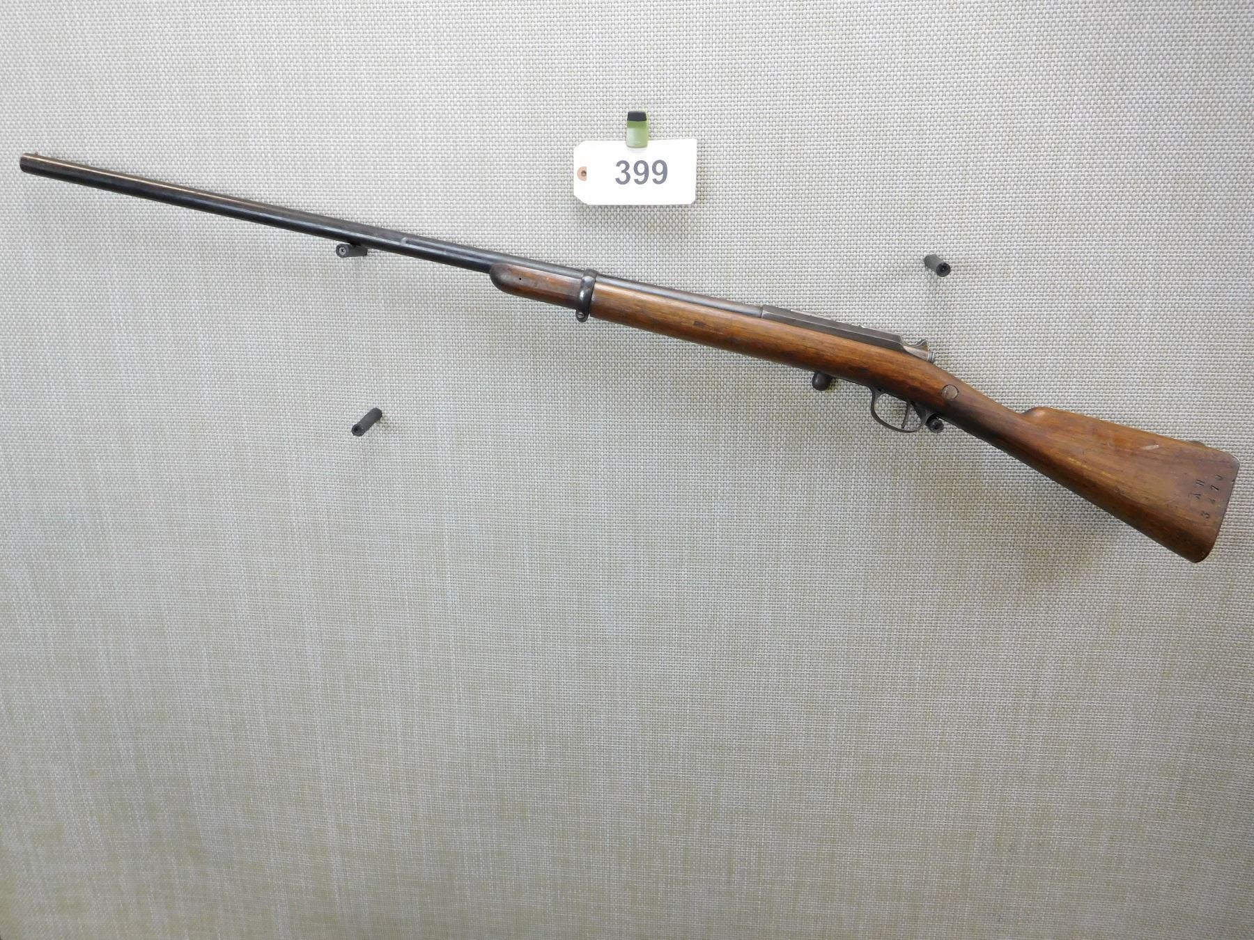 BEAD FRONT SIGHT, GOOD BORE, SPORTERIZED MILITARY STOCK, STEEL BUTT PLATE, WITH FRENCH PROOF MARKS ON THE BUTT, BUT BELGIAN PROOFS ON THE BARREL, CRACKED STOCK AT THE WRIST , ACTION: SINGLE SHOT BOLT ACTION SHOTGUN , BARREL LENGTH: 30" , STOCK # 7291 , SERIAL # N/A , CONDITION: 5/10 , CLASS: CANADIAN NON RESTRICTED CLASS