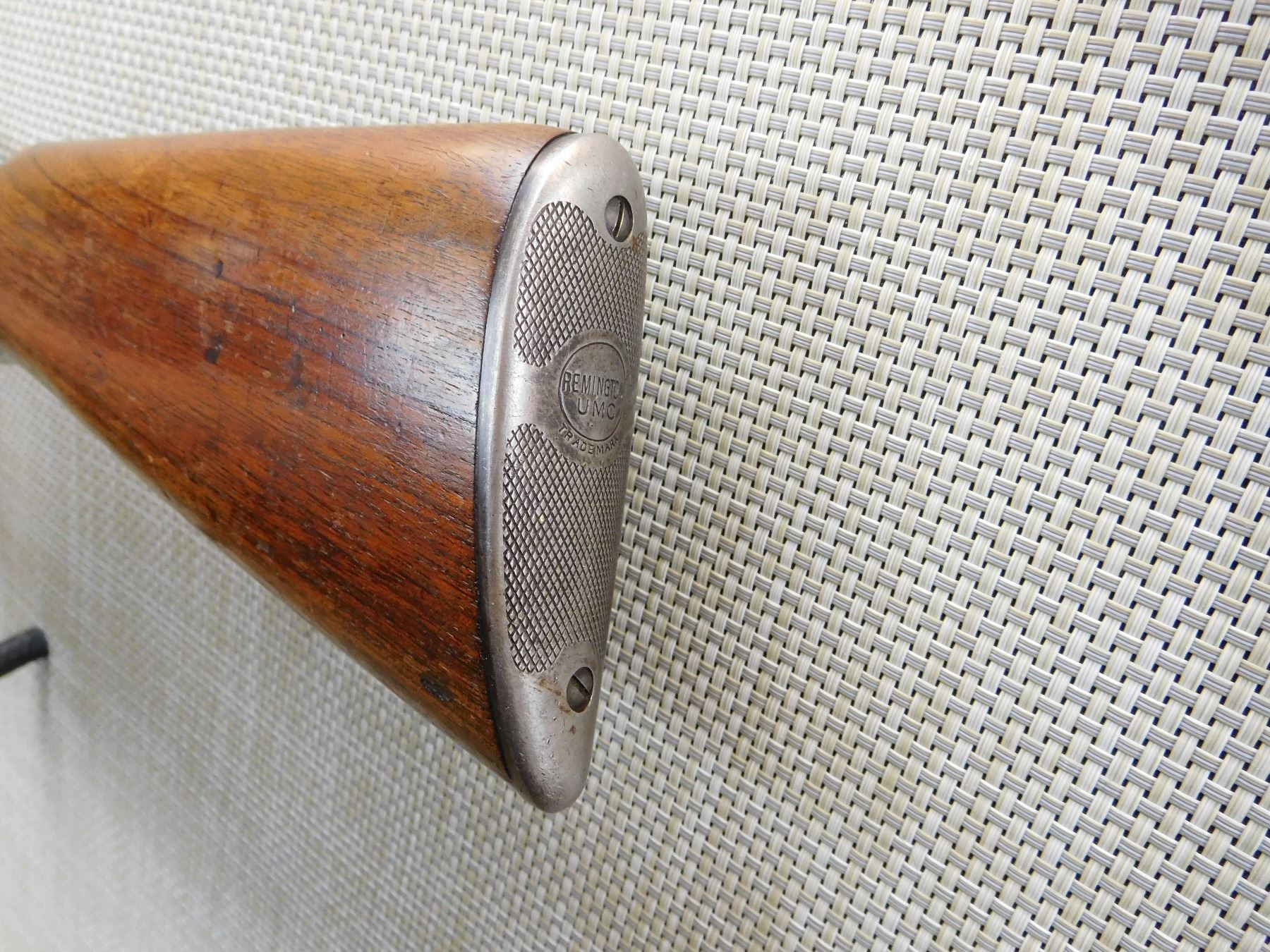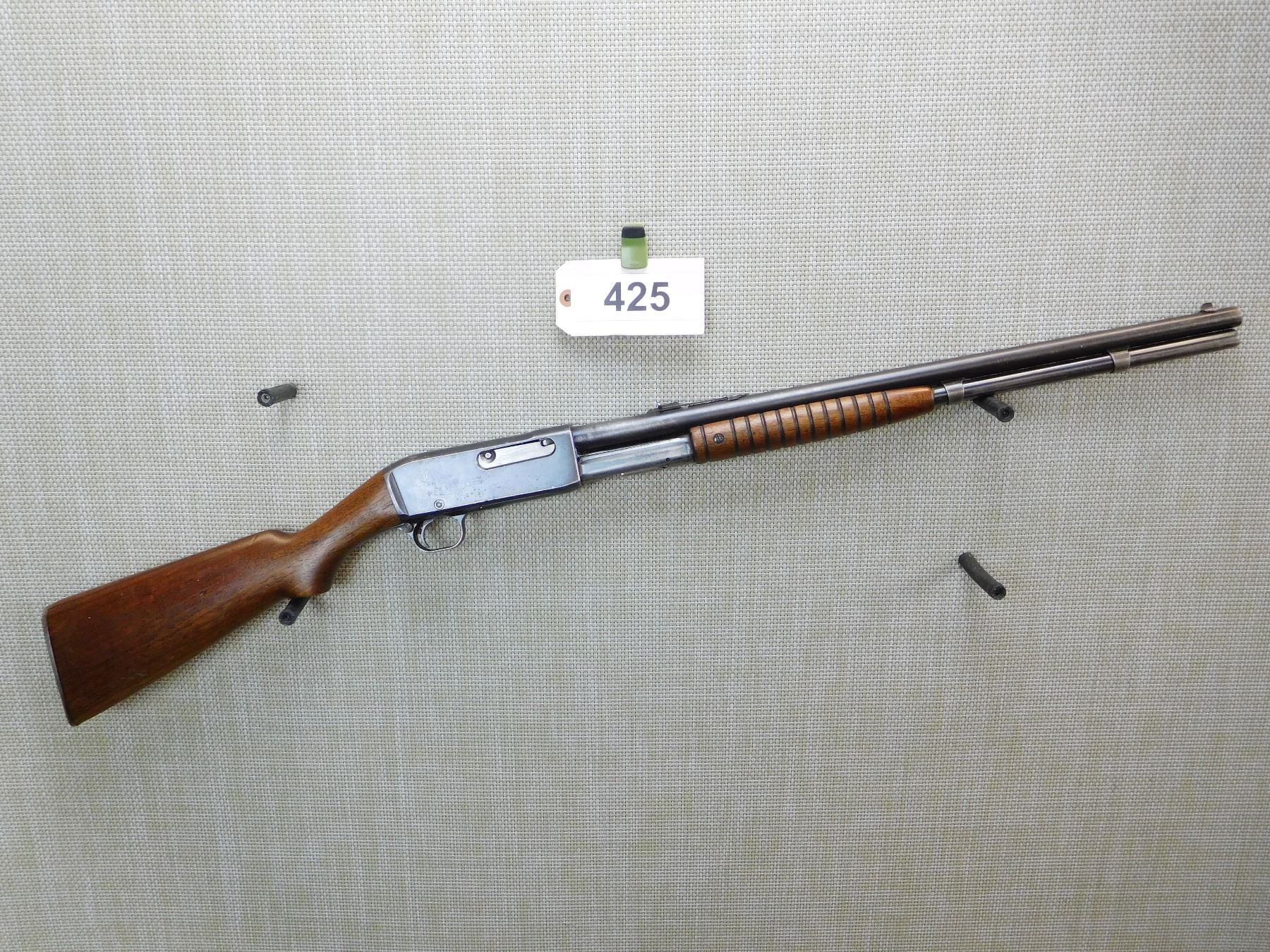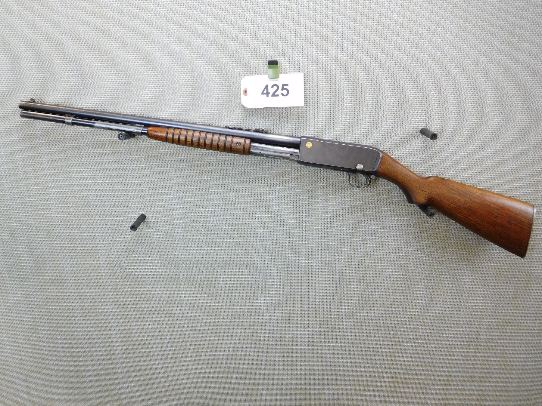 CANADIAN PROOF MARKS (DC) ON THE BARREL, BORE IS VERY GOOD, DOVETAIL FRONT AND ADJUSTABLE REAR SIGHTS, STEEL BUTT PLATE , ACTION: PUMP ACTION RIFLE , BARREL LENGTH: 22 1/2" , STOCK # 7317 , SERIAL # 24110 , CONDITION: 6/10 , CLASS: CANADIAN NON RESTRICTED CLASS