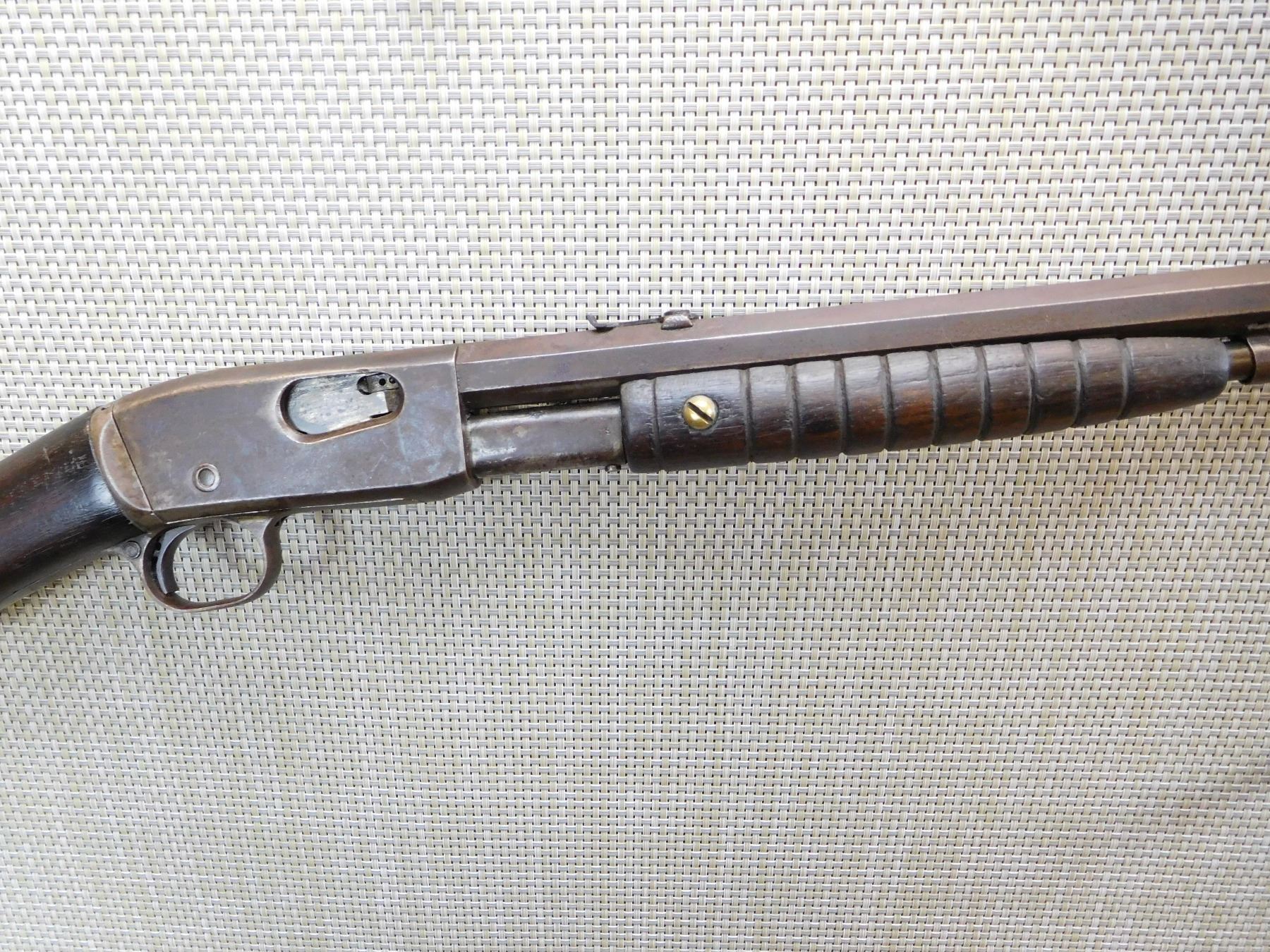 TAKE DOWN MODEL, 1909-1936, OCTAGONAL BARREL, DOVETAIL FRONT SIGHT AND ADJUSTABLE REAR SIGHT MISSING THE ELEVATOR SCREW, DARK BORE, LIGHTLY PITTED OVERALL, REPLACED SCREWS IN THE FOREND, ORIGINAL CRESCENT BUTT PLATE , ACTION: PUMP ACTION RIFLE , BARREL LENGTH: 24" , STOCK # 7349 , SERIAL # 279463 , CONDITION: 5/10 , CLASS: CANADIAN NON RESTRICTED CLASS