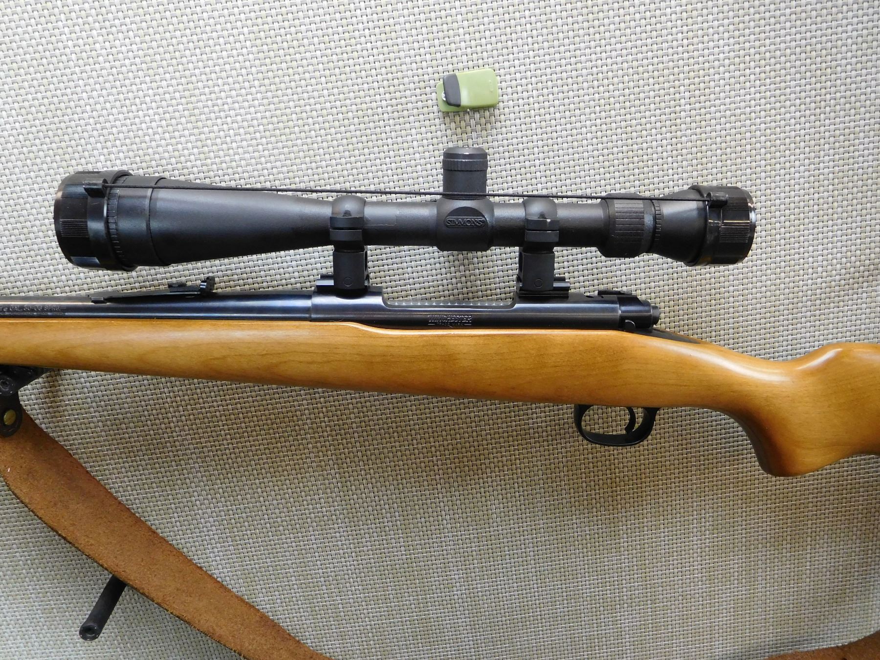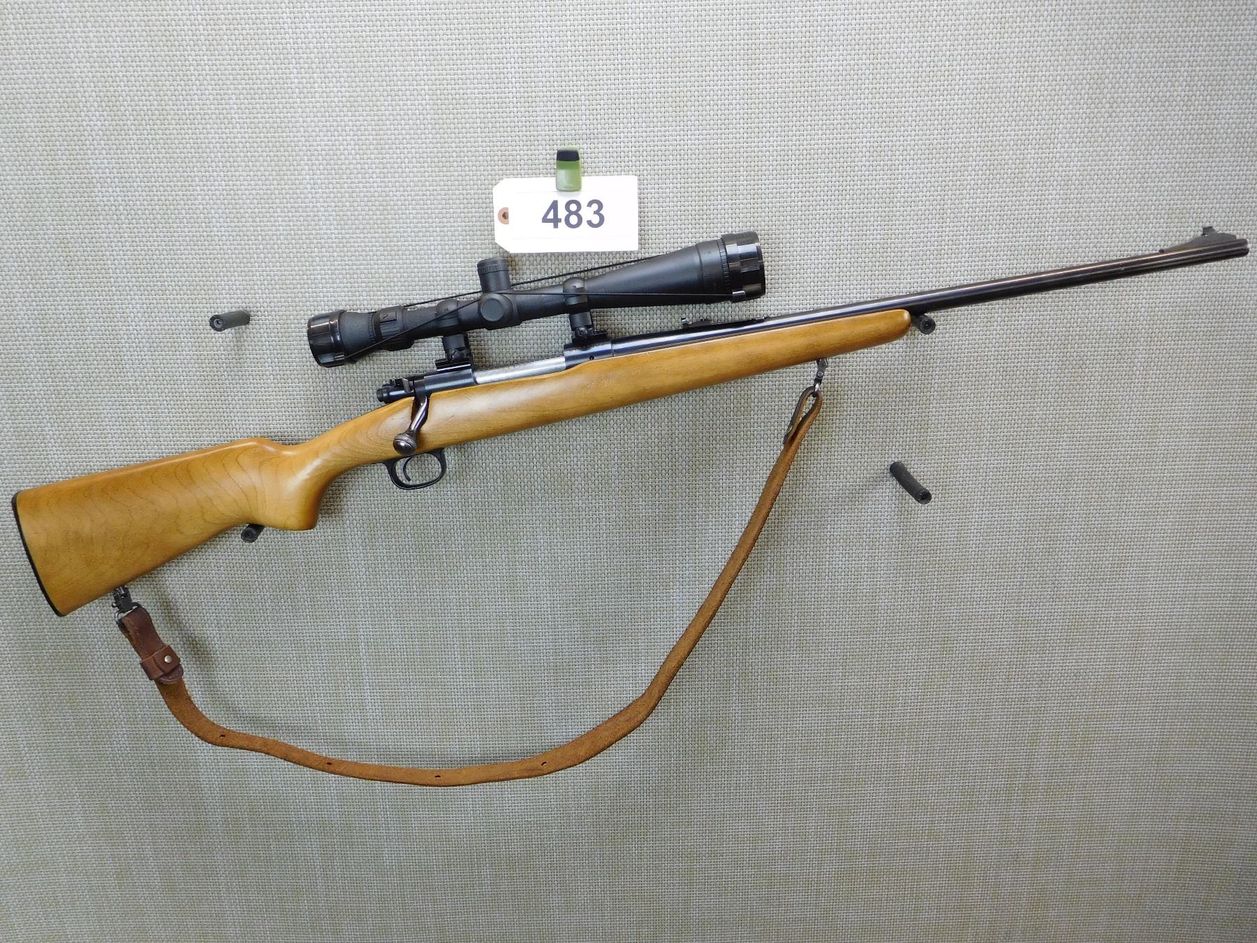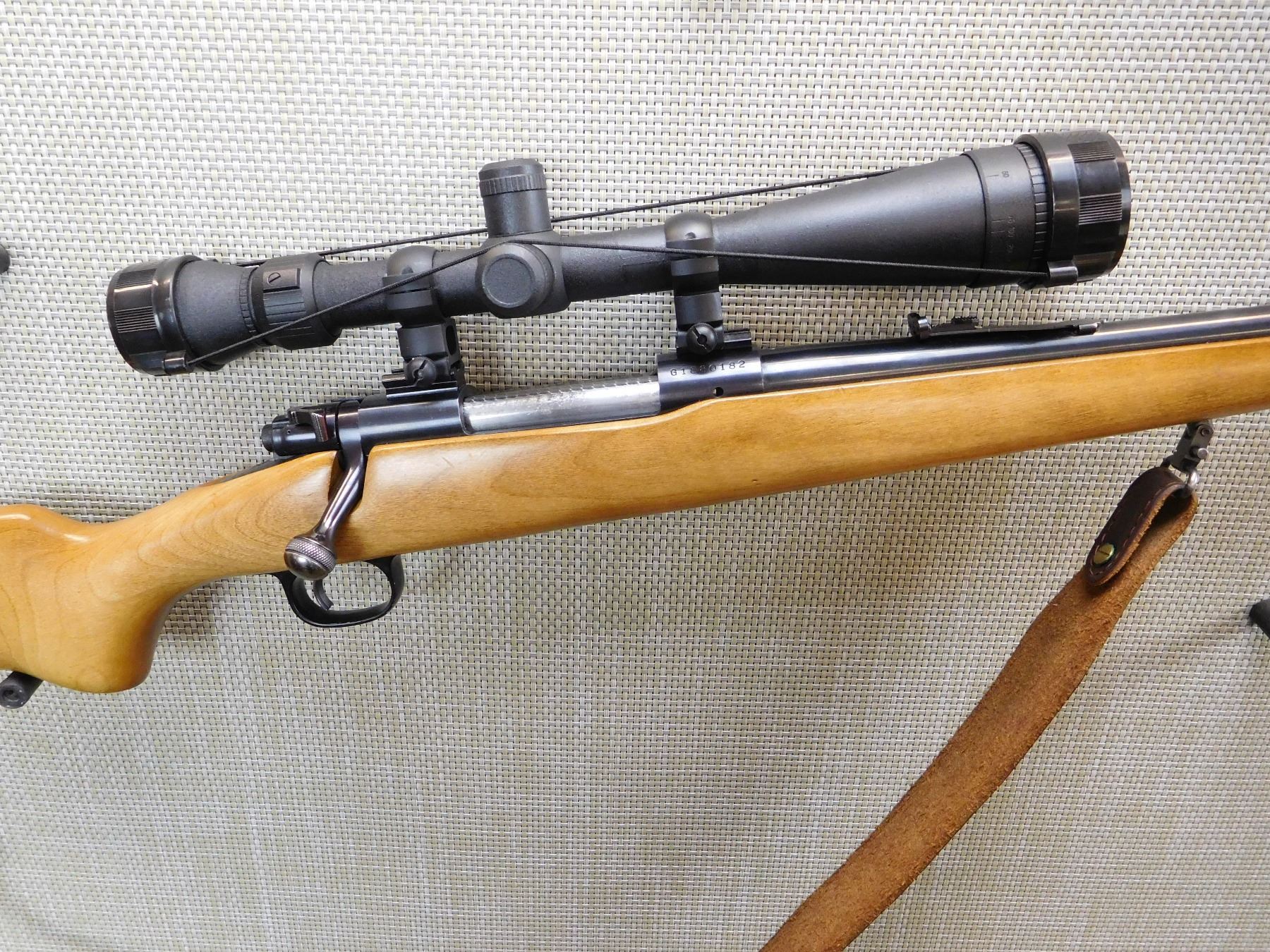 MANUFACTURED AFTER 19886, HAS A SIMONS 6 - 24 POWER SCOPE, DOVETAIL RAMP FRONT AND ADJUSTABLE REAR SIGHT, BORE IS EXCELLENT, DETACHABLE SLING SWIVELS WITH LEATHER SLING, PLASTIC BUTT PLATE , ACTION: BOLT ACTION RIFLE , BARREL LENGTH: 22" , STOCK # 7375 , SERIAL # G1880182 , CONDITION: 8/10 , CLASS: CANADIAN NON RESTRICTED CLASS