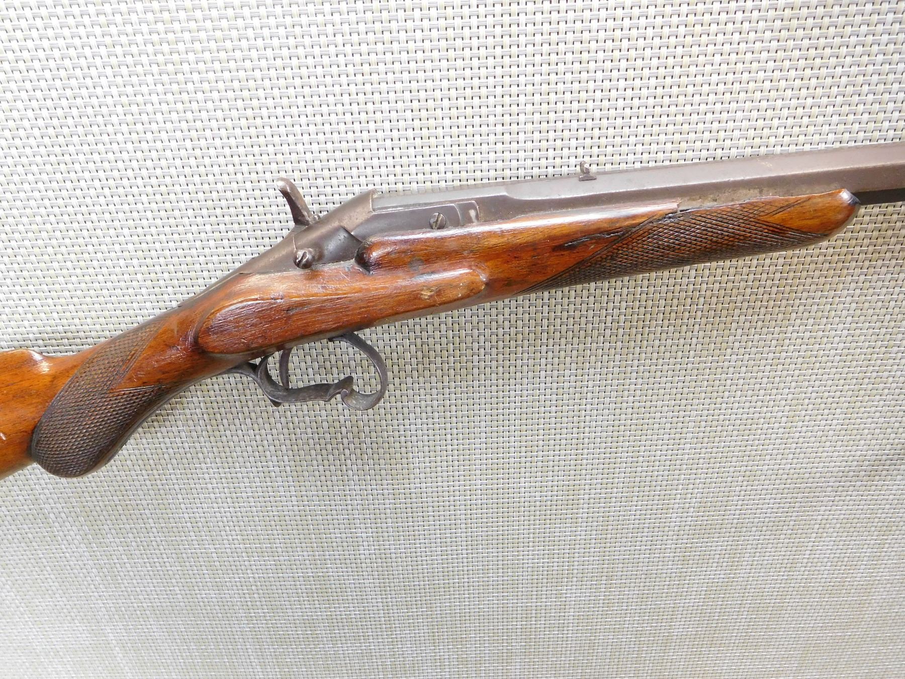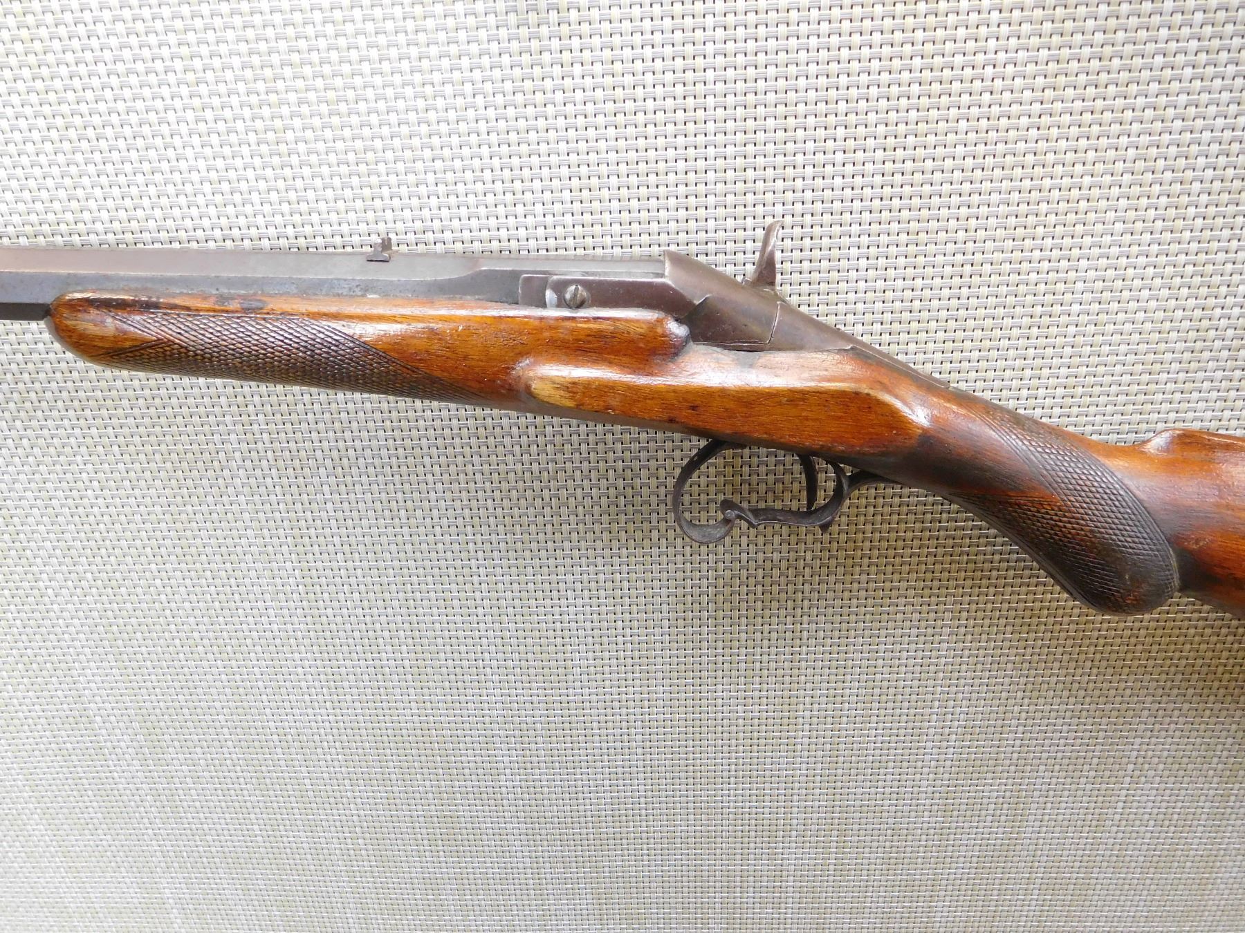 PRE 1893 PROOF MARK, FLOBERT ACTION, DOVETAIL FRONT AND FIXED REAR SIGHT, REPLACED OPENING ACTION LEVER WITH A SCREW, MISSING TANG SCREW, STEEL BUTT PLATE, BULL OCTAGONAL BARREL, FANCY TRIGGER GUARD, BORE IS DARK , ACTION: SINGLE SHOT , BARREL LENGTH: 24 1/2" , STOCK # 7381 , SERIAL # 788 , CONDITION: 4/10 , CLASS: CANADIAN NON RESTRICTED CLASS