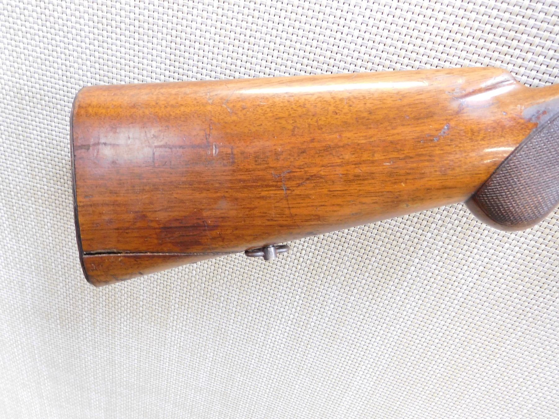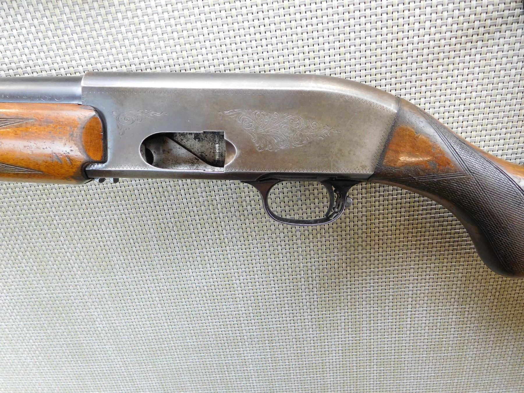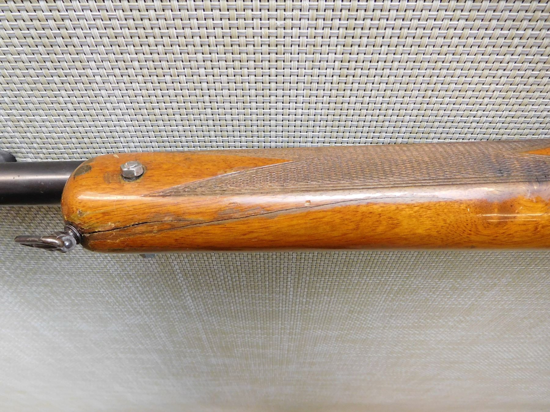 CRACKED FOREND WITH BOLT ADDED, CHECKERED FOREND AND CHECKERED PISTOL GRIP STOCK WITH HARD RUBBER BUTT PAD, STOCK IS CRACKED AT THE TOE, WEAK OR MISSING ACTION RETURN SPRING, VENTED BARREL, BEAD FRONT SIGHT, FIXED FULL CHOKE, GOOD BORE , ACTION: SEMI AUTOMATIC SHOTGUN , BARREL LENGTH: 29 1/2" , STOCK # 7393 , SERIAL # 855 , CONDITION: 3/10 , CLASS: CANADIAN NON RESTRICTED CLASS