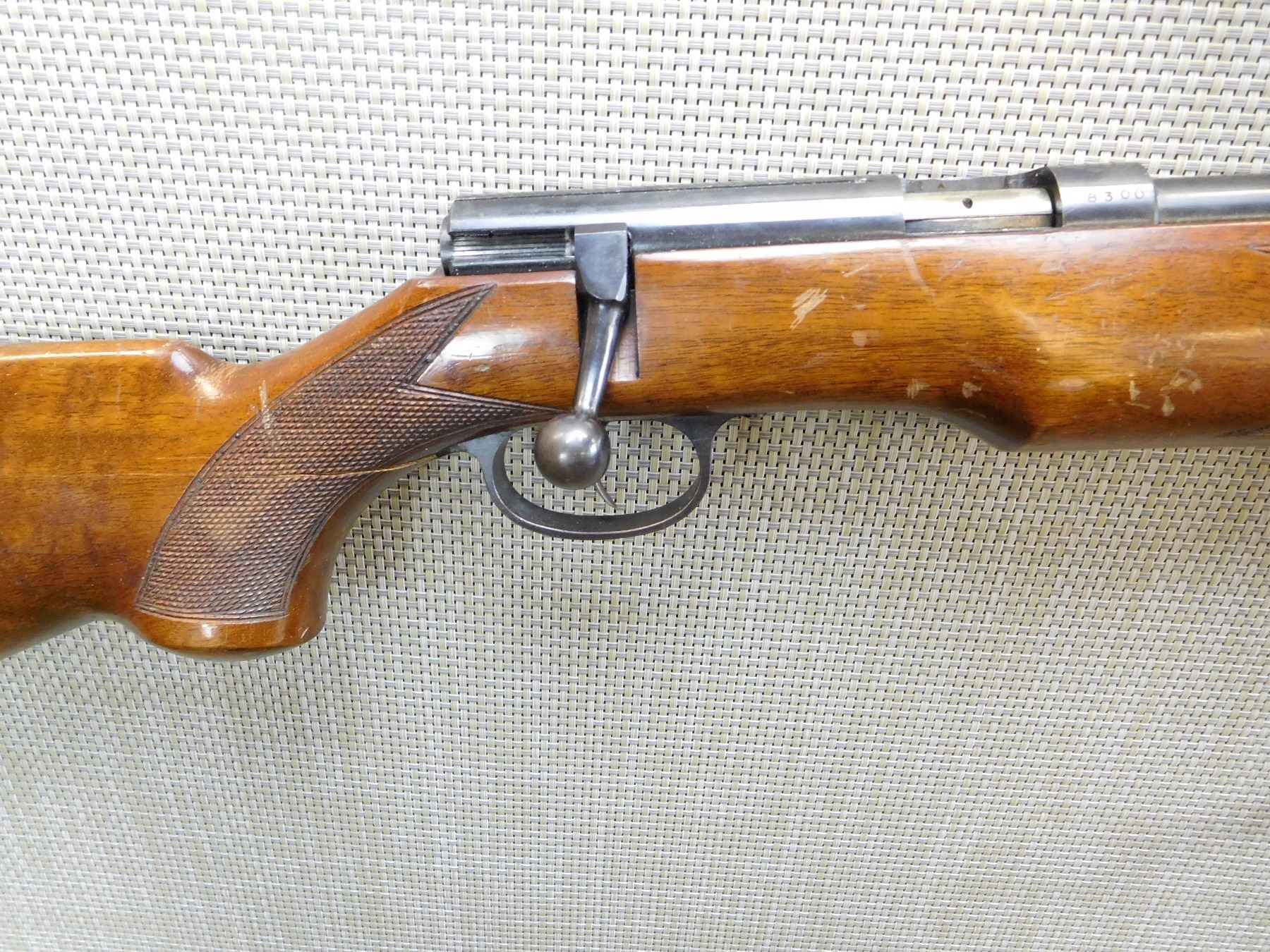 HOODED FRONT AND ABSENT REAR SIGHT, BORE IS VERY GOOD, ADJUSTABLE FRONT SLING SWIVELS, MONTE CARLO BUTT STOCK, JAGER BUTT PLATE, ADJUSTABLE TRIGGER, BUTT STOCK HAS LARGE CRACK BEHIND THE TRIGGER GUARD , ACTION: SINGLE SHOT TARGET RIFLE , BARREL LENGTH: 26" , STOCK # 7419 , SERIAL # 8300 , CONDITION: 5/10 , CLASS: CANADIAN NON RESTRICTED CLASS