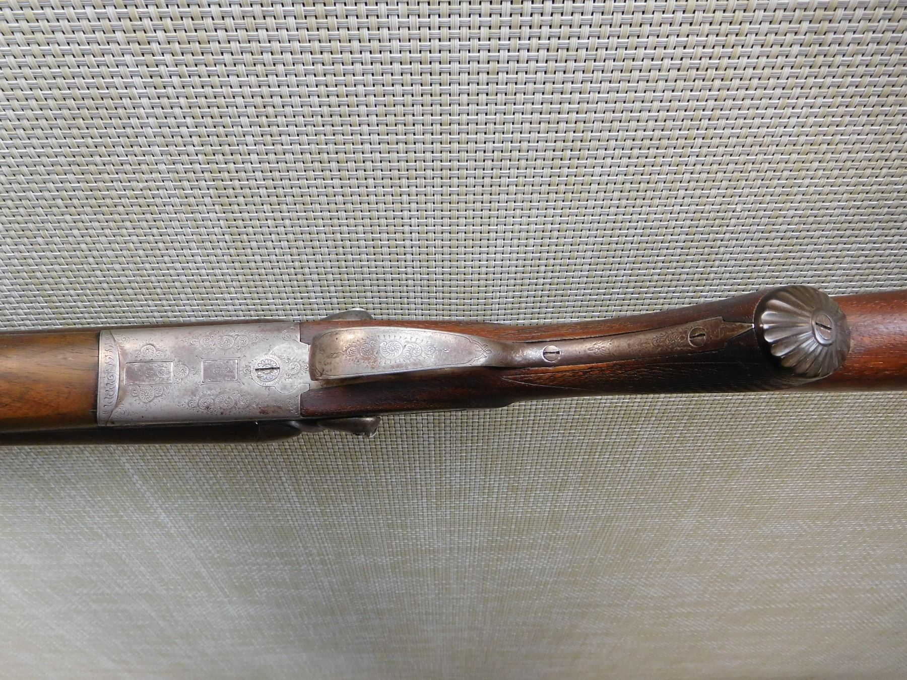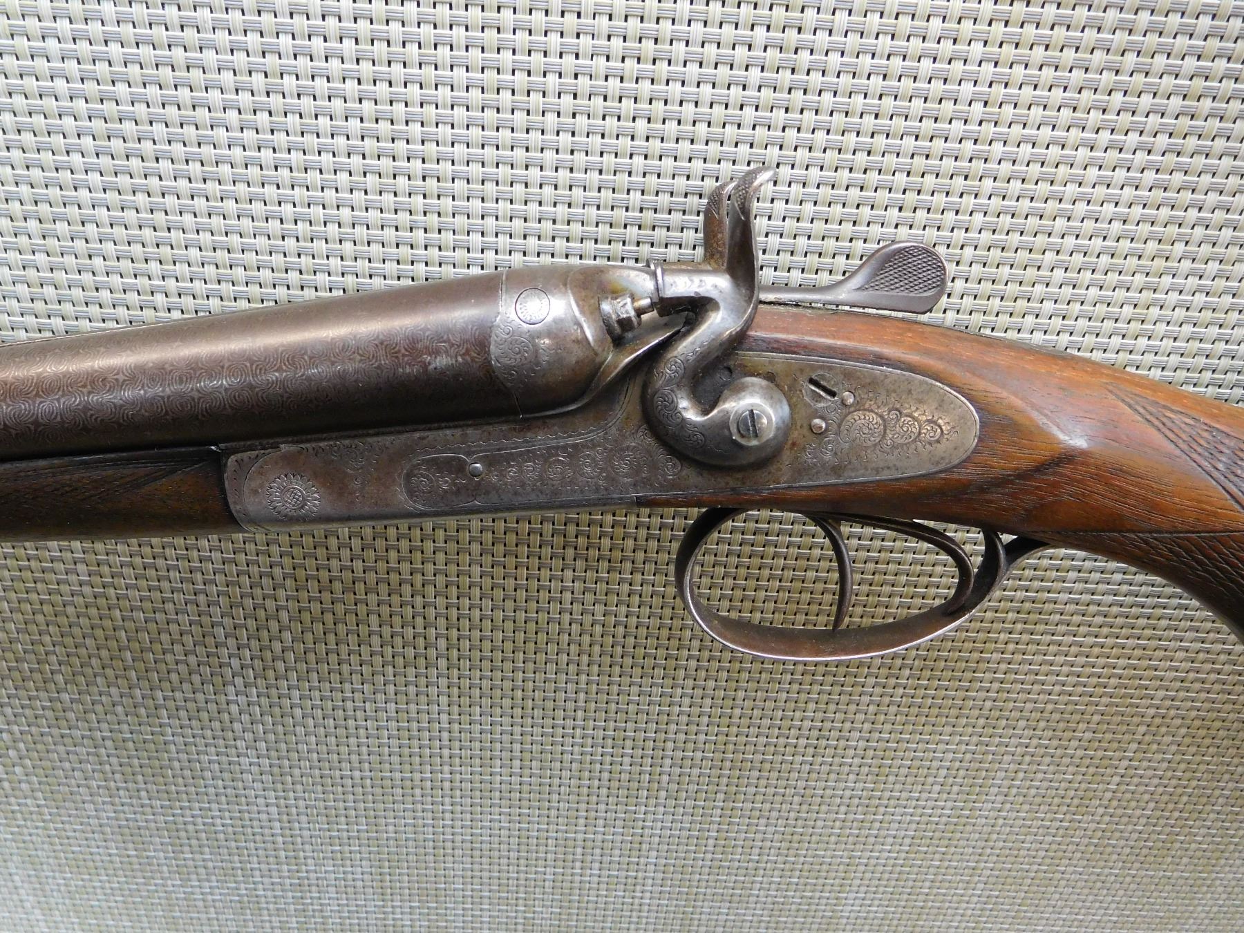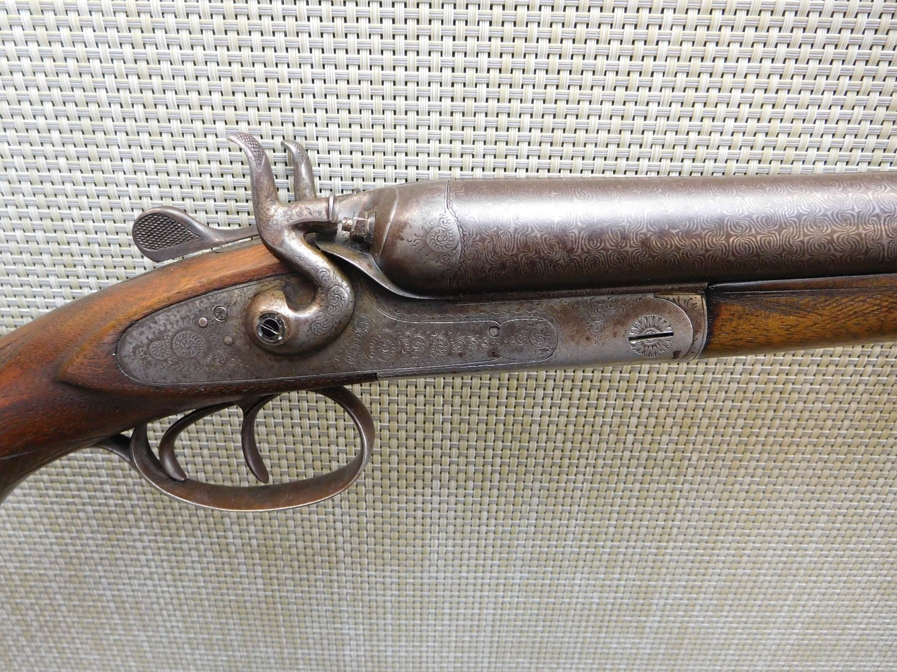 BORES ARE VERY GOOD, FIXED MODIFIED AND CYLINDER BORE CHOKES, CHECKERED FOREND AND CHECKERED CAPPED PISTOL GRIP BUTT STOCK WITH PLASTIC BUTT PLATE, MISSING THE REAR SLING SWIVEL, RICHLY ENGRAVED RECEIVER, DAMASCUS BARREL, BEAD FRONT SIGHT , ACTION: SIDE BY SIDE DOUBLE HAMMERS, DOUBLE TRIGGERS , BARREL LENGTH: 29 1/2" , STOCK # 7434 , SERIAL # 649 , CONDITION: 6/10 , CLASS: CANADIAN NON RESTRICTED CLASS
