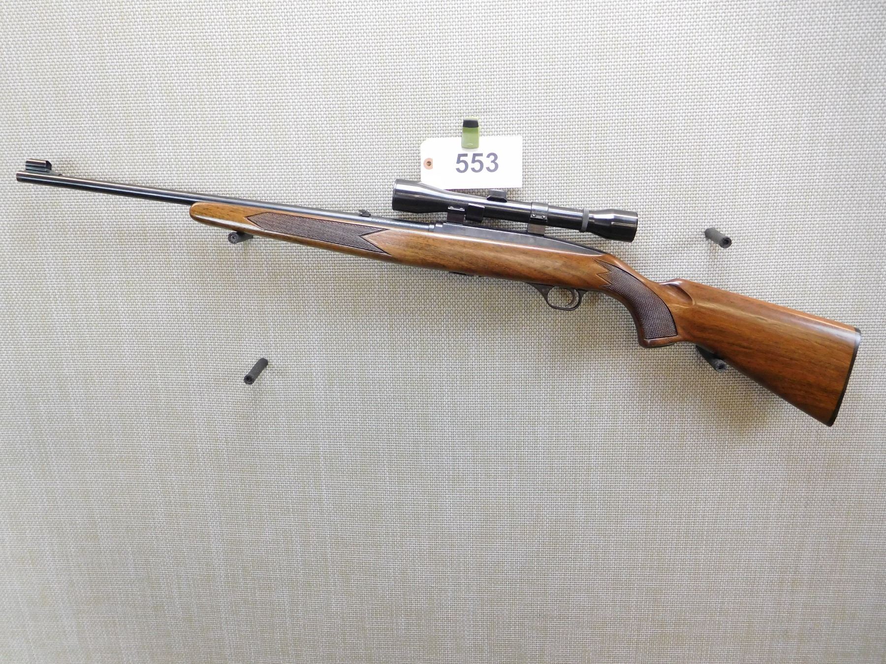 COMES WITH MAGAZINE, CHECKERED PISTOL GRIP AND FORESTOCK, FOLDING LEAF AND HOODED BLADE FRONT SIGHT, WEAVER MARKSMAN 4 X SCOPE, HARD RUBBER BUTT PLATE, BORE IS GOOD , ACTION: SEMI AUTOMATIC RIFLE , BARREL LENGTH: 560MM , STOCK # 7444 , SERIAL # J054837 , CONDITION: 8/10 , CLASS: CANADIAN NON RESTRICTED CLASS