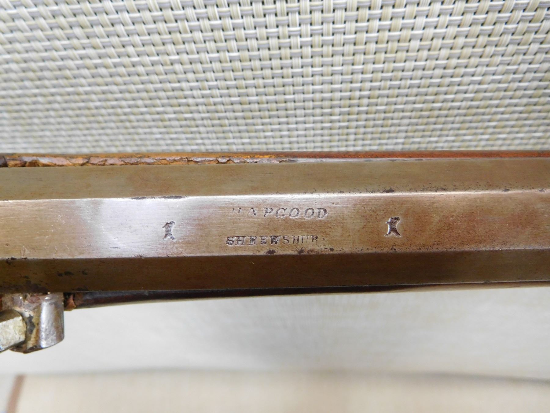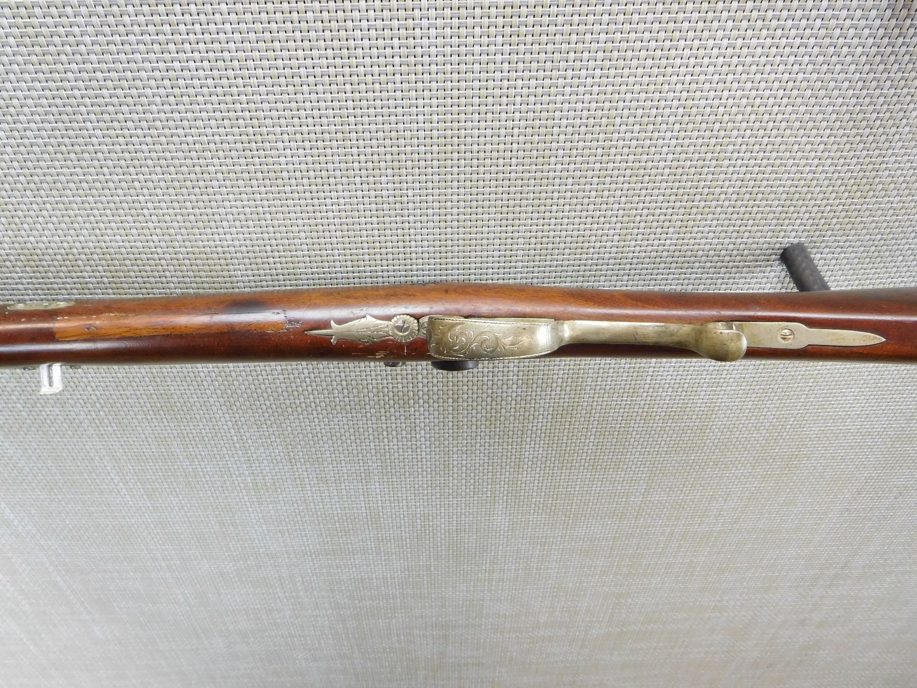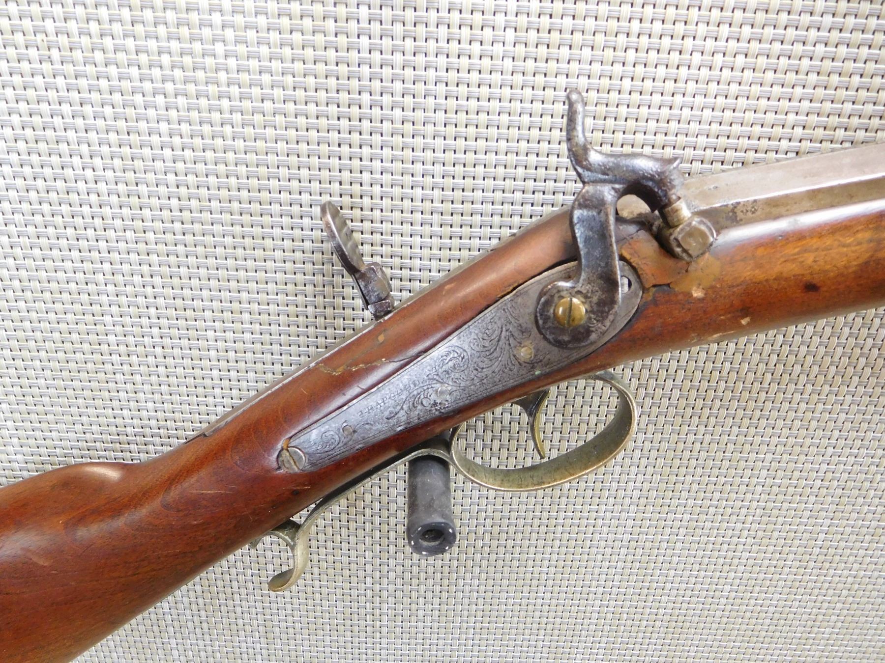 STAMPED SHREWSHUR ON THE TOP OF THE BARREL, OCTAGONAL BARREL, GERMAN SILVER FURNITURE AND PATCH BOX, RICHLY ENGRAVED BACK ACTION LOCK, RAM ROD, DOVETAIL FRONT AND ADJUSTABLE REAR AND PEEP SIGHT, REPLACED TRANSVERSE WEDGE, DARK RIFLED BORE , ACTION: SINGLE SHOT , BARREL LENGTH: 29" , , , CONDITION: ANTIQUE 5/10 , CLASS: CANADIAN ANTIQUE CLASS
